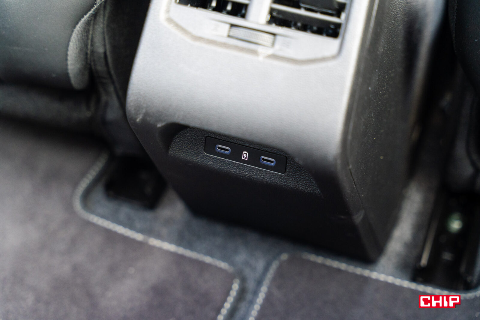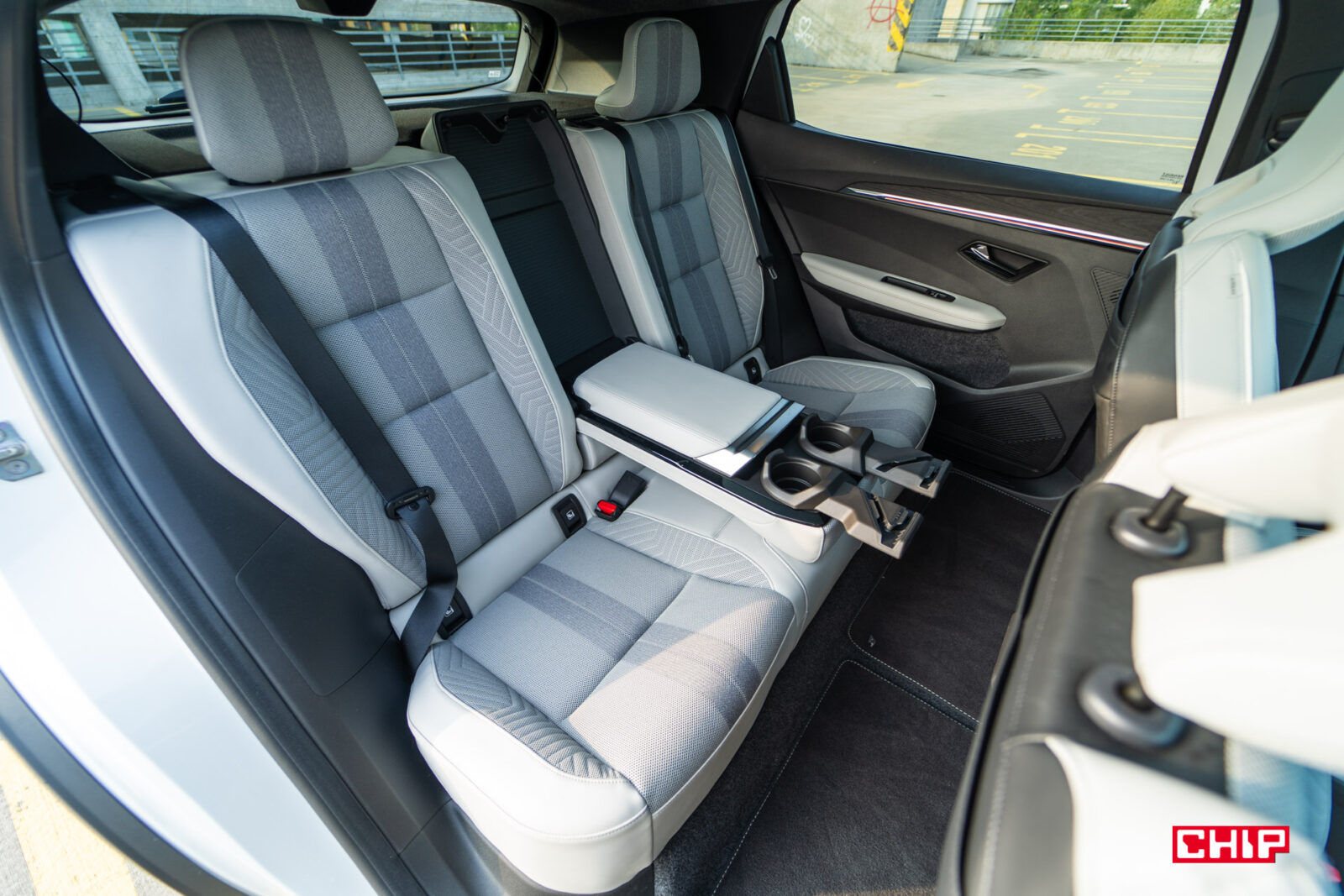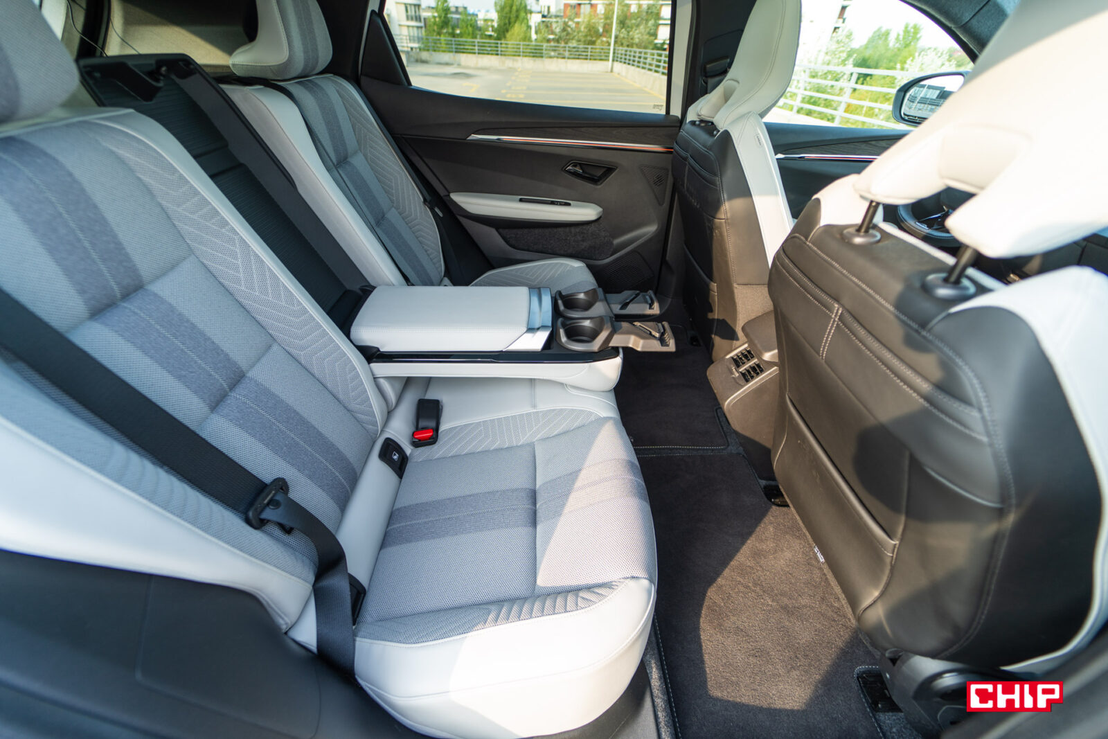 Bardzo nietypowy jest też podłokietnik na tylnej kanapie. Teoretycznie 3-osobowej, ale środkowe miejsce jest tak zrobione, że zniechęca do siadania. W podłokietniku znajdują się porty USB-C oraz obracane uchwyty na napoje. Jest tu też miejsce do poprowadzenia kabla, a po obróceniu uchwyty można w nim umieścić smartfon lub tablet w pozycji stojącej. Może dziwnie wyglądające, ale praktyczne rozwiązanie. Na tylnej kanapie podróżuje się bardzo wygodnie, a na brak miejsca na nogi i nad głową nikt nie powinien narzekać.