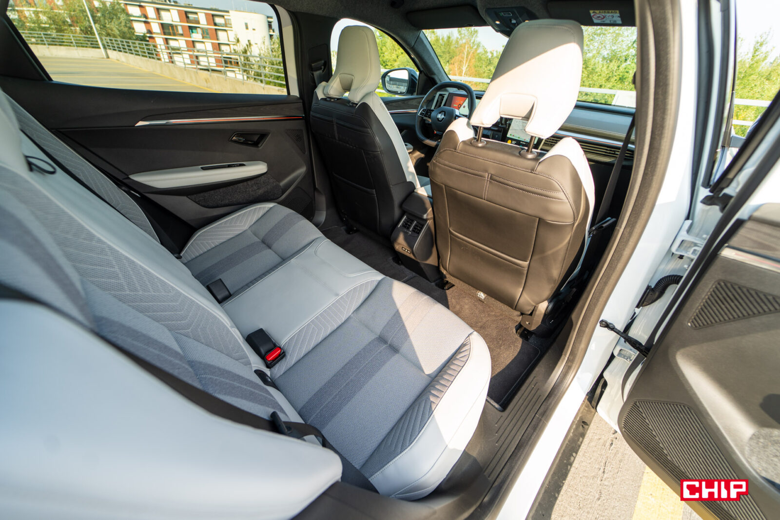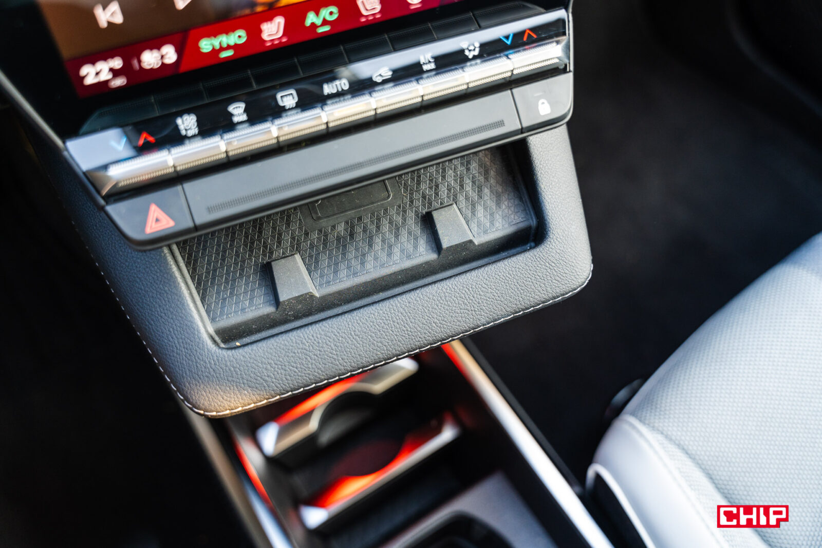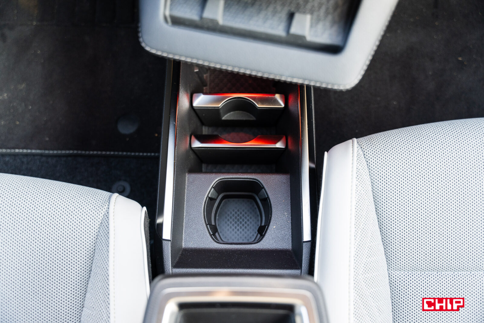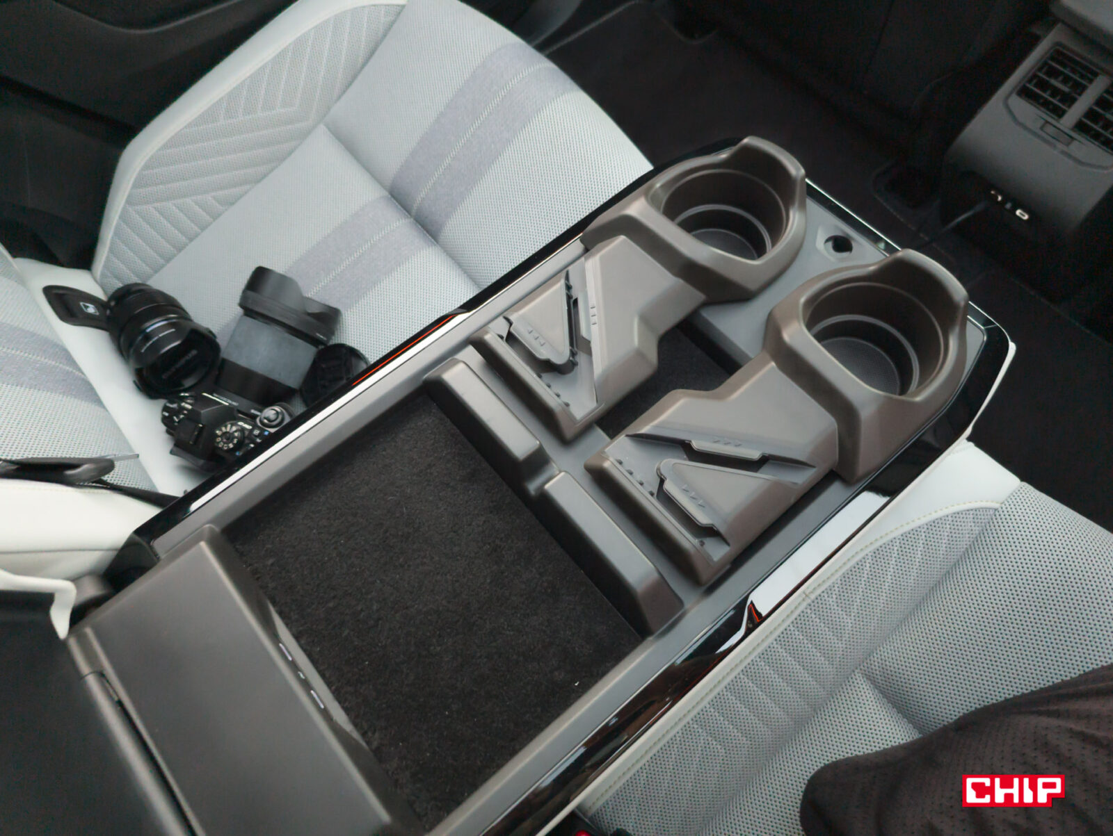 Bardzo nietypowy jest też podłokietnik na tylnej kanapie. Teoretycznie 3-osobowej, ale środkowe miejsce jest tak zrobione, że zniechęca do siadania. W podłokietniku znajdują się porty USB-C oraz obracane uchwyty na napoje. Jest tu też miejsce do poprowadzenia kabla, a po obróceniu uchwyty można w nim umieścić smartfon lub tablet w pozycji stojącej. Może dziwnie wyglądające, ale praktyczne rozwiązanie. Na tylnej kanapie podróżuje się bardzo wygodnie, a na brak miejsca na nogi i nad głową nikt nie powinien narzekać.