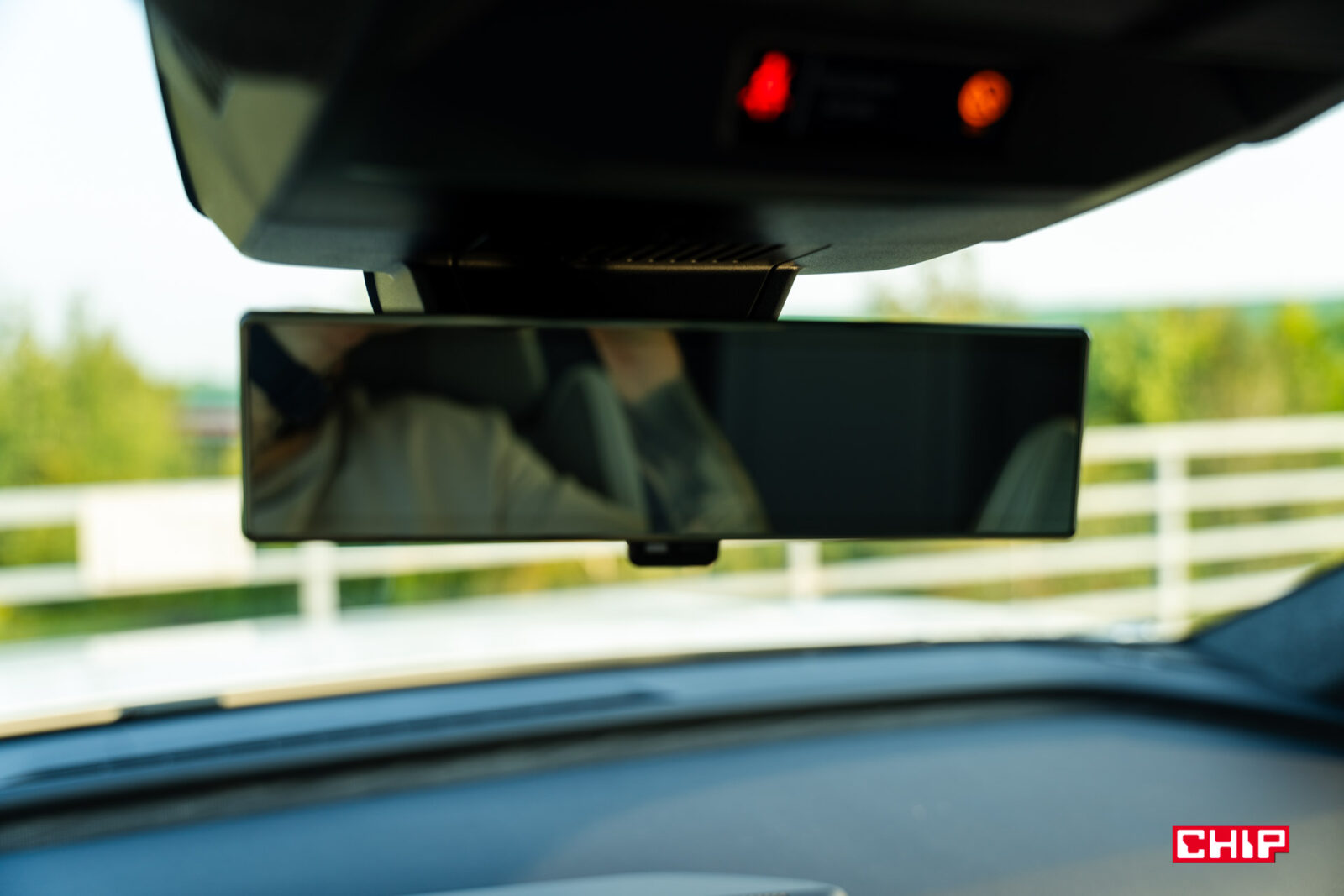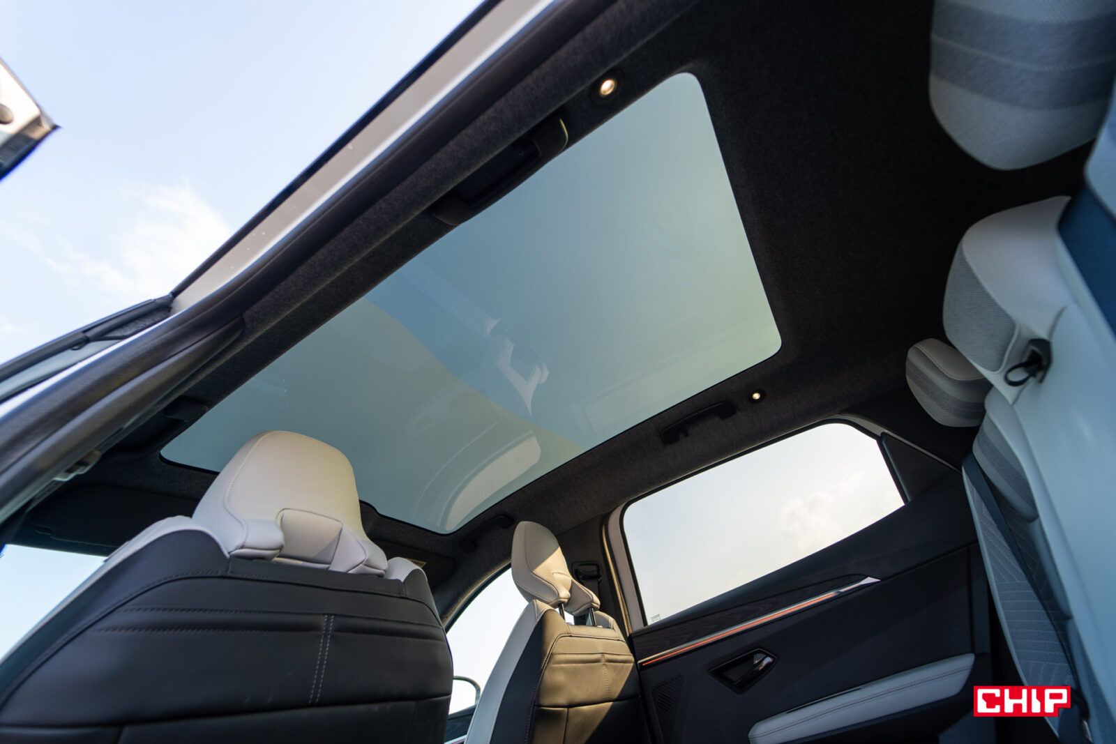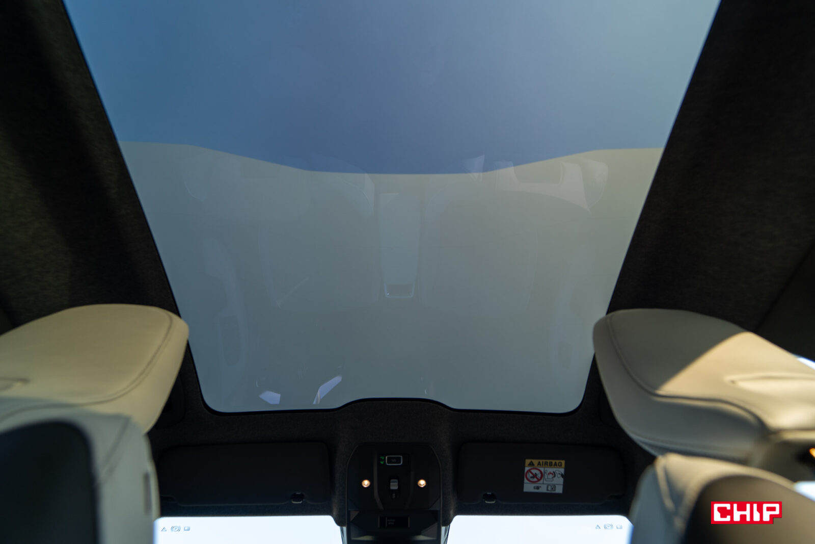 Bardzo nietypowym elementem jest okno dachowe. Choć nie ma tu żadnej rolety, to nad lusterkiem wstecznym znajdziemy przycisk w identycznym kształcie jak w autach, które roletę posiadają. W takim razie, za co on odpowiada? Okno ma zmienny stopień przezroczystości, czyli może być albo transparentne, albo mleczne i wtedy chroni nas przed promieniami słońca. Zakres, w jakim szyba ma być mleczna możemy regulować właśnie za pomocą przycisku.