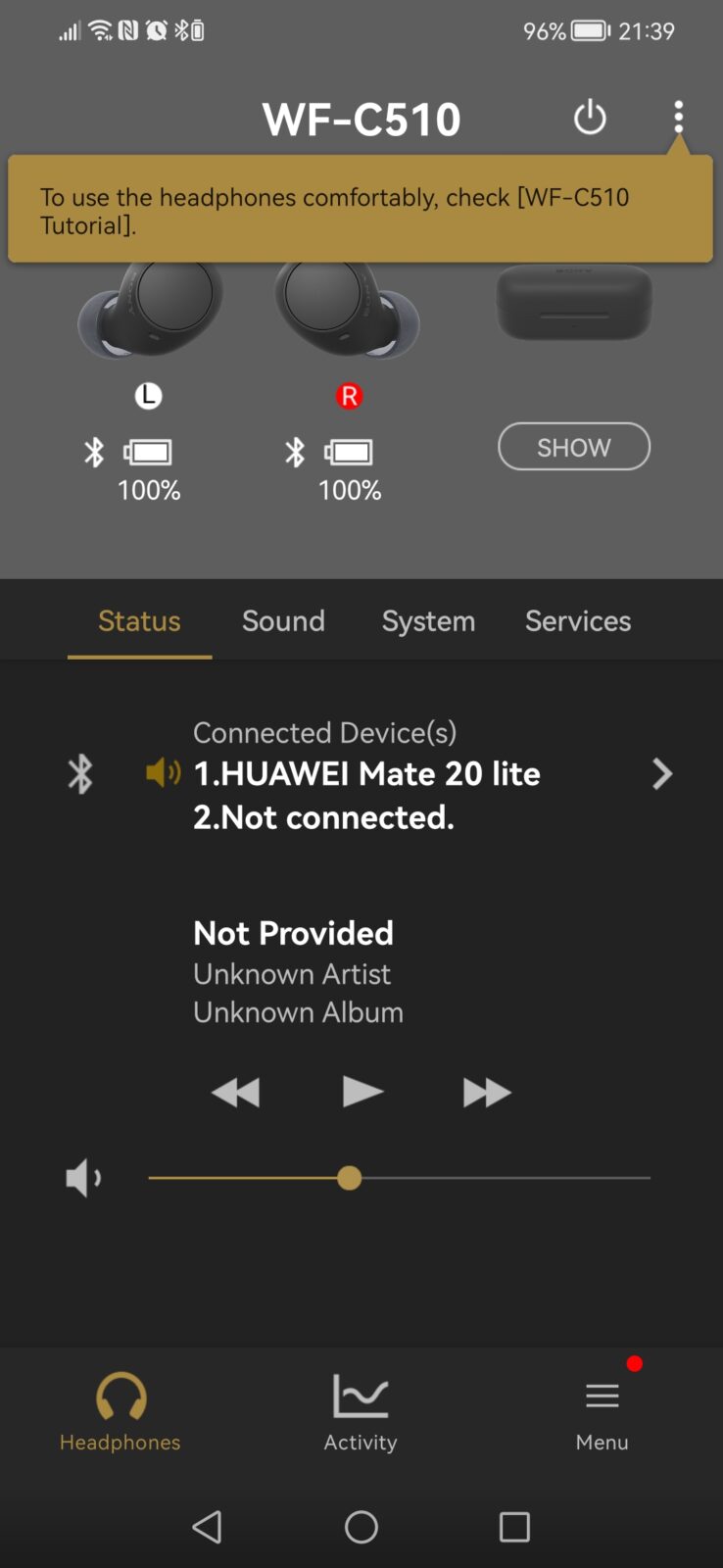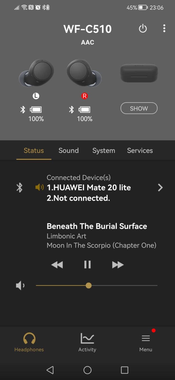 Po każdorazowym wyjęciu słuchawek Sony WF-C510 z etui pojawia się na ekranie smartfona krótka informacja mówiąca o stanie naładowania zarówno samego etui, jak i każdej słuchawki z osobna. Informacje o tym znajdują się także w samej aplikacji.