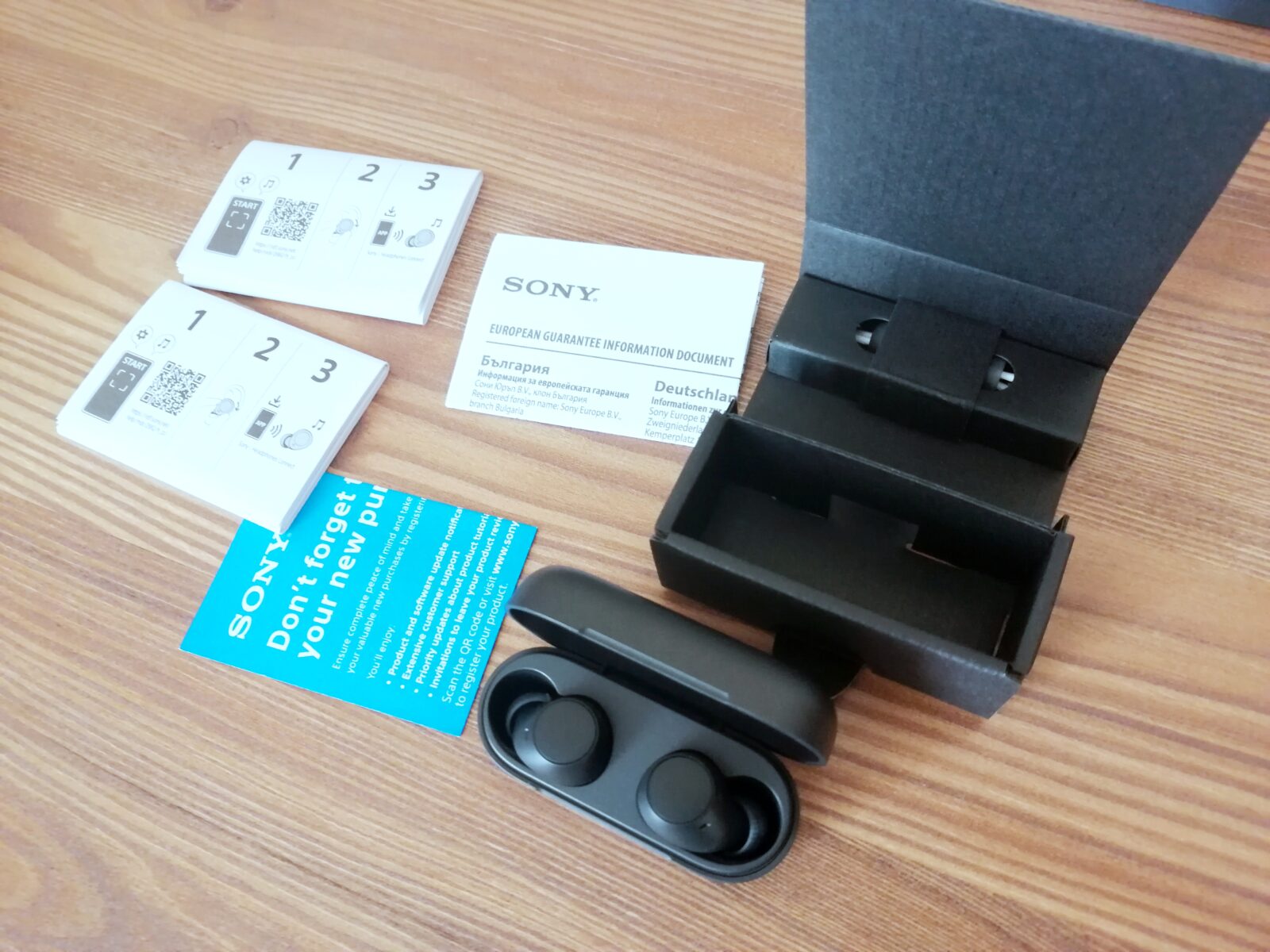 W opakowaniu znajdziemy pudełeczko, w nim zaś etui ze słuchawkami, sprytnie ukryte dwie pary nakładek, kartę gwarancyjną oraz dwie takie same instrukcje. W każdej z nich znajduje się kod QR pozwalający na przejście do strony z aplikacją Headphones Connect, która jest niezbędna do wykorzystania możliwości słuchawek. Uwaga – nie ma tu ładowarki ani nawet kabla USB-C, dlatego musisz mieć go we własnym zakresie.