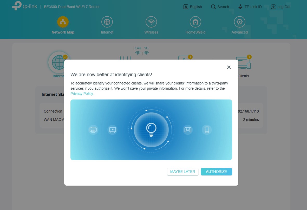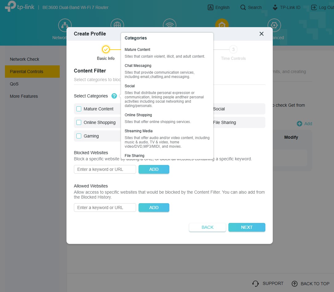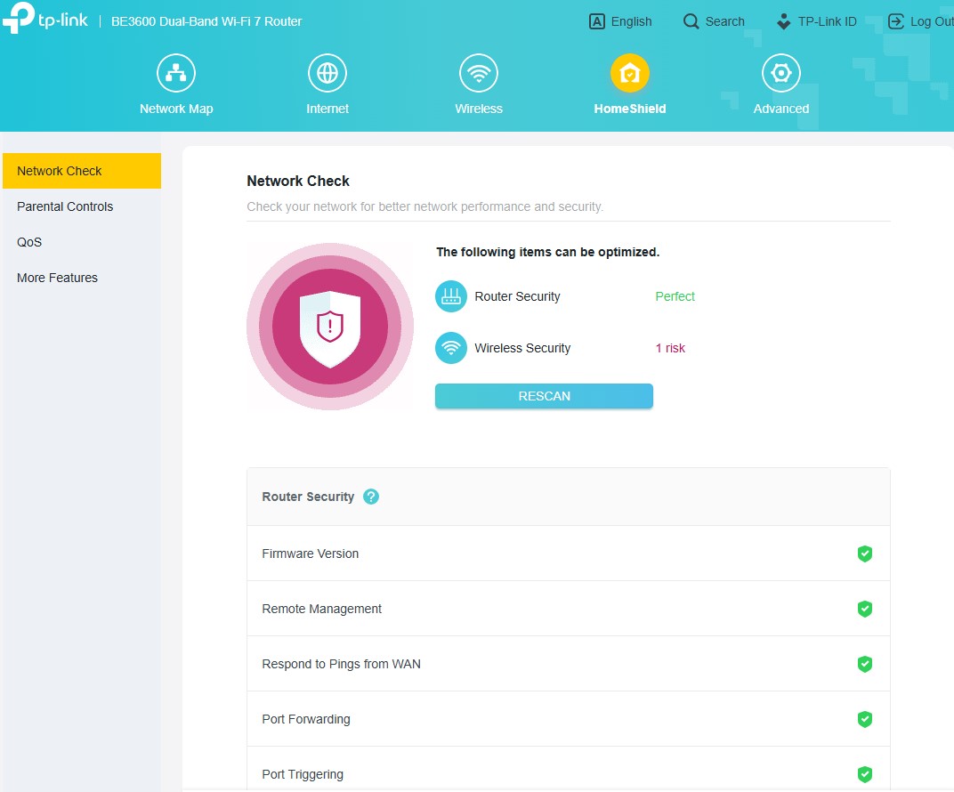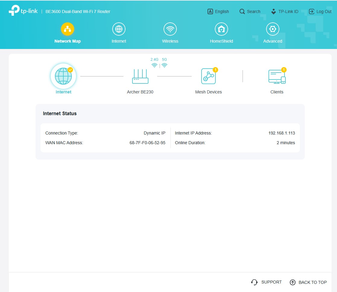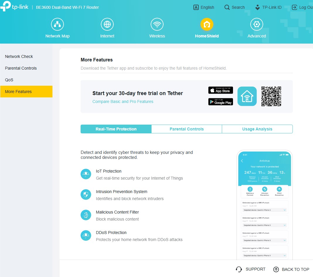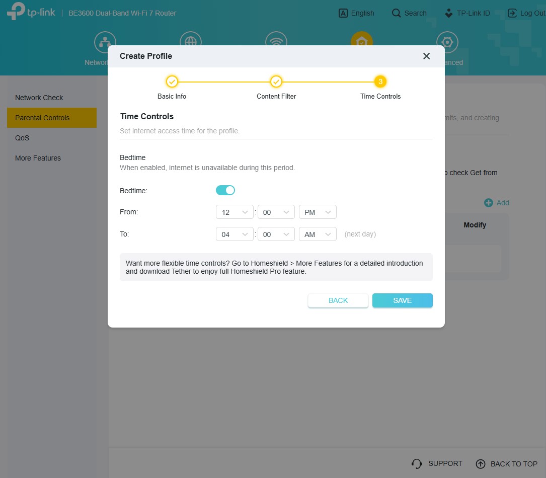 Archer BE3600 można skonfigurować zarówno z poziomu aplikacji, jak i tradycyjnej “strony serwisowej” w przeglądarce, która zapewnia znacznie więcej opcji, jako (poniekąd) tryb zaawansowany wszelkich ustawień. Znajdziecie w nim całą masę użytecznych funkcji, ale TP-Link najbardziej akcentuje wsparcie domowej sieci Wi-Fi Mesh, czyli bardzo prostego tworzenia jednej sieci Wi-Fi z użyciem kilku routerów, wspierających EasyMesh oraz obsługę HomeShield, a więc zestaw funkcji do dbania o bezpieczeństwo sieci, kontrolowania użytkowników oraz nadawania priorytetów sieciowych konkretnym urządzeniom.