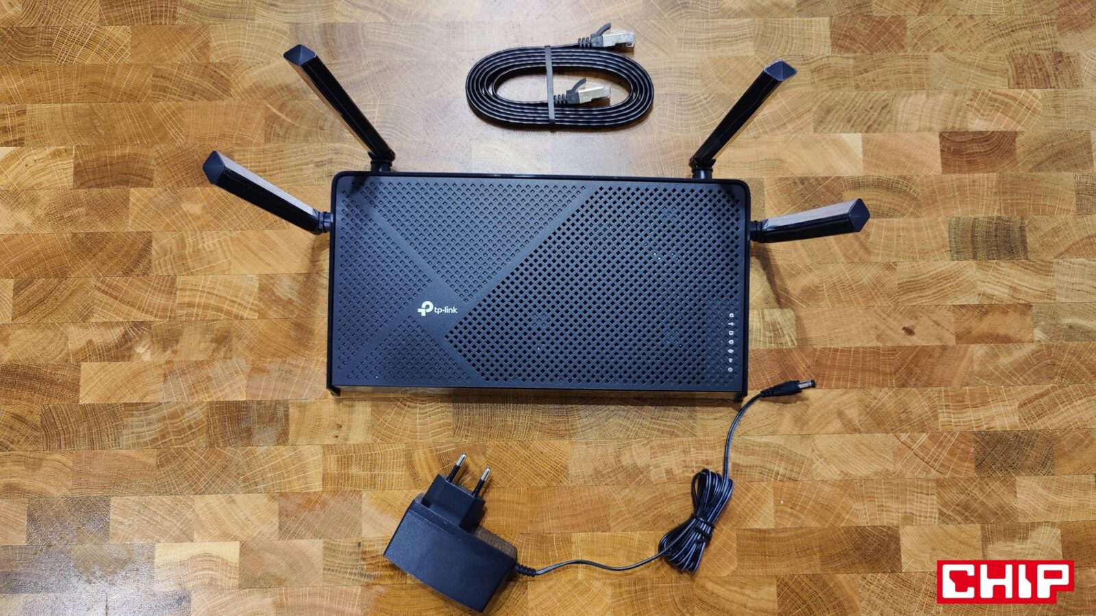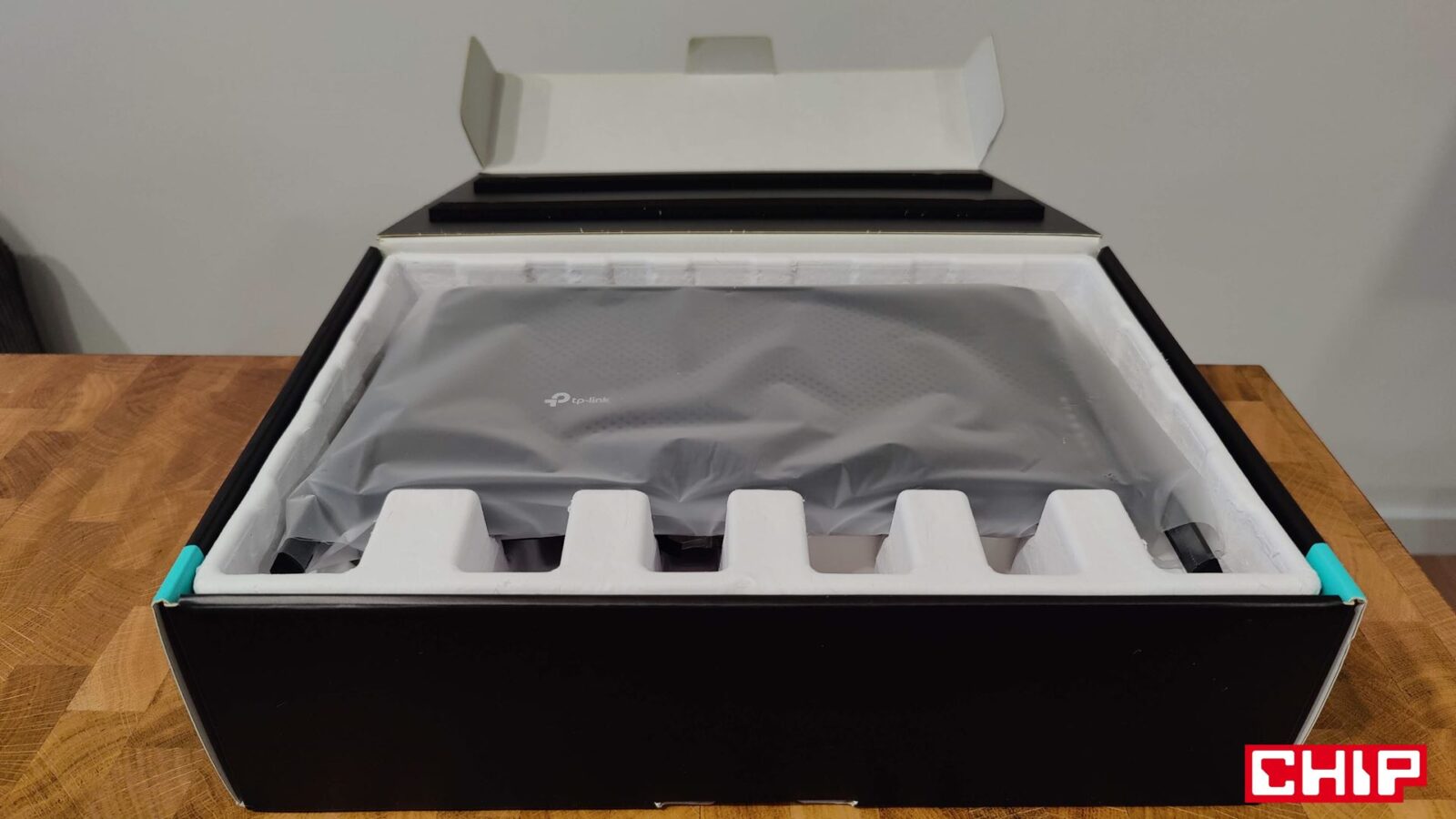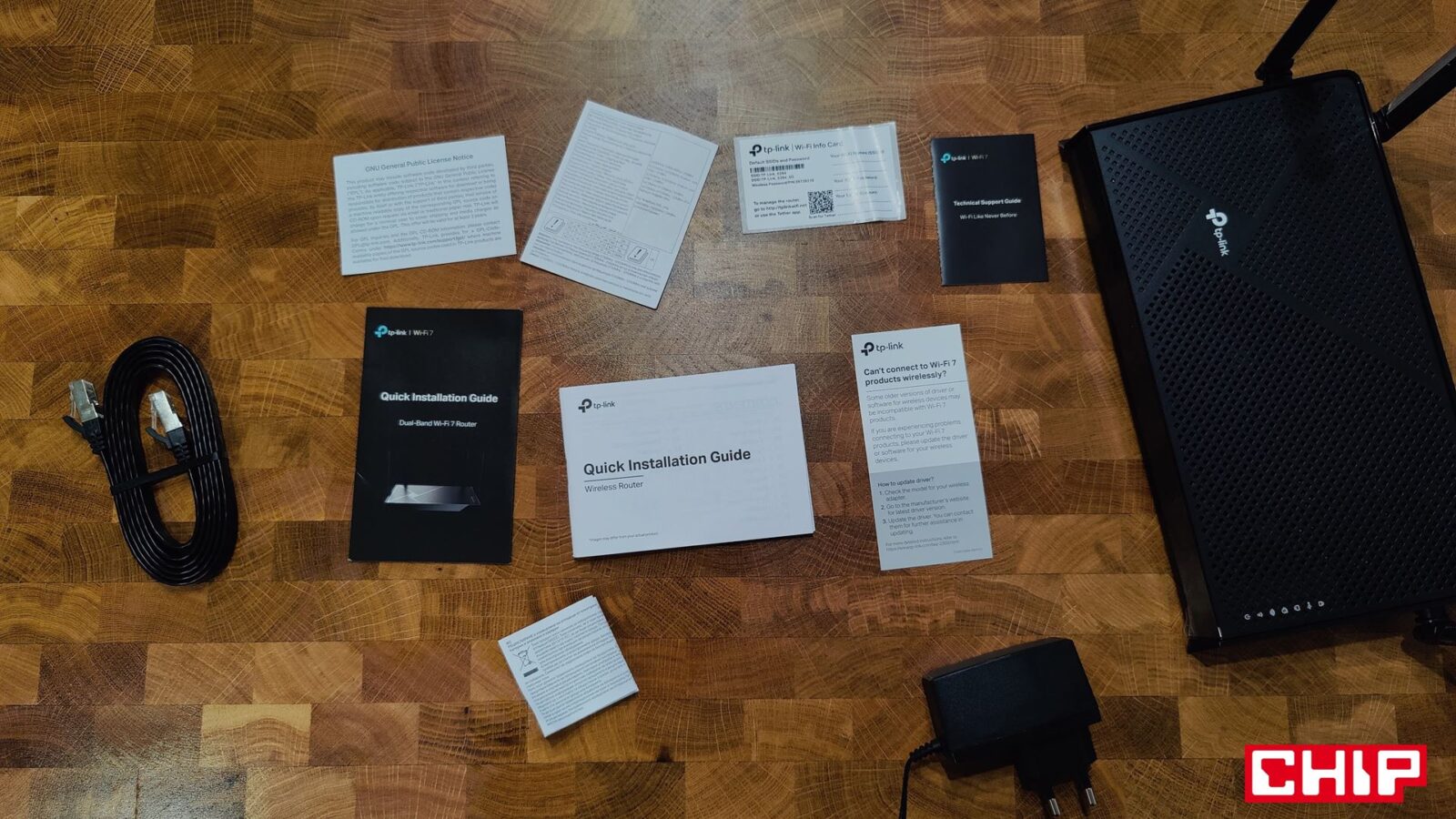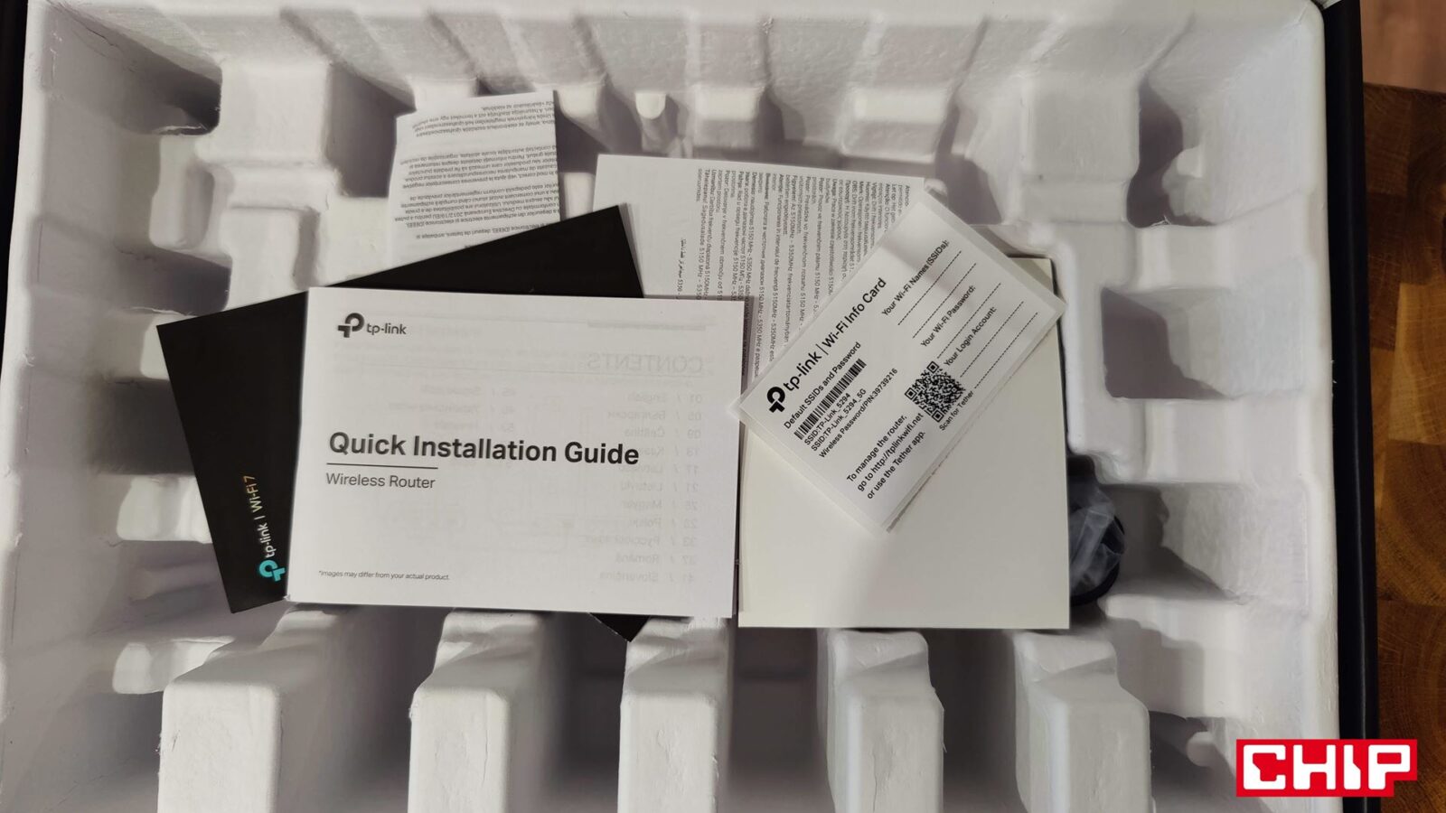 Tak wielu papierków jeszcze nie widziałem. Tak mogę podsumować pierwsze chwile z przyjemnie zapakowanym i bardzo dobrze zabezpieczonym Archer BE3600, któremu to w pudełku towarzyszyło aż osiem “papierków”, z czego ważny jest przede wszystkim jeden – skrócona instrukcja obsługi. Poza tym znajdziecie w pudełku również zasilacz o cienkim i długim przewodzie oraz przewód Ethernet z wyższej półki.