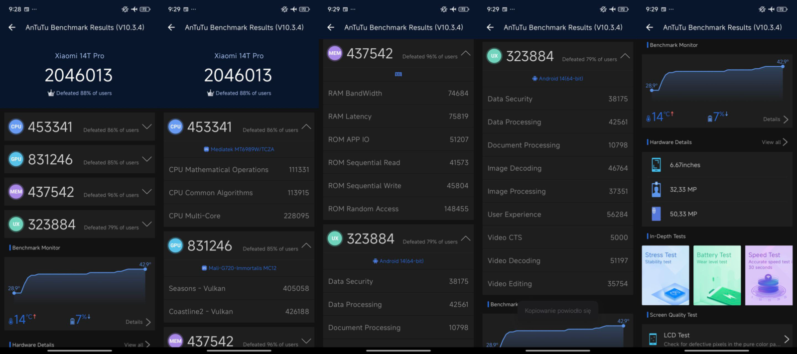 Sercem Xiaomi 14T Pro nie jest — jak w przypadku Xiaomi MIX Flip — Snapdragon 8s Gen 3, a MediaTek Dimensity 9300+, który — zgodnie z zapewnieniami Xiaomi — gwarantuje o 37 procent lepszą wydajność w porównaniu do modelu 14T. Zastosowano tu także układ graficzny Immortalis-G720, a za chłodzenie odpowiada zaawansowany system 3D IceLoop. Smartfon ma do tego 12 GB pamięci RAM LPDDR5X oraz przestrzeń na dane w wariantach 256 GB, 512 GB lub 1 TB z technologią UFS 4.0. Wyniki testów benchmarków możecie zobaczyć poniżej.
