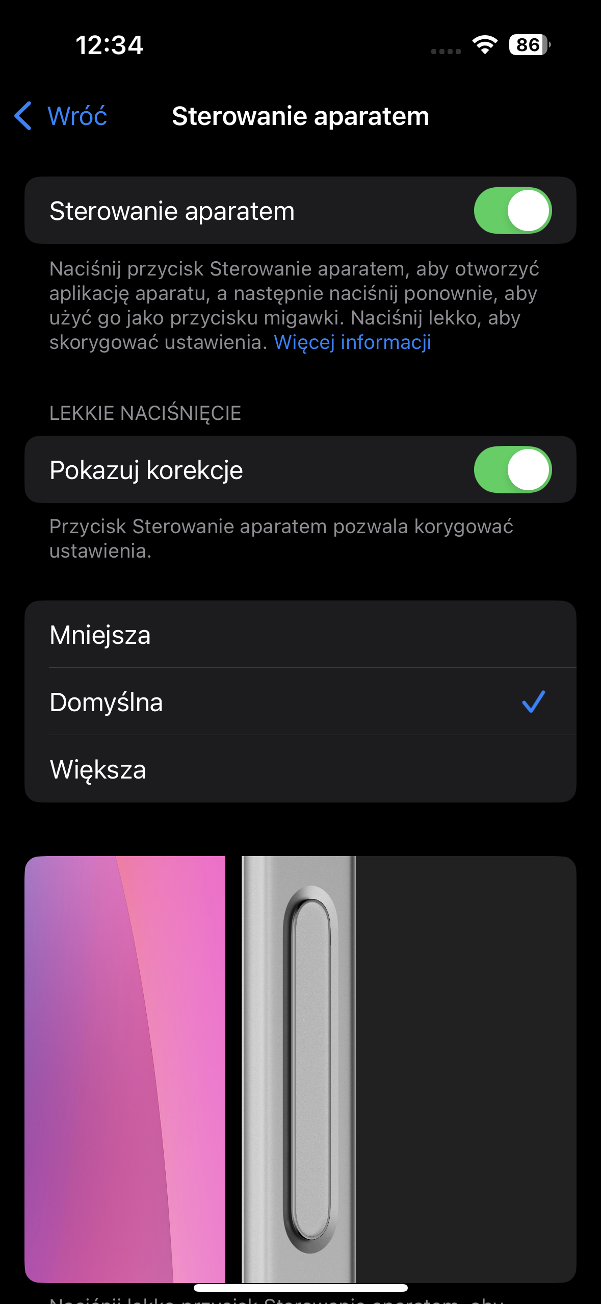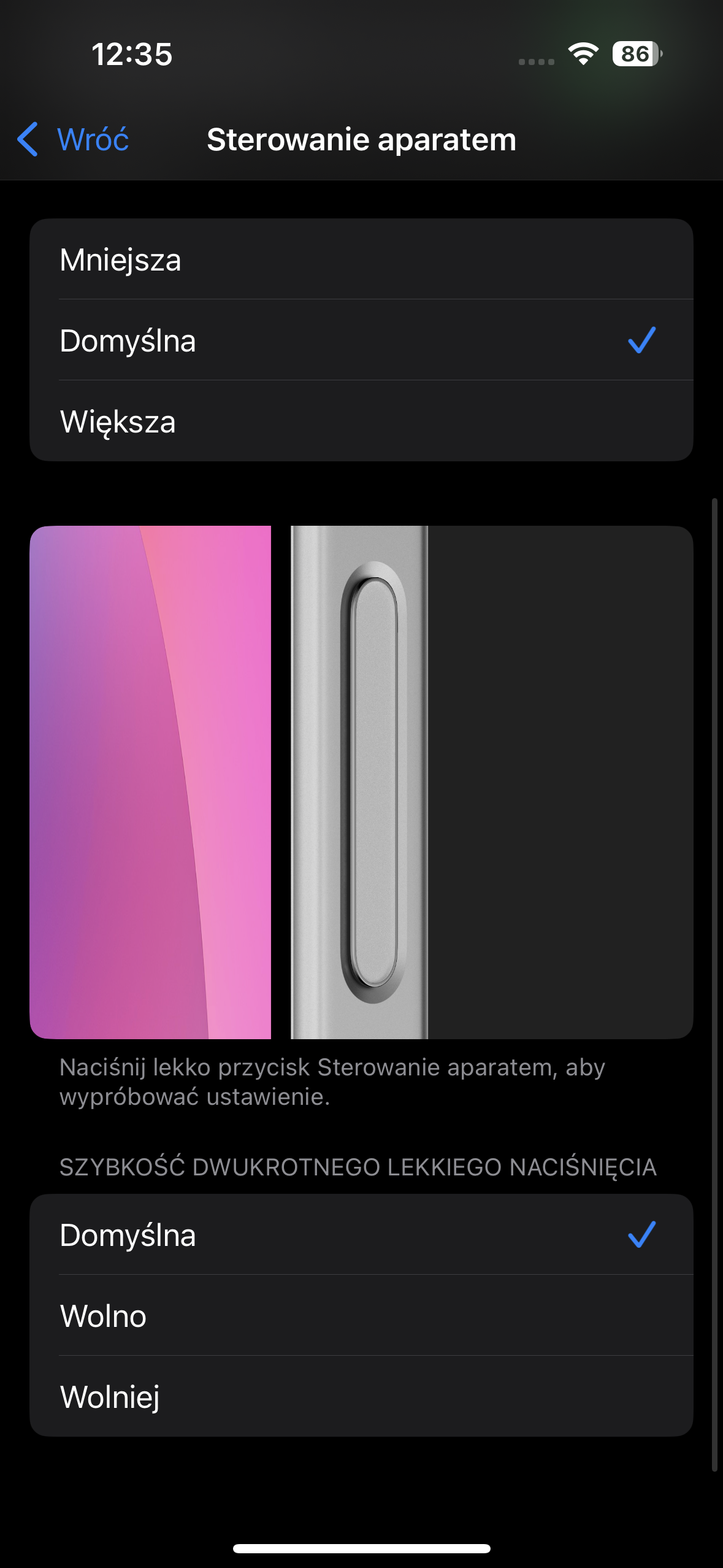 Drugą nowością jest natomiast przycisk Camera Control. Długo zastanawiałem się, jak go opisać – jest wciskany, ale jego powierzchnia jest małym panelem dotykowym. Ma też haptyczny feedback. Jedno mocne wciśnięcie domyślnie uruchamia aparat. W uruchomionej aplikacji aparatu mocne wciśnięcie odpowiada spustowi migawki, lekkie wciśnięcie włącza pasek regulacji parametrów, a dwa lekkie wciśnięcia po sobie pozwalają wybrać, który parametr regulujemy – korekcję ekspozycji, głębię, zoom, wybór aparatu, wybór stylu i tonację.