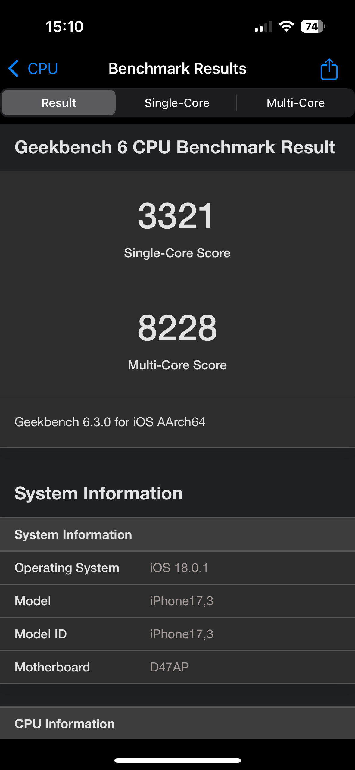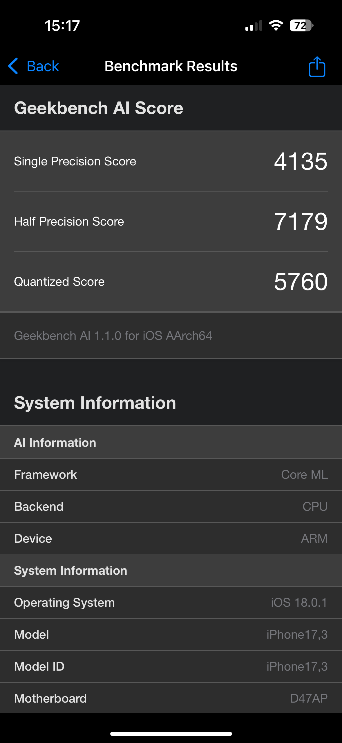 - Geekbench AI CPU: 4135 / 7179 / 5760 pkt