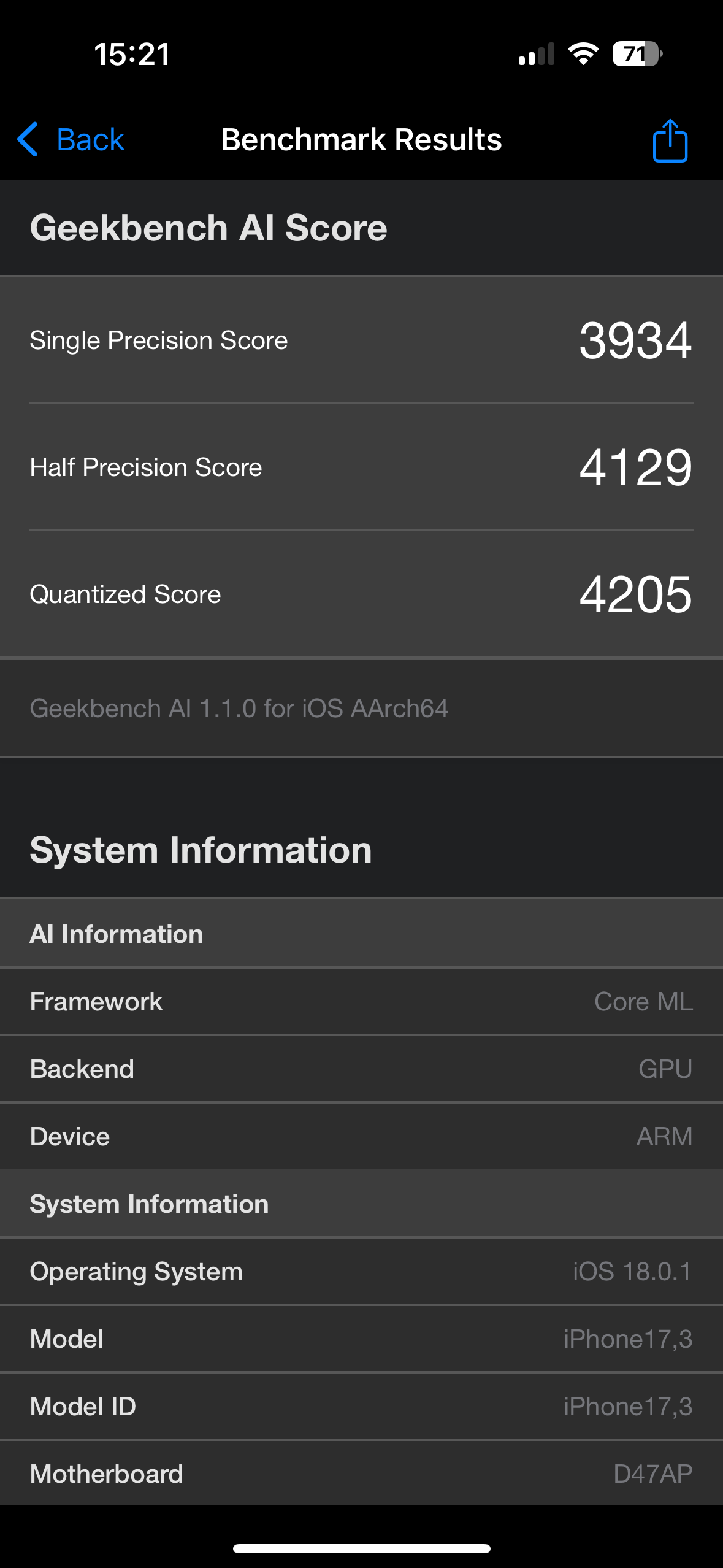 - Geekbench AI GPU: 3934 / 4129 / 4205 pkt