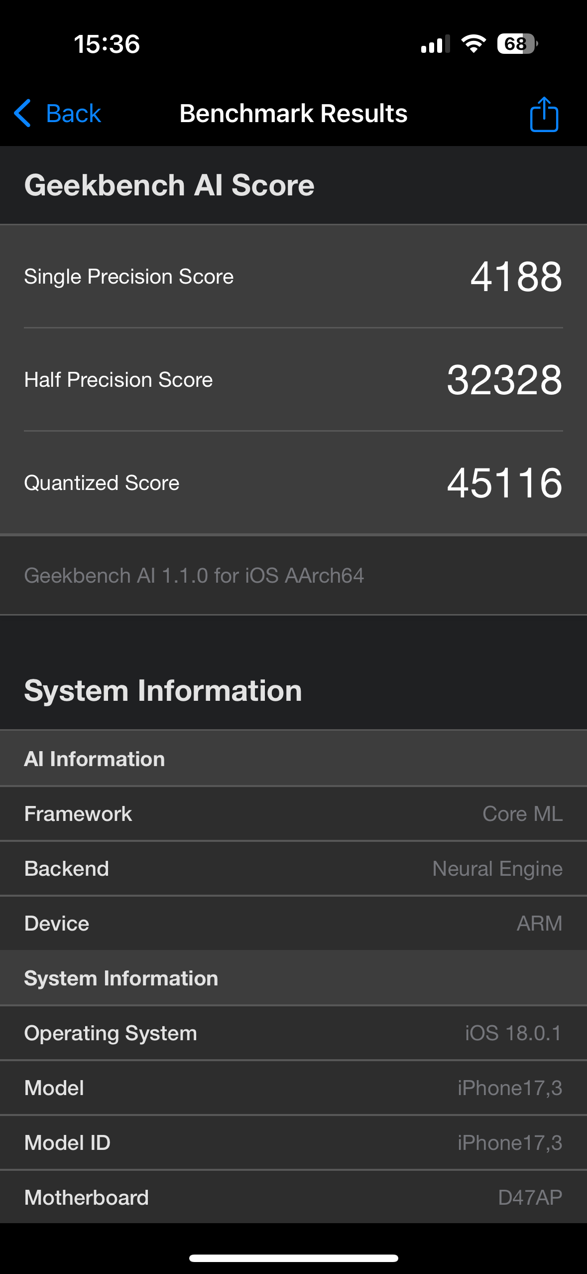 - Geekbench AI Neural Engine: 4188 / 32328 / 45116 pkt