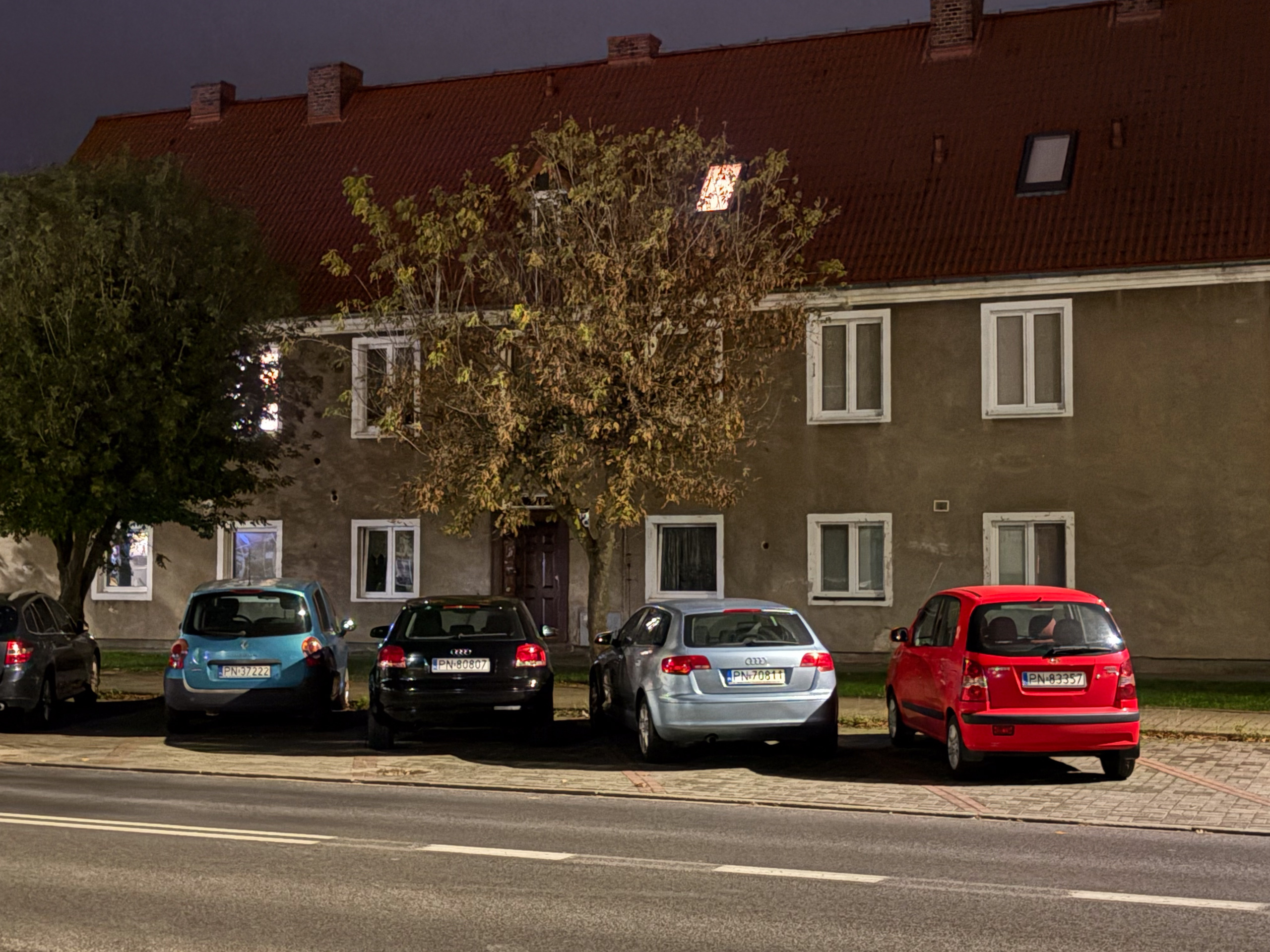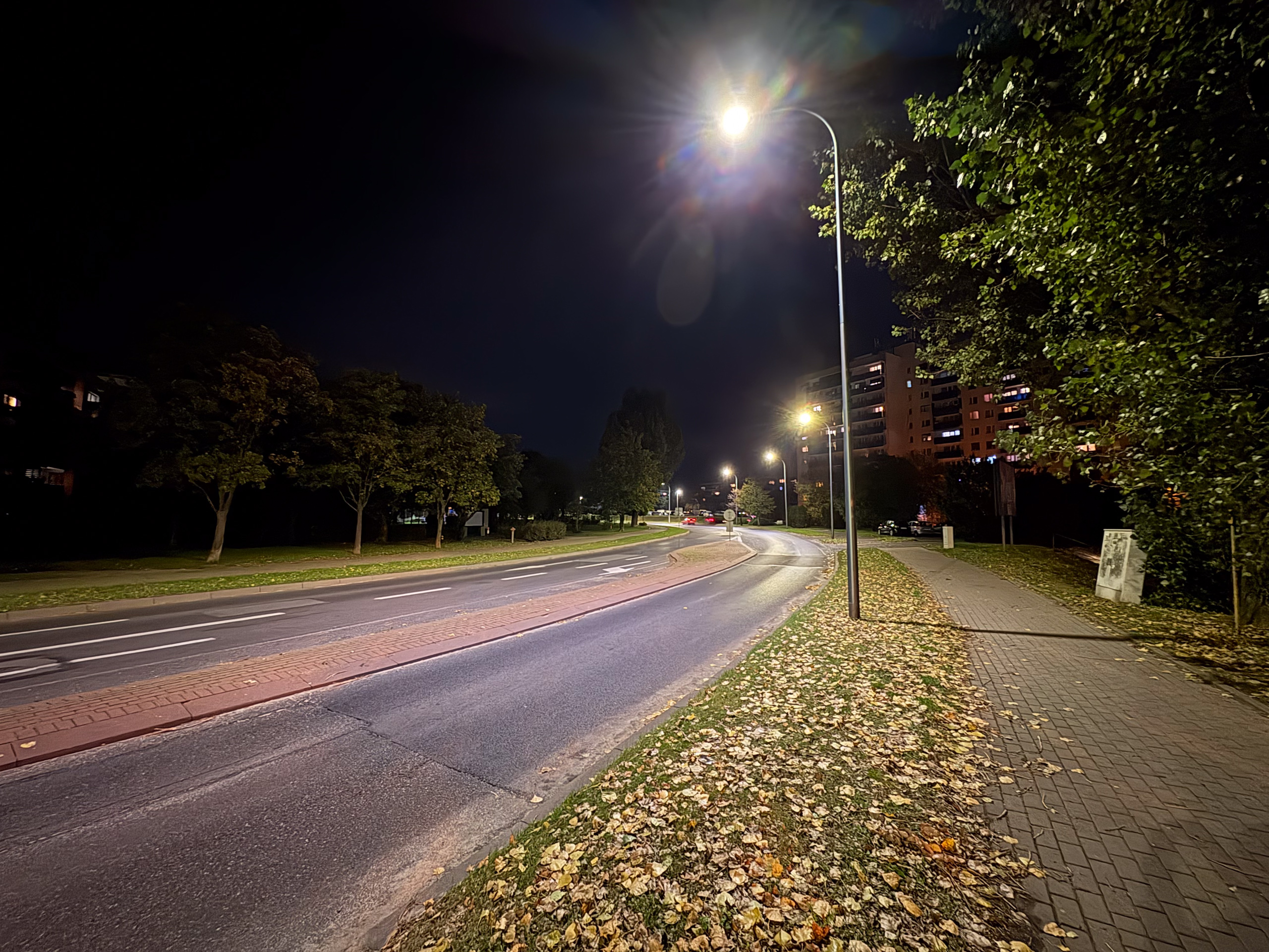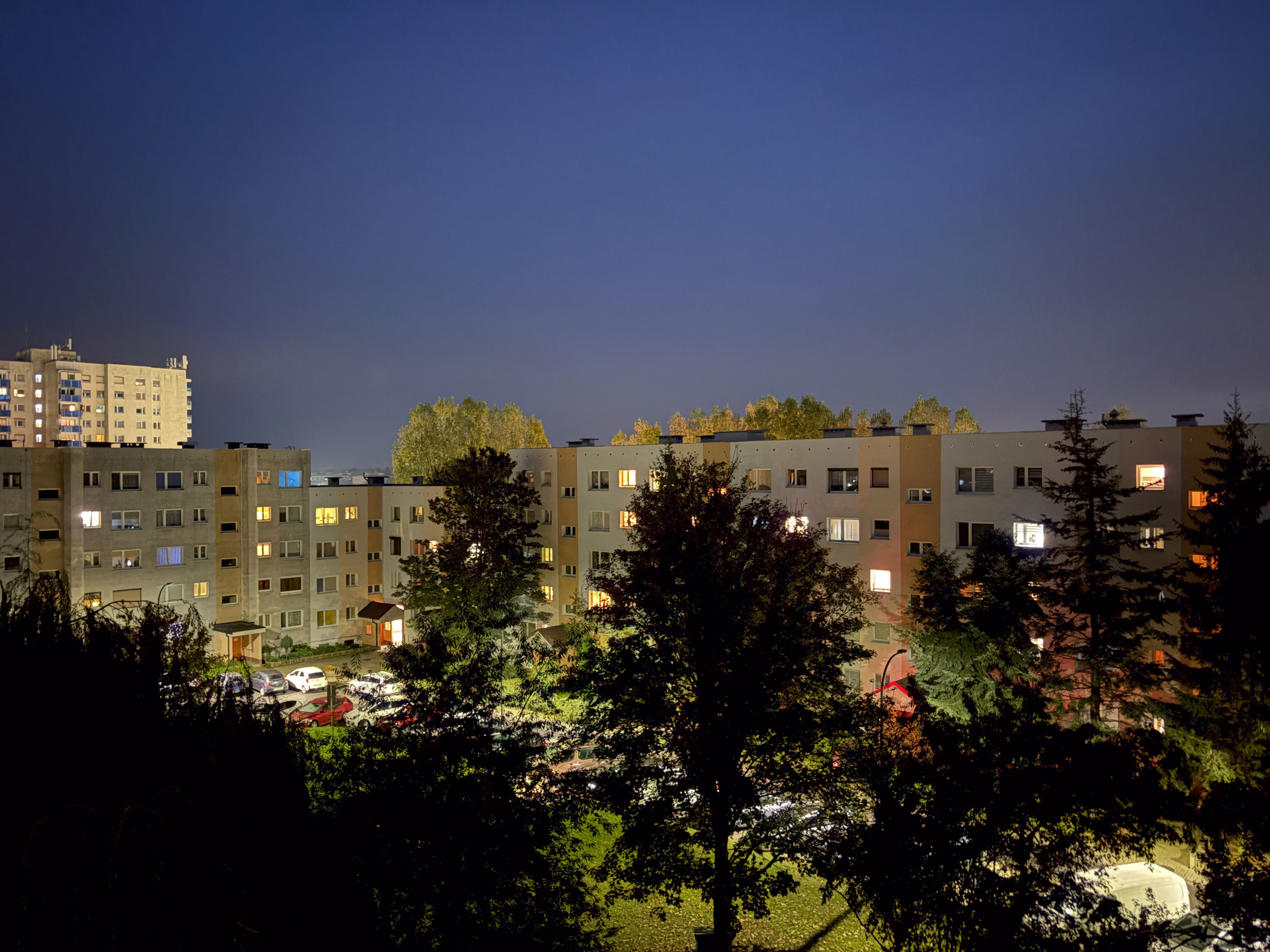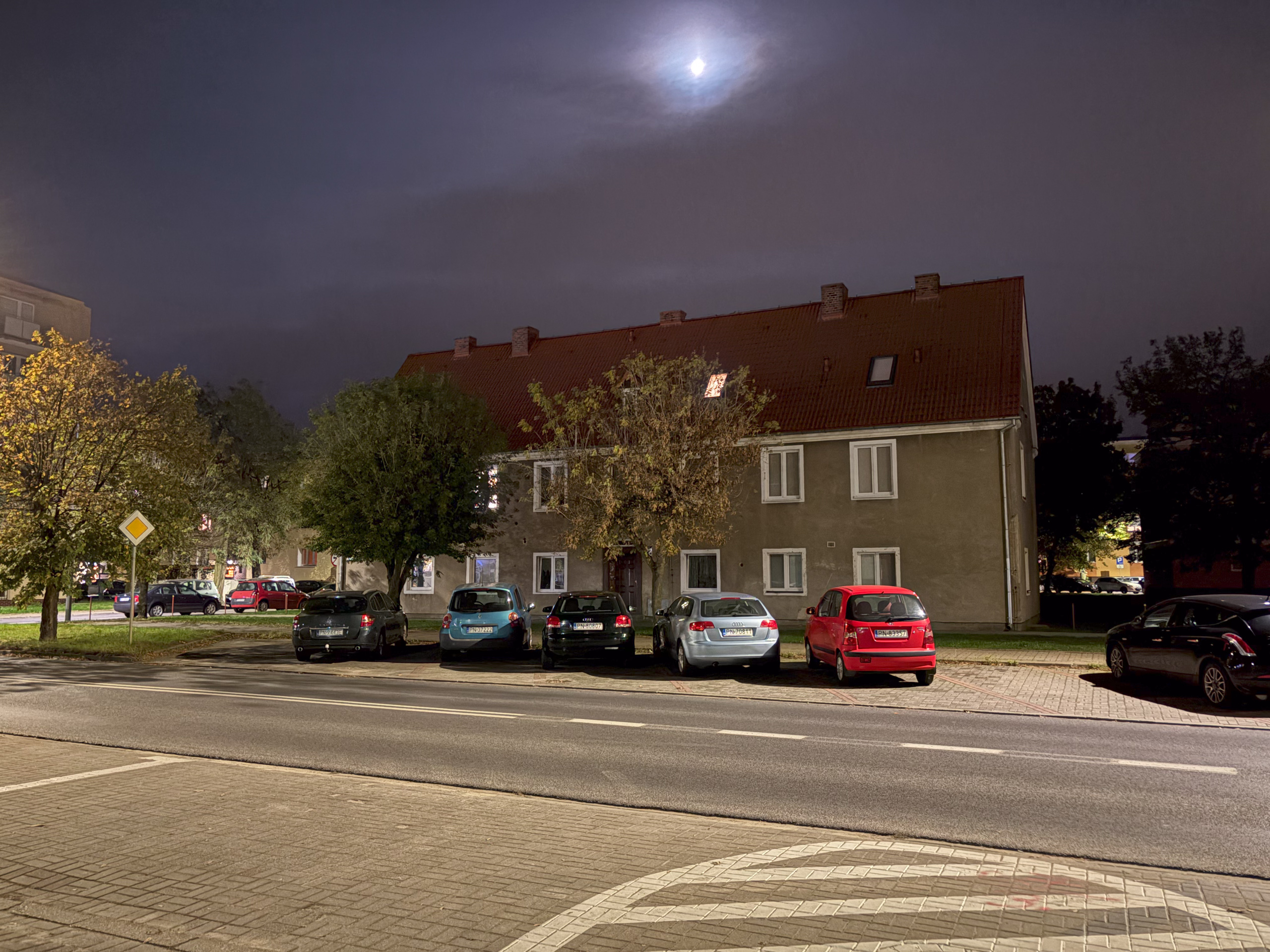 Nocne fotografie z Iphone’a 16 są szczegółowe, nawet dla cropu ×2, i bez większych artefaktów. Co ciekawe, Apple nie utrzymało ścisłej kontroli nad balansem bieli w nocy i kolorystyka zdjęć z aparatu UWA i standardowego dość mocno się rozjeżdża. Zdjęcia są dość jasne, ale wciąż widać, że noc to noc, a na niebie da się zauważyć gwiazdy.