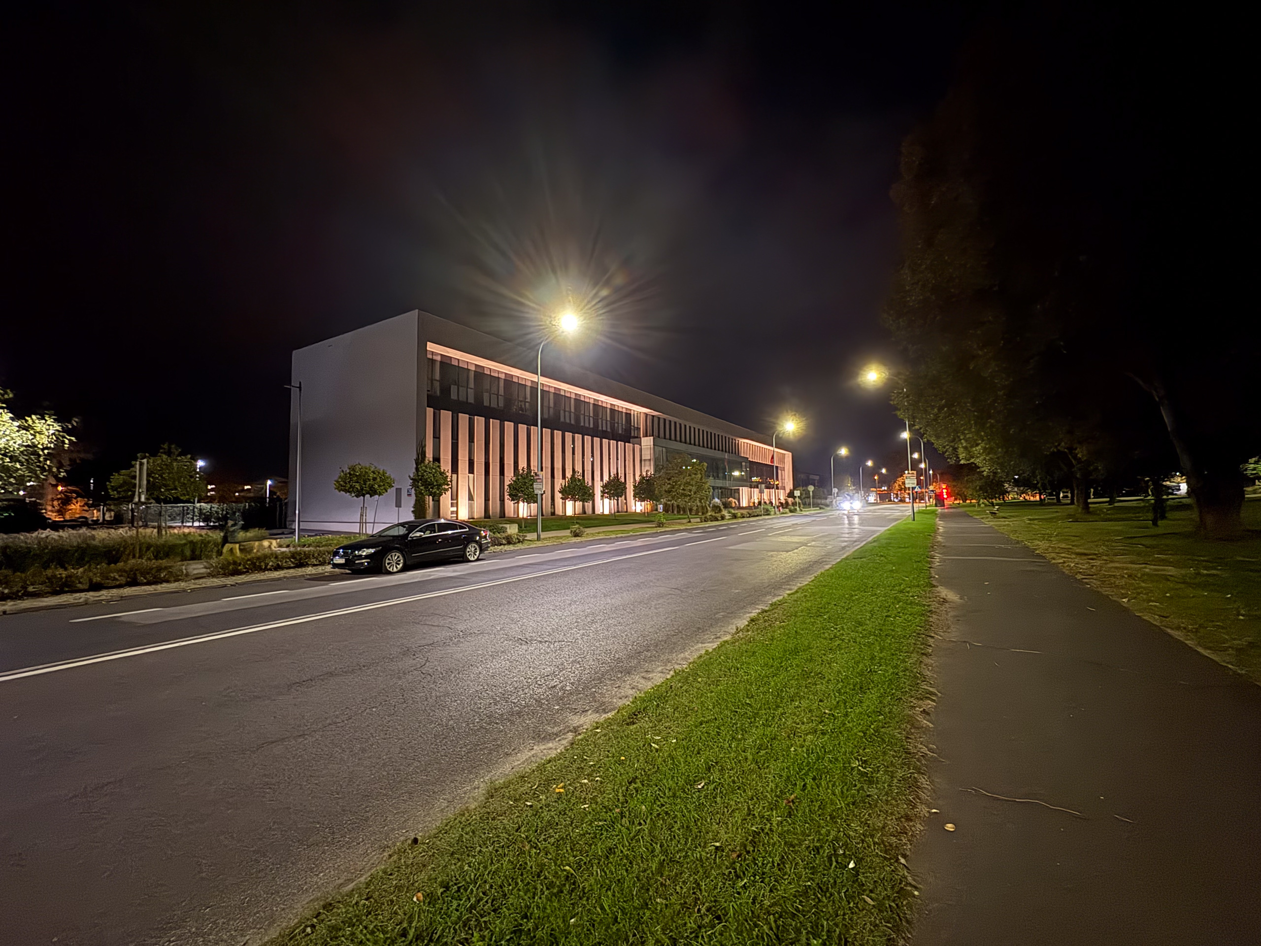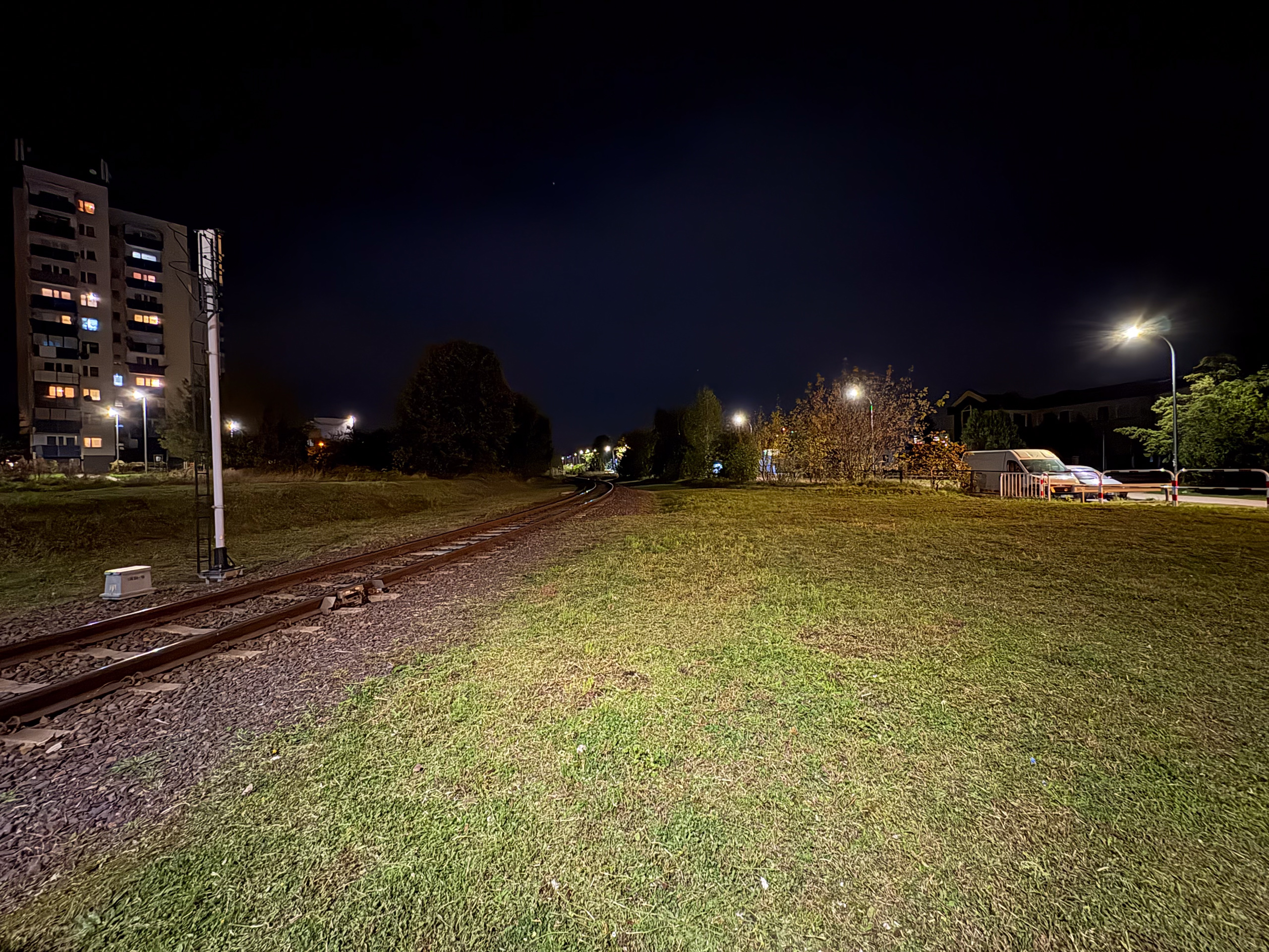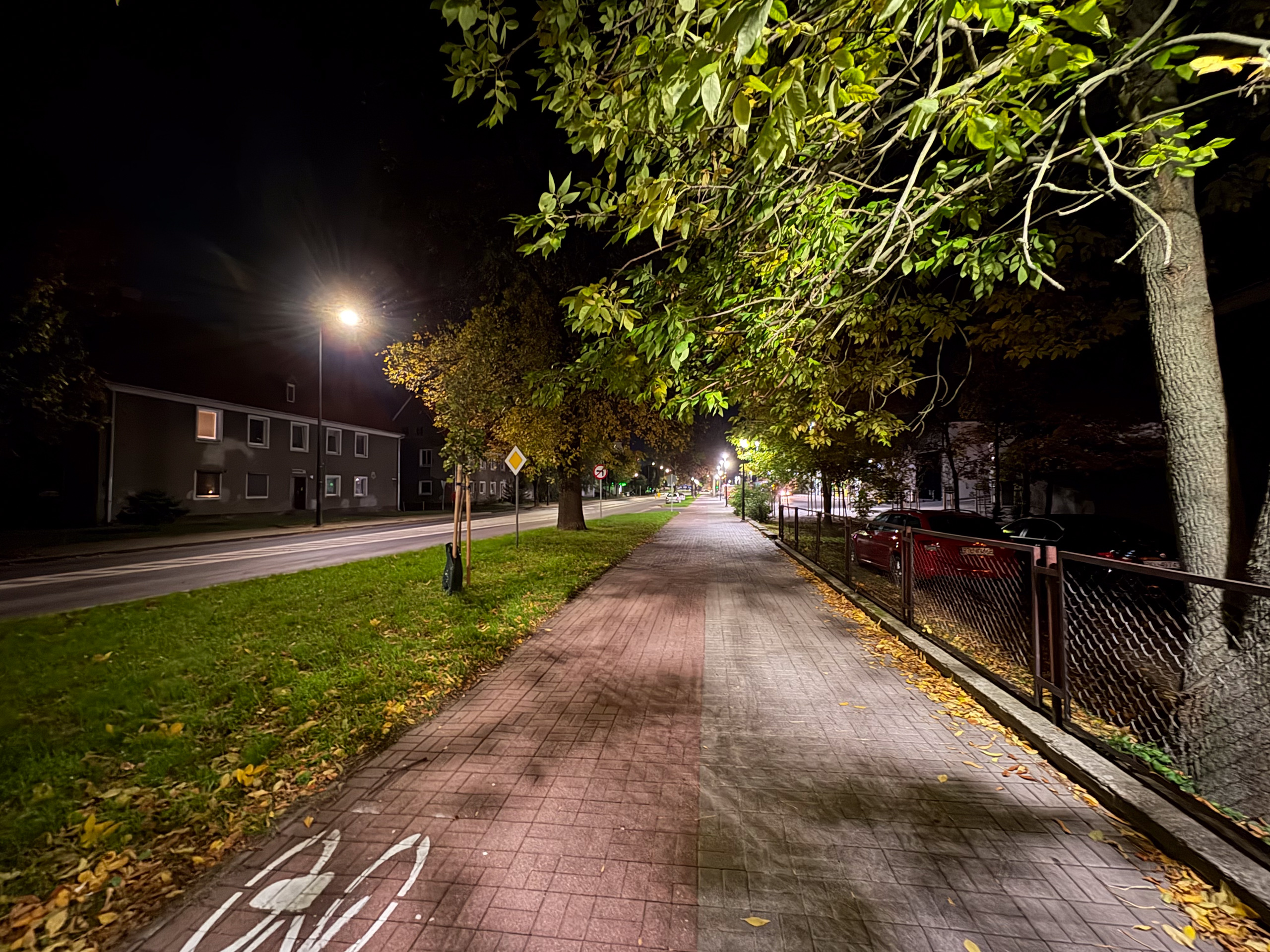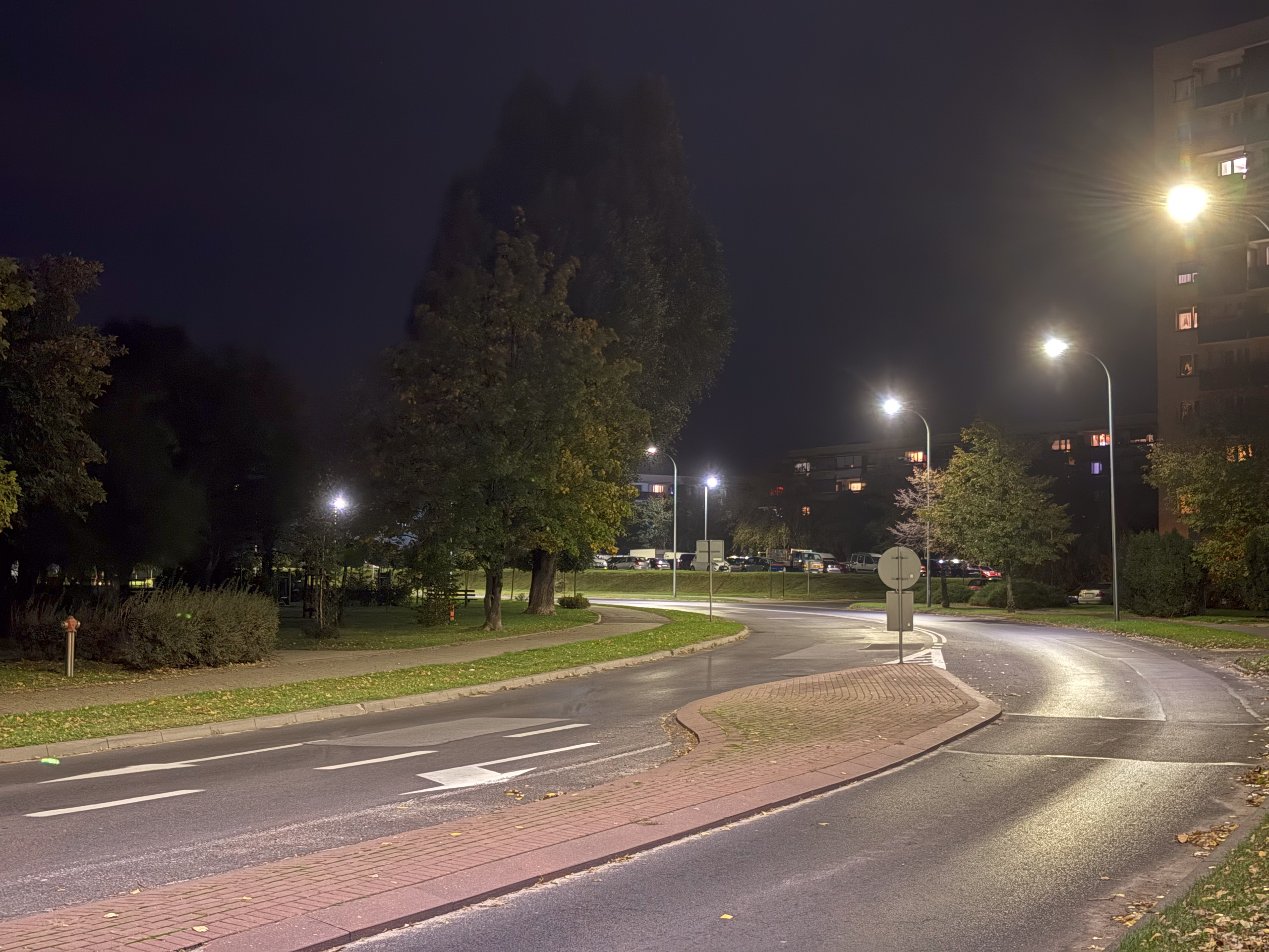 Nocne fotografie z Iphone’a 16 są szczegółowe, nawet dla cropu ×2, i bez większych artefaktów. Co ciekawe, Apple nie utrzymało ścisłej kontroli nad balansem bieli w nocy i kolorystyka zdjęć z aparatu UWA i standardowego dość mocno się rozjeżdża. Zdjęcia są dość jasne, ale wciąż widać, że noc to noc, a na niebie da się zauważyć gwiazdy.