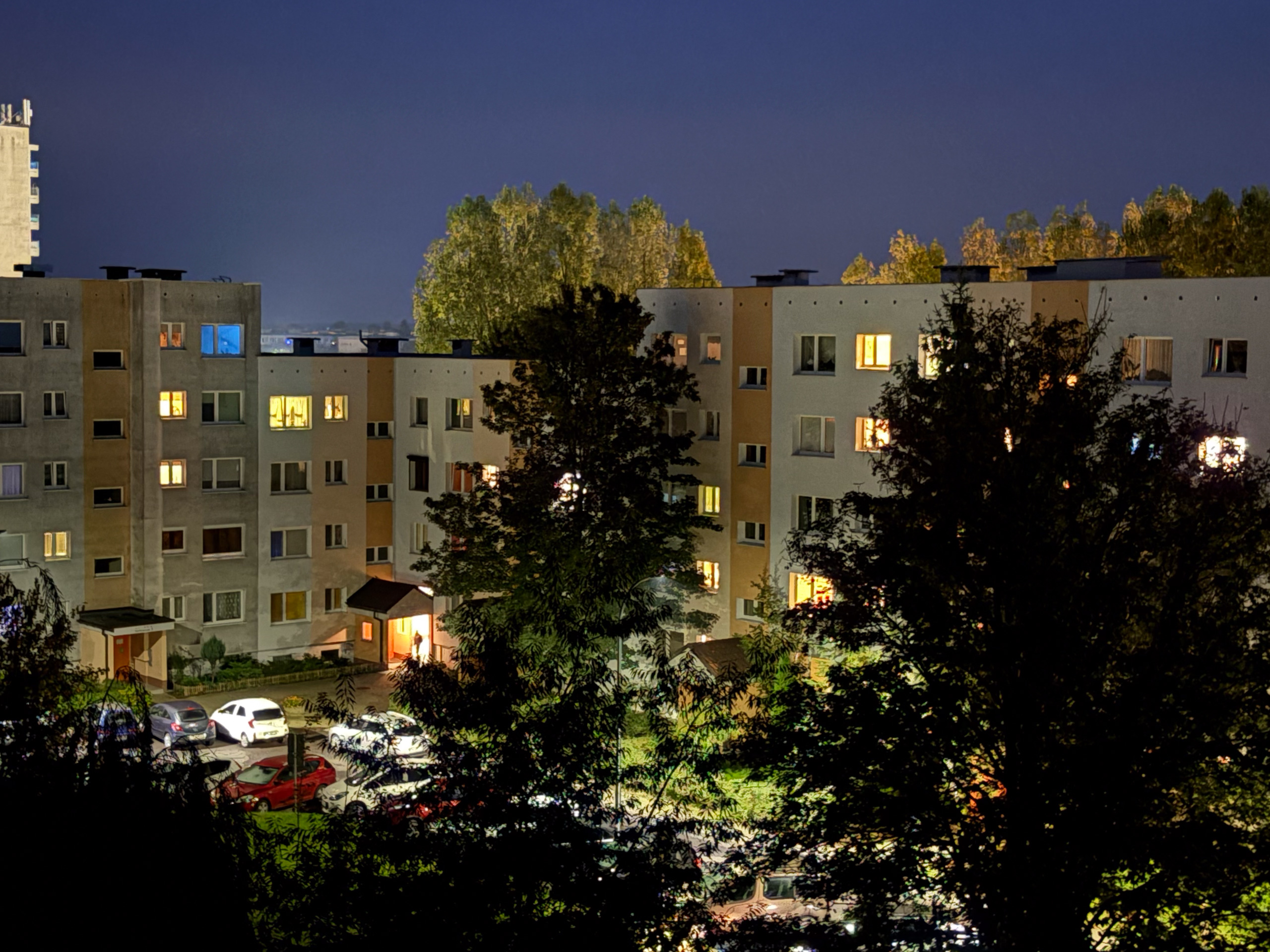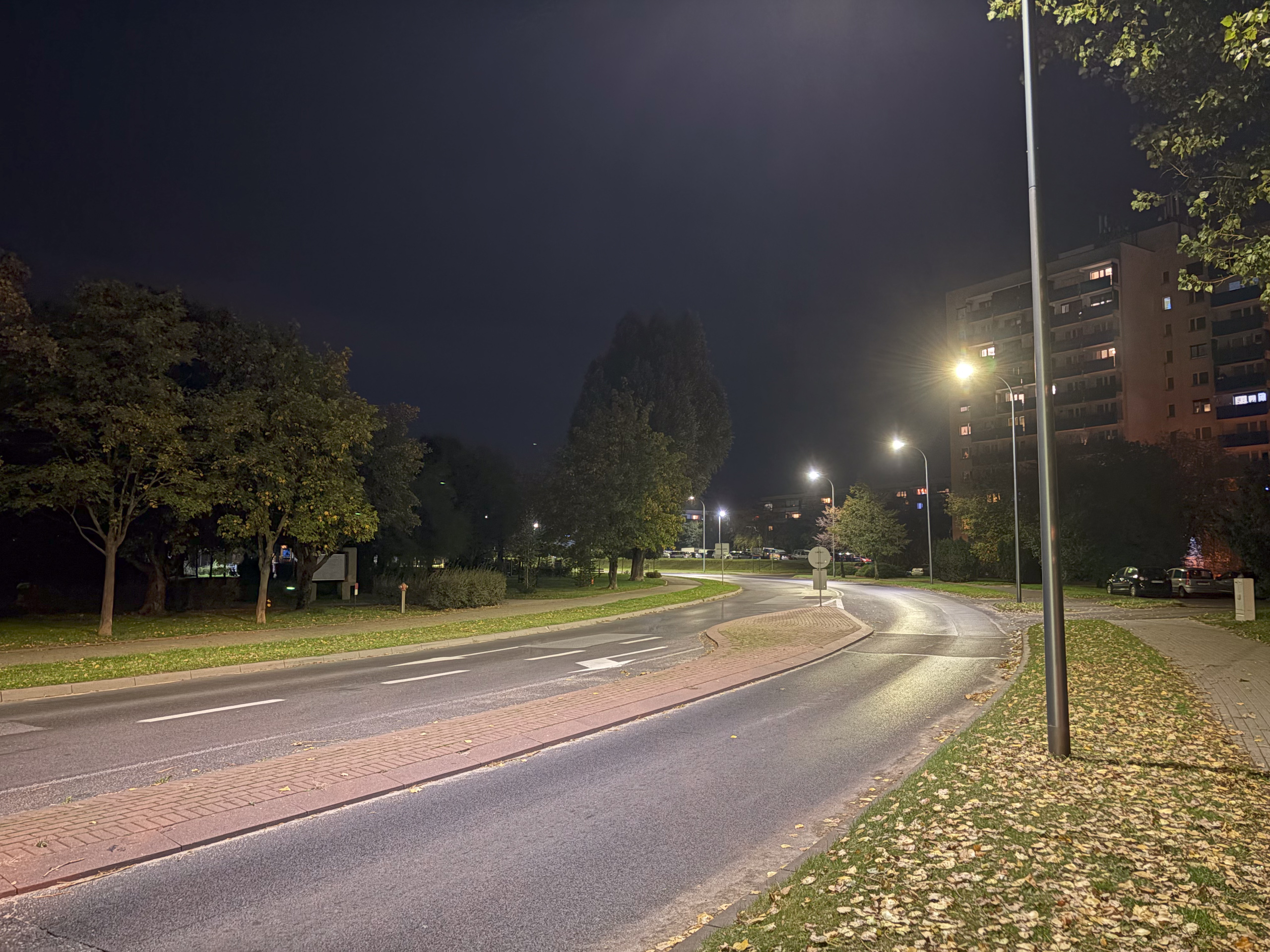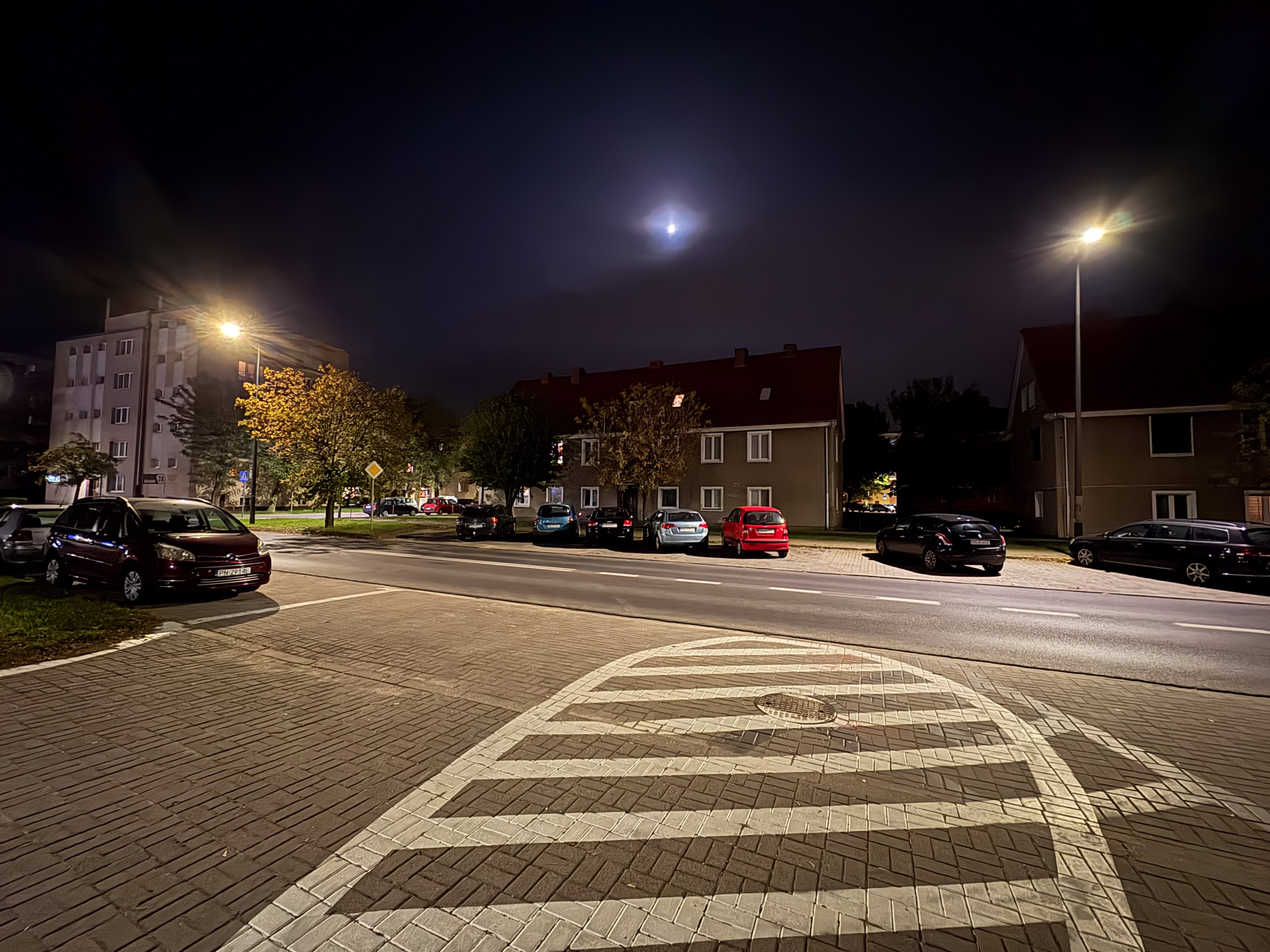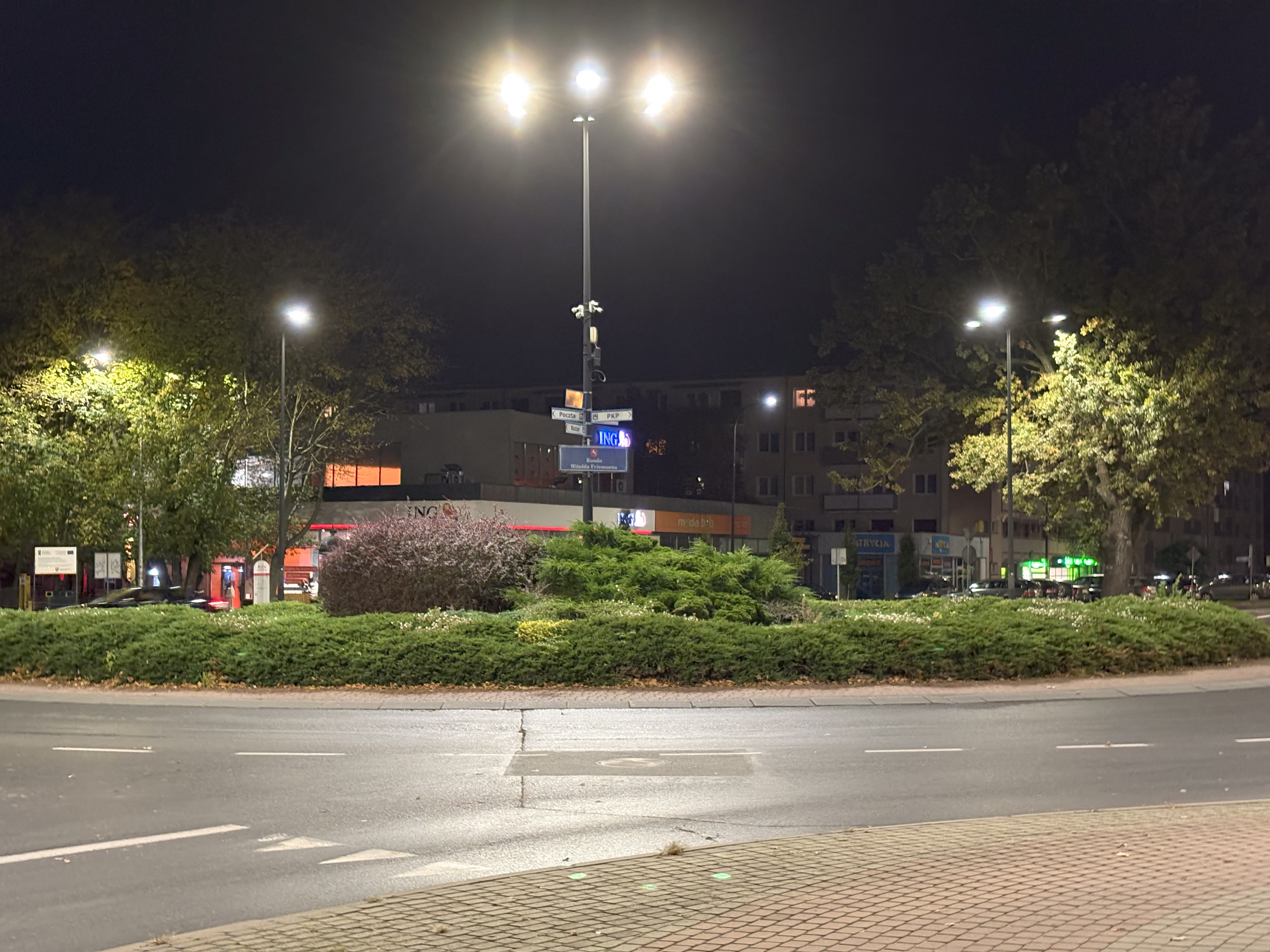 Nocne fotografie z Iphone’a 16 są szczegółowe, nawet dla cropu ×2, i bez większych artefaktów. Co ciekawe, Apple nie utrzymało ścisłej kontroli nad balansem bieli w nocy i kolorystyka zdjęć z aparatu UWA i standardowego dość mocno się rozjeżdża. Zdjęcia są dość jasne, ale wciąż widać, że noc to noc, a na niebie da się zauważyć gwiazdy.