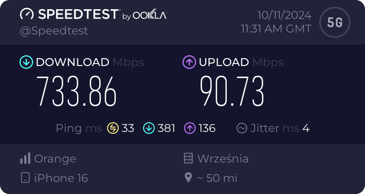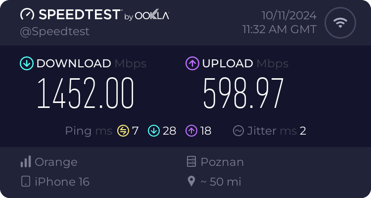 Routera zgodnego z Wi-Fi 7 w tej chwili niestety nie mam, a szkoda, gdyż wg niektórych informacji iPhone 16 otrzymał niepełną obsługę protokołu i nie potrafi używać kanałów 320 MHz – przydałoby się to sprawdzić. Nie zdziwiłoby mnie to o tyle, że np. w iPhone 13 Pro implementacja Wi-Fi 6 też nie obsługiwała szerokich kanałów (w tym wypadku 160 MHz), co ograniczało wydajność do ~750 Mbps. W połączeniu w routerem Wi-Fi 6 iPhone 16 osiągnął 1450 Mbps podczas pobierania i 600 Mbps podczas wysyłania, czyli tyle, ile lokalna fabryka pozwala.