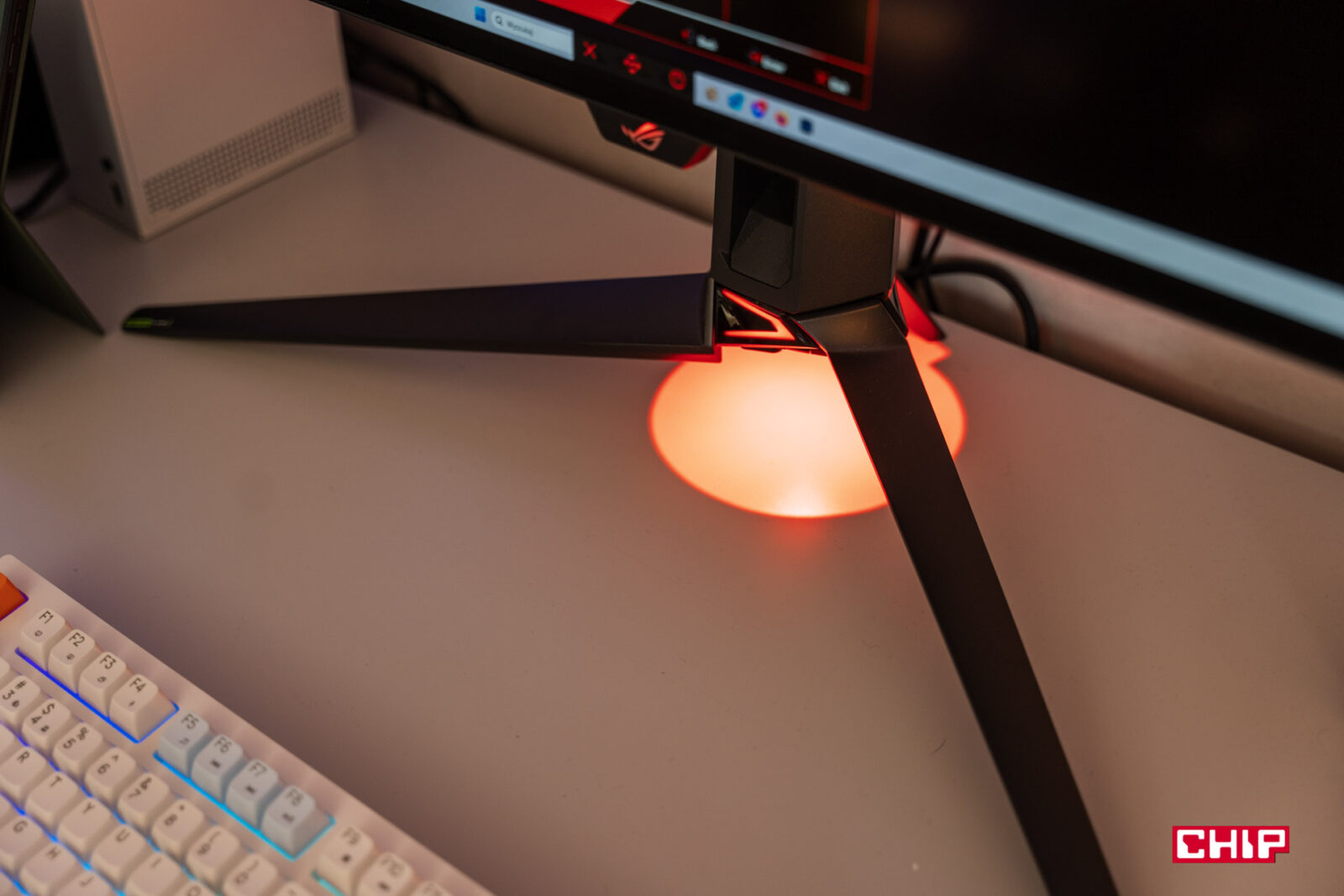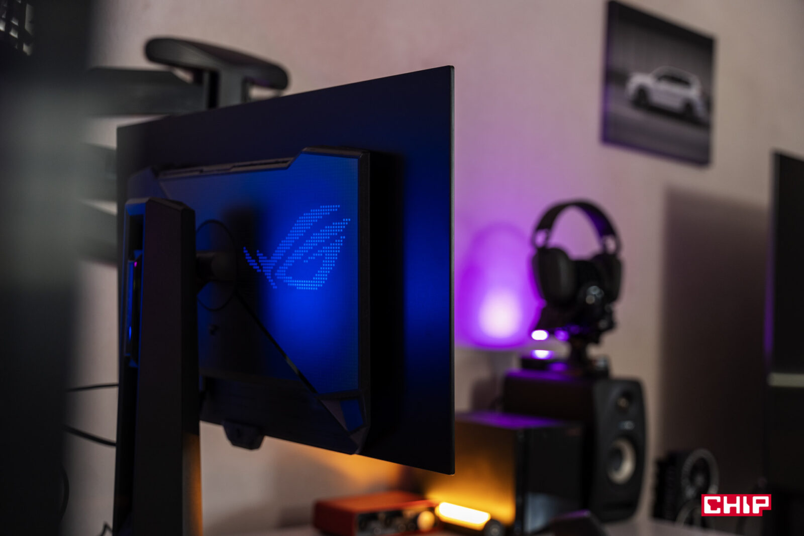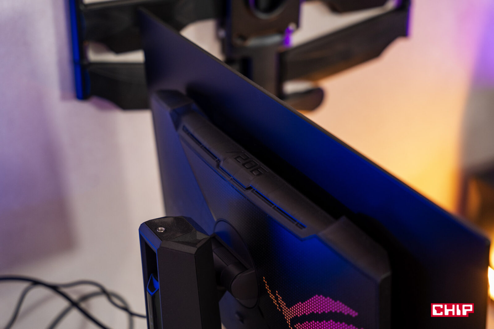 Z tyłu jest bardzo efektownie, bo widzimy tu jak cieniutki jest sam ekran, do którego elektronika wygląda wręcz jak przyklejona. W tym elemencie znajduje się specjalnie zaprojektowany radiator, który ma dbać o to, żeby monitor się nie przegrzewał w trakcie pracy. Tutaj też jest efektownie, bo mamy tu podświetlane logo ROG. Nie jest to jednak podświetlenie, które rozświetlałoby całą ścianę za monitorem, więc zazwyczaj niewiele z niego pożytku.