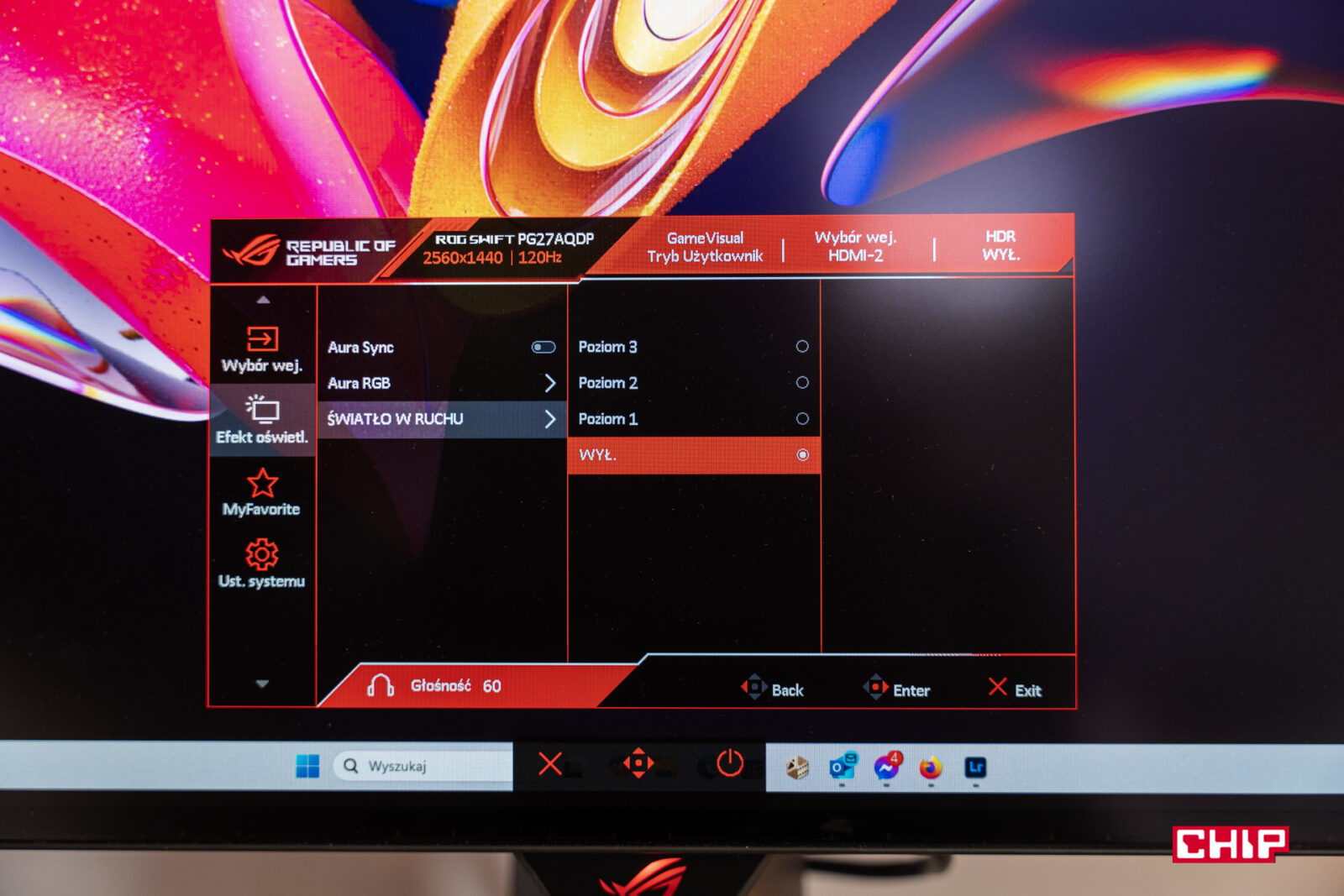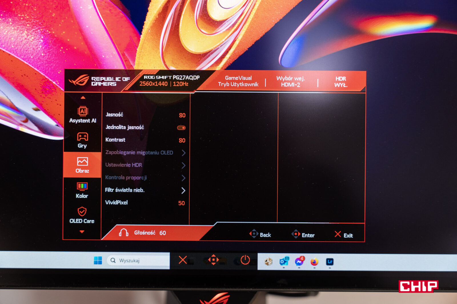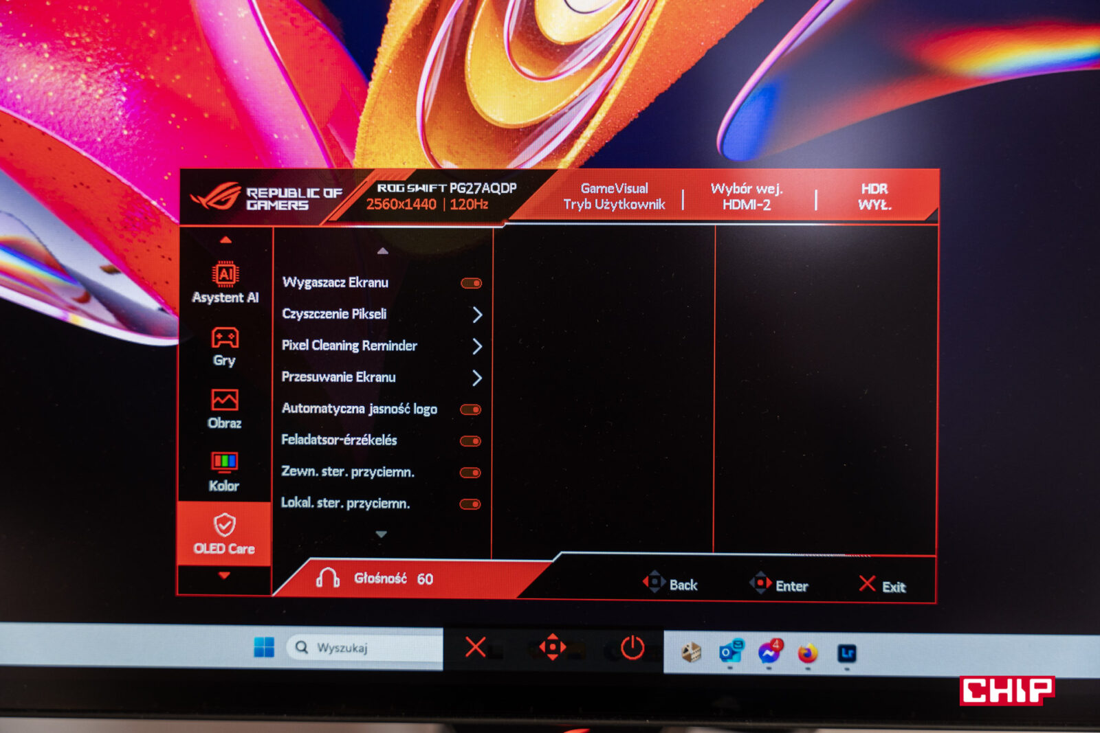 Asus dba, aby panel OLED jak najdłużej został w dobrej kondycji. Po użytkowaniu monitora przez kilka godzin, po jego wyłączeniu automatycznie odbywa się kalibracja ekranu. Po dwóch minutach bezczynności ekran jest lekko przygasany, a cały obraz cały czas delikatnie przesuwany, aby uniknąć efektu wypalania. Spokojnie, tego praktycznie nie da się zauważyć w trakcie użytkowania. Lekko przyciemniany jest też pasek zadań oraz inne stateczne elementy, jak logotypy. Podsumowując – ekran robi co może, żeby jak najdłużej oferować wysoką jakość obrazu, a jednocześnie, aby nie przeszkadzać nam w codziennym użytkowaniu.