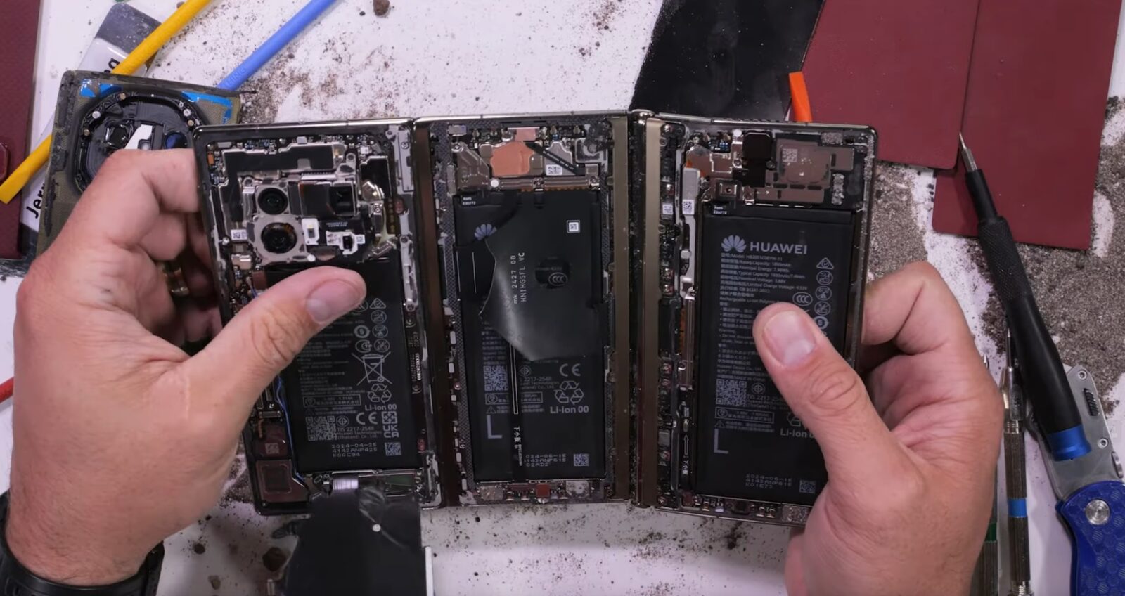 Ciekawie wygląda też wnętrze smartfonu. Huawei Mate XT ma aż trzy akumulatory i podzespoły rozłożone w każdej z trzech połówek obudowy.