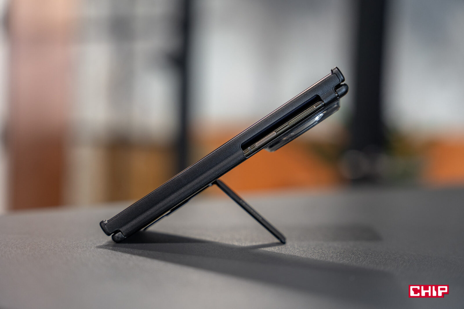 Huawei wpadł na fajny pomyśl i zaprojektował etui tak, żeby chroniło tę część ekranu i dodatkowo można nim zablokować możliwość rozkładania obudowy. Ktoś bardzo dobrze to przemyślał.