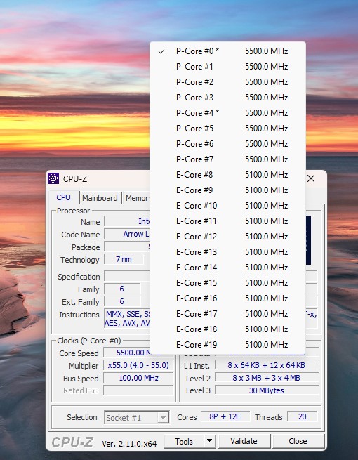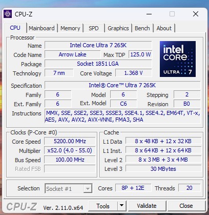 Intel Core Ultra 7 265K ma 8 rdzeni Performance (Lion Cove) oraz 12 rdzeni Efficient (Skymont). Mamy więc o 4 rdzenie mniej niż w przypadku 285K oraz identyczną konfigurację jak w przypadku i7-14700K. W stosunku do poprzedniego procesora mamy tylko 20 wątków – Intel zrezygnował z Hyper-threading. Maksymalne taktowanie rdzeni P wynosi 5,5 GHz (Turbo Boost Max Technology 3.0), turbo 5,4 GHz, przy obciążeniu wszystkich rdzeni to 5,2 GHz, a bazowe 3,9 GHz. W przypadku rdzeni E maksymalne taktowanie to 4,6 GHz, a bazowe 3,3 GHz. Warto zauważyć, że rdzenie E mają to samo taktowanie co w przypadku 285K. W stosunku do poprzednika mamy za to niższe zegary.