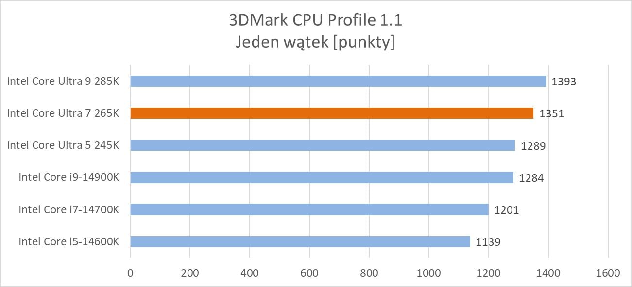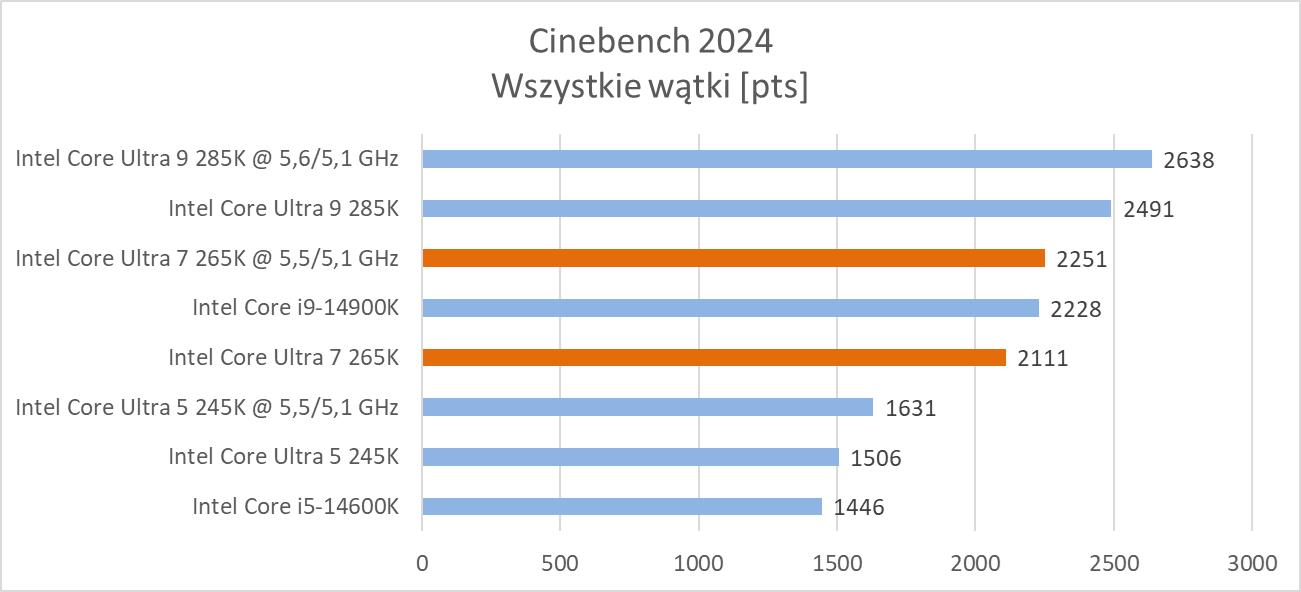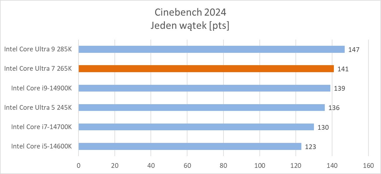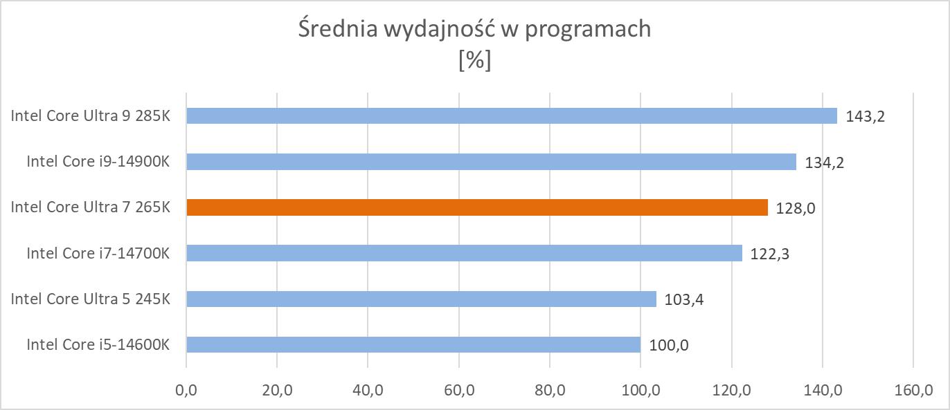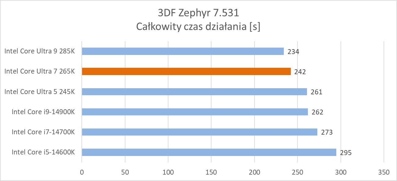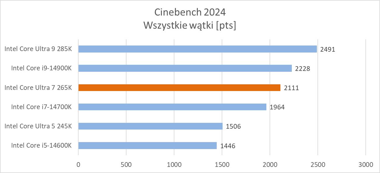 Intel Core Ultra 7 265K średnio wypada lepiej w programach niż i7-14700K. Mamy przewagę nawet nad i9-14900K w 3DF Zephyr, 3DMark CPU Profile, Handbrake, POV-Ray czy JetStream. Nad samym i7-14700K widzimy przewagę choćby w V-Ray, Y-Cruncher, Speedometer czy Coronie. Zdarzą się jednak też takie programy jak 3D Particle Movement, 7-zip, DigiCortex czy Dolphin gdzie mamy niższą wydajność. Generalnie jednak średni przyrost wydajności we wszystkich programach jest widoczny, choć mógłby być on większy. Plus za to za pobór mocy, który w wielowątkowym Cinebench 2024 jest niższy niż i5-14600K.