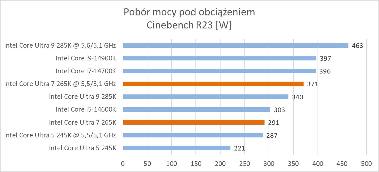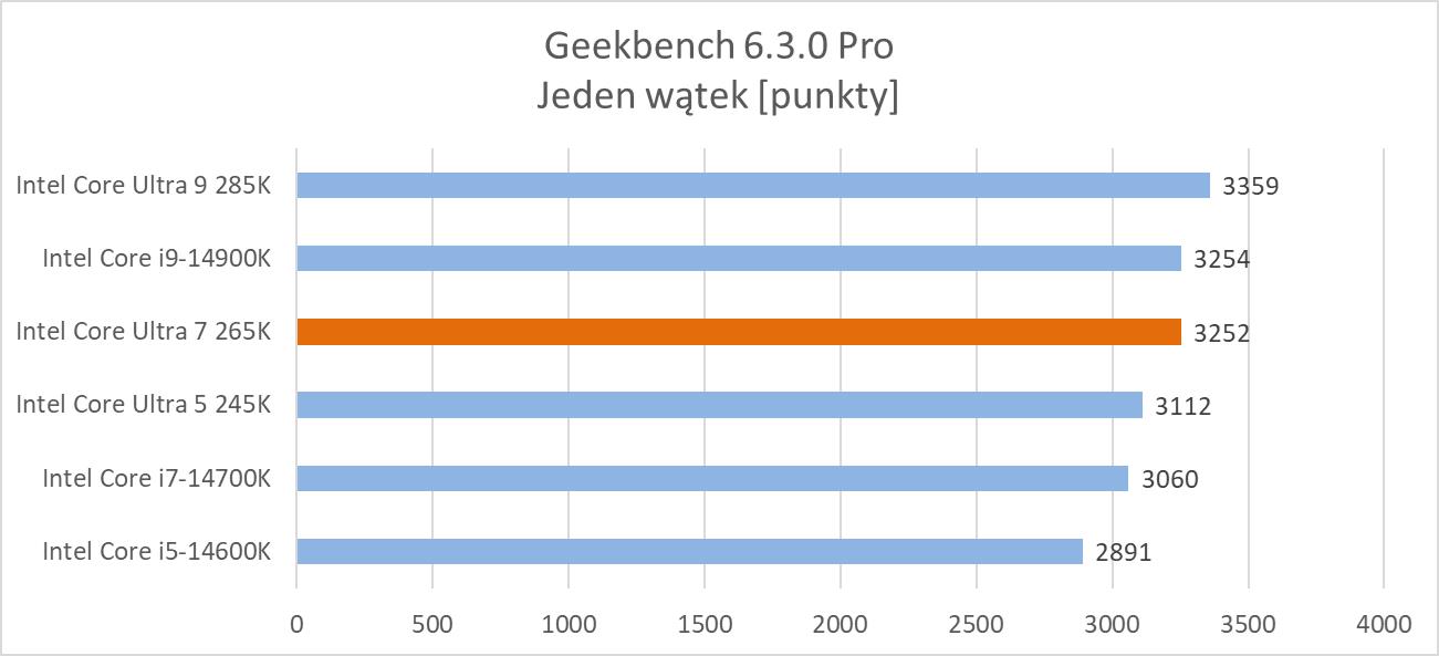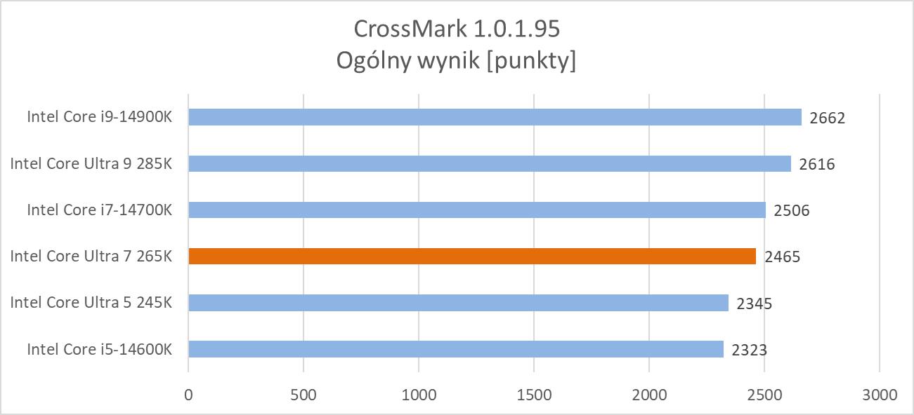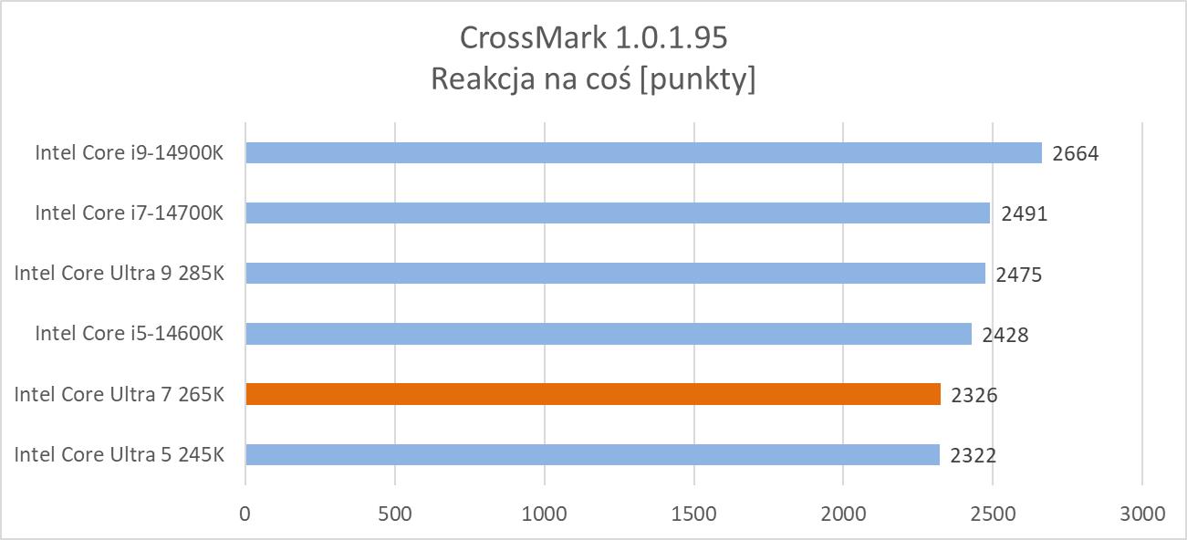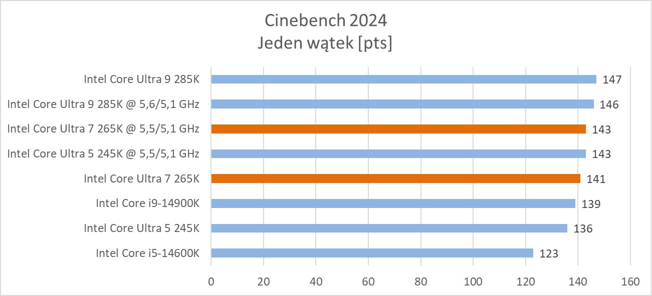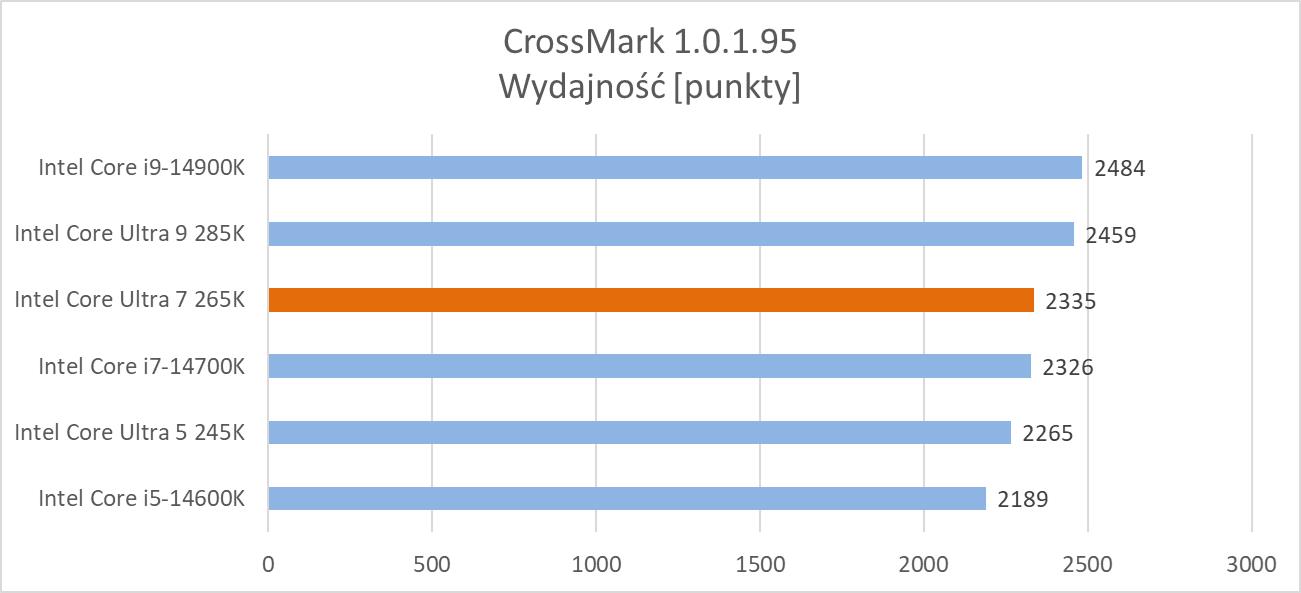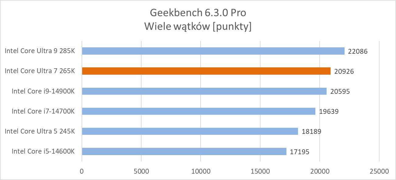Intel Core Ultra 7 265K średnio wypada lepiej w programach niż i7-14700K. Mamy przewagę nawet nad i9-14900K w 3DF Zephyr, 3DMark CPU Profile, Handbrake, POV-Ray czy JetStream. Nad samym i7-14700K widzimy przewagę choćby w V-Ray, Y-Cruncher, Speedometer czy Coronie. Zdarzą się jednak też takie programy jak 3D Particle Movement, 7-zip, DigiCortex czy Dolphin gdzie mamy niższą wydajność. Generalnie jednak średni przyrost wydajności we wszystkich programach jest widoczny, choć mógłby być on większy. Plus za to za pobór mocy, który w wielowątkowym Cinebench 2024 jest niższy niż i5-14600K.