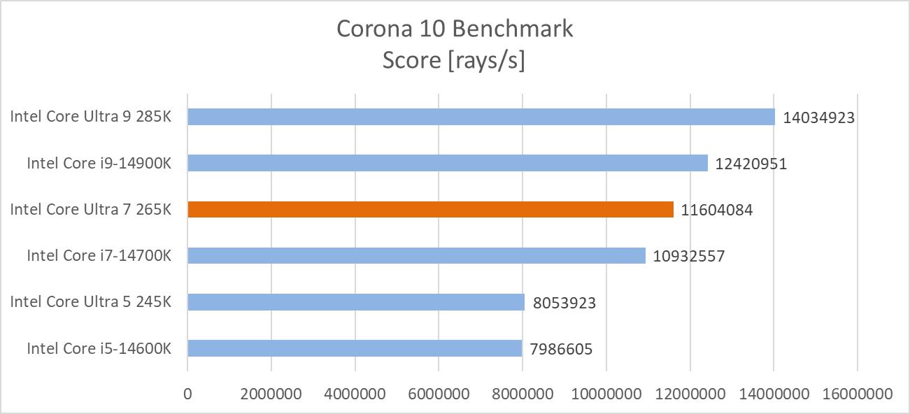 Silnik renderujący Corona dostępny jest Autodesk 3ds Max oraz Cinema 4D. Co ważne, nie wspiera on GPU, więc wydajność CPU jest tutaj kluczowa. W testach skorzystaliśmy z benchmarka przygotowanego przez twórców, który dobrze sprawdza się w praktyce.