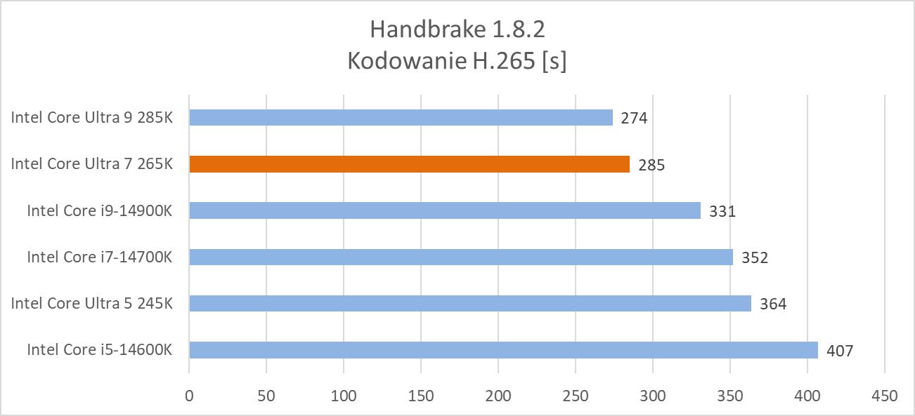Handbrake pozwala na konwersję filmów do niemal wszystkich formatów. Jest on też dostępny za darmo praktycznie na wszystkie platformy, stąd jego duża popularność. W teście sprawdziliśmy czas konwersji filmu .mp4 o długości 10 minut i 33 sekund do H.264 i H.265 (1080p30).