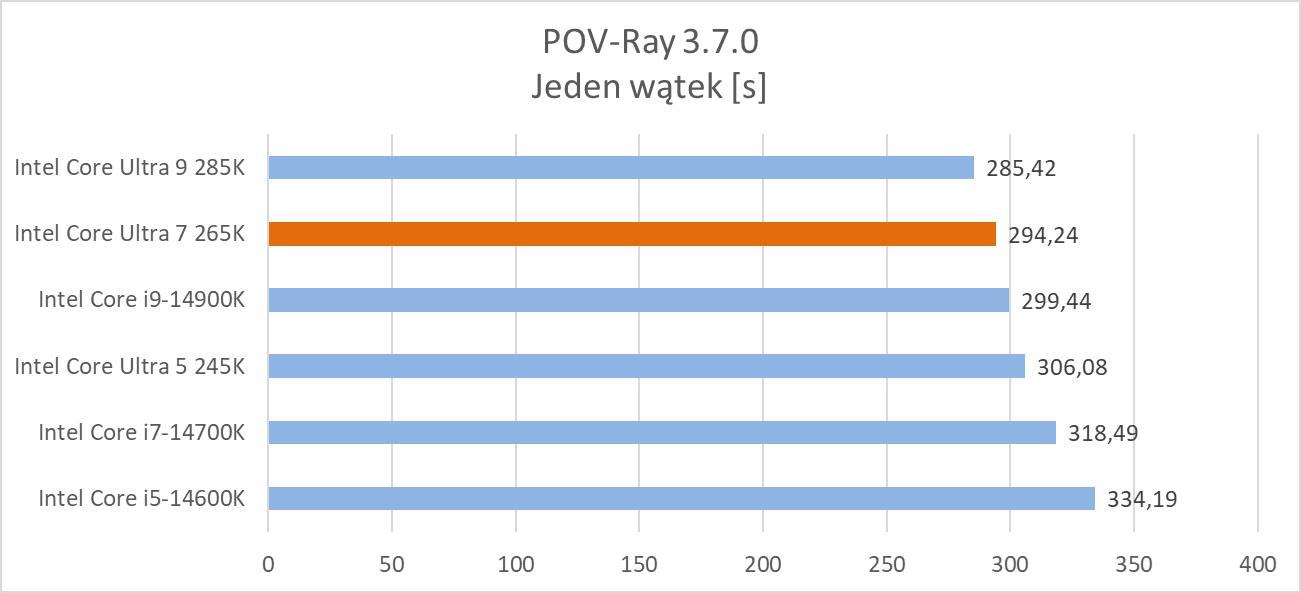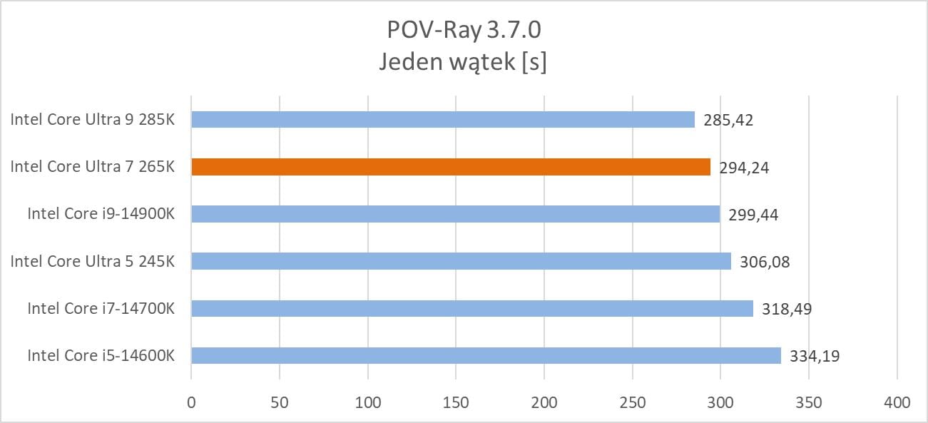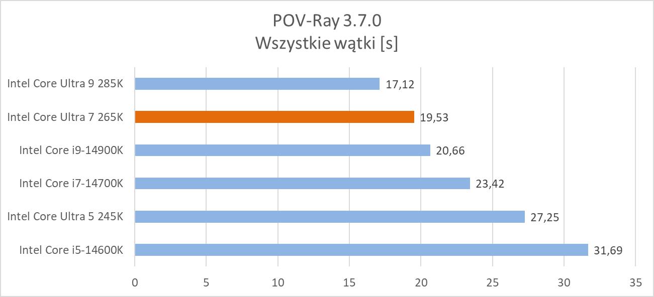 POV-Ray to kolejny program mający wbudowany benchmark. Tym razem pozwala on na tworzenie obrazów z wykorzystaniem ray tracingu i służy głównie do tworzenia grafiki 3D. W testach wykorzystaliśmy benchmark jedno i wielowątkowy.