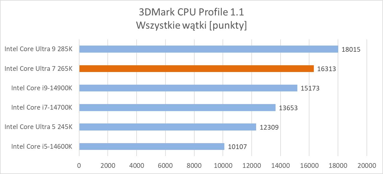 3DMark to jeden z najpopularniejszych benchmarków na świecie. Twórcy wprowadzili do niego CPU Profile, który sprawdza wydajność przy obciążeniu różnej ilości wątków. Zebraliśmy tutaj wyniki dla jednego oraz maksymalnej ilości wątków.