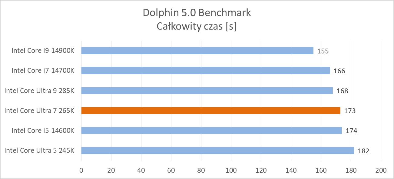Dolphin pozwala na emulowanie dwóch konsol Nintendo: Wii i GameCube. Dzięki niemu można grać w gry konsolowe w rozdzielczości 1920 x 1080 na komputerze. Wykorzystaliśmy benchmark CPU, a wynik to całkowity czas działania.