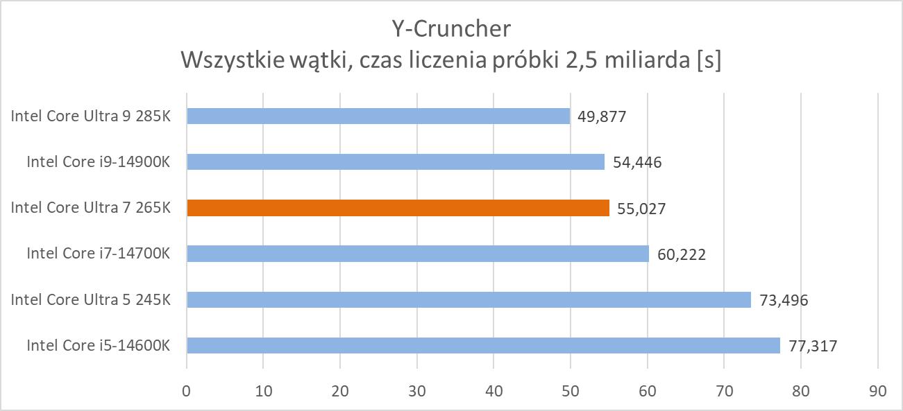Y-Cruncher to benchmark pozwalający na zmierzenie wydajności liczenia liczby Pi przy wykorzystaniu wszystkich wątków procesora. Pozwala to dobrze na porównanie wielowątkowej wydajności różnych konstrukcji. Tutaj wykorzystaliśmy próbkę 2,5 miliarda.
