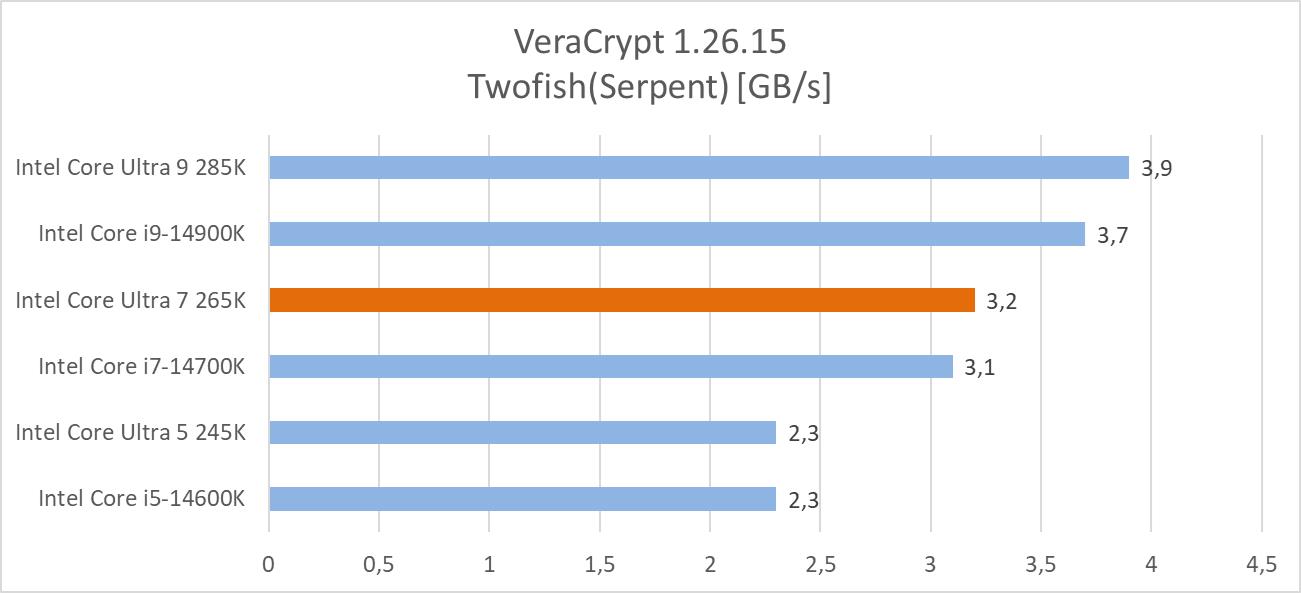VeraCrypt to oficjalny następca TruCrypt. Jest to oprogramowanie open-source więc nie ma co się dziwić, że jest naprawdę popularny. Program ma wbudowany benchmark, który wykorzystaliśmy w sprawdzeniu wydajności procesorów. Na wykresach poniżej znajdziecie średnie wyniki dwóch testów: Twofish(Serpent) oraz Kuznyechik(Serpent(Camellia)).