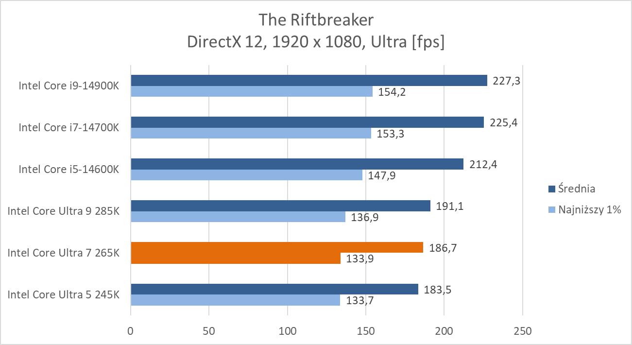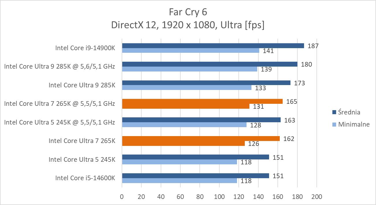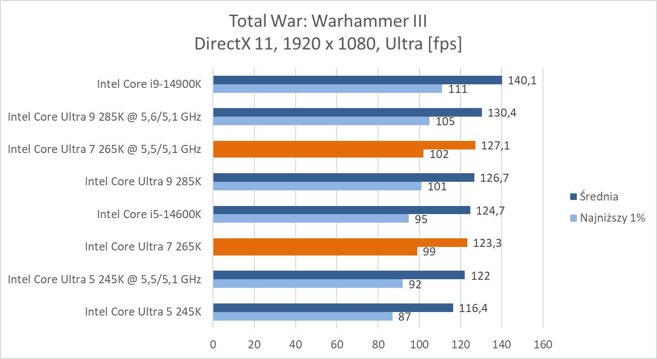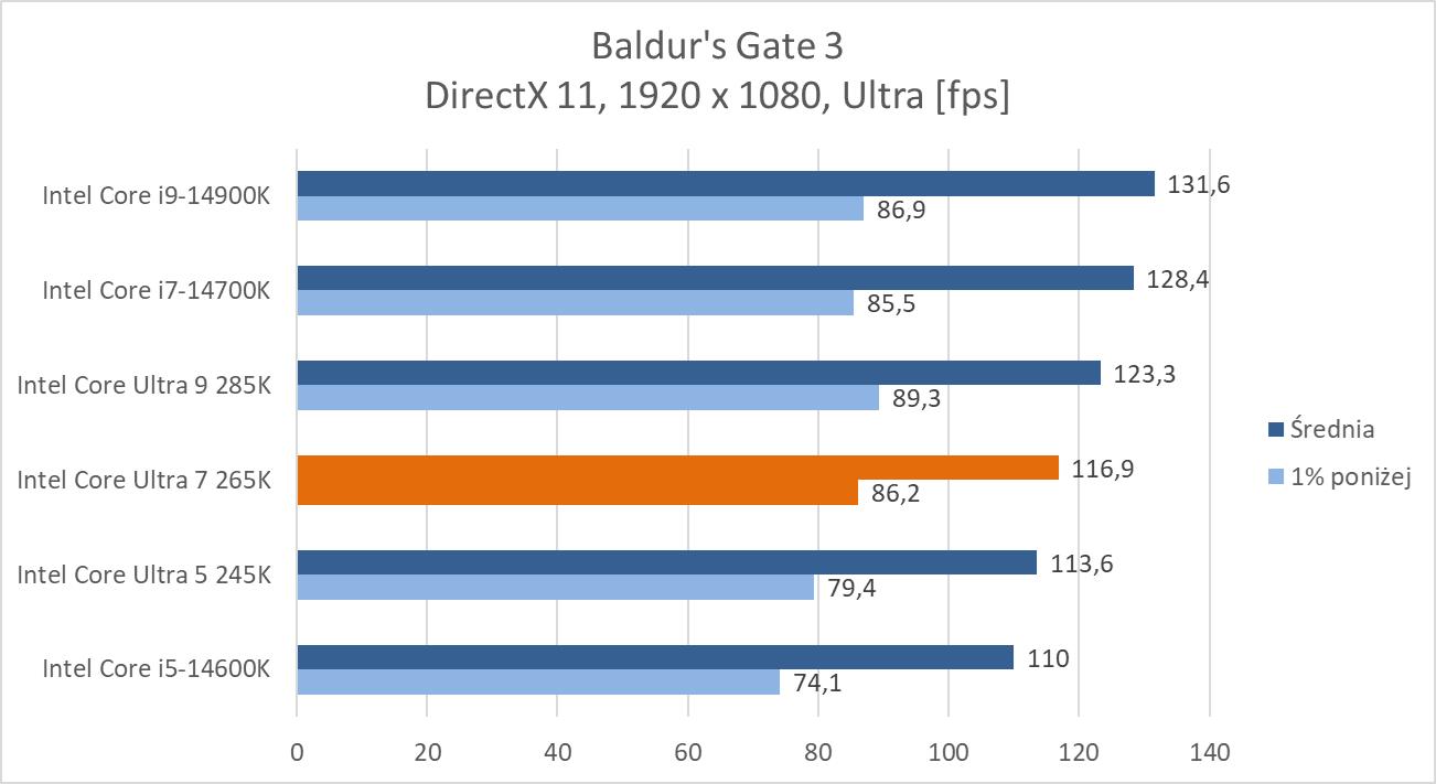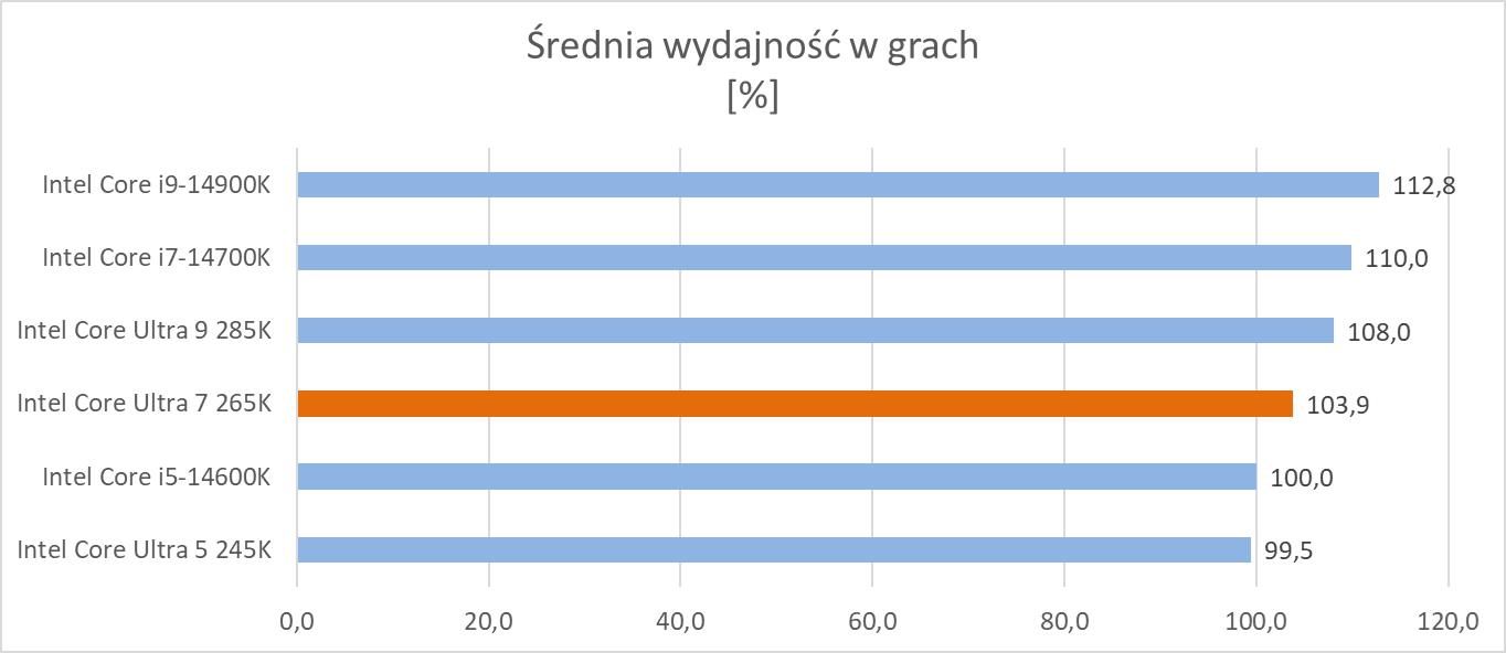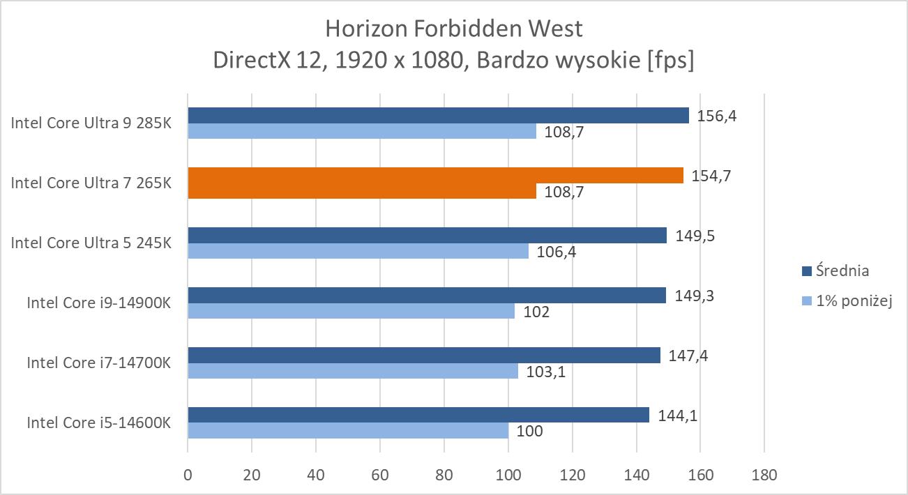 W grach procesor wypada za to znacznie słabiej od i7-14700K i tutaj jego wydajność sprawia zawód. Mamy co prawda wyjątki w postaci Horizona czy Cywilizacji, gdzie wydajność jest wyższa od i9-14900K, ale z drugiej strony jest Cyberpunk, Total Wara czy Riftbreakera, gdzie mamy wyniki poniżej i5-14600K. Nie jest więc to wydajność, której oczekiwaliby gracze po nowym procesorze. Plus oczywiście za naprawdę niski pobór mocy. Intel też chwali się APO (Application Optimization), przy którym sam wykonywał testy pokazywane w sieci. Niestety jednak w naszym przypadku APO nie było kompatybilne po jego włączeniu z żadną grą wykorzystaną w testach.