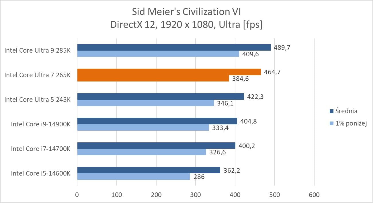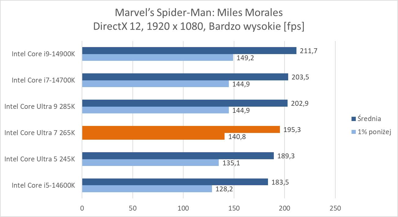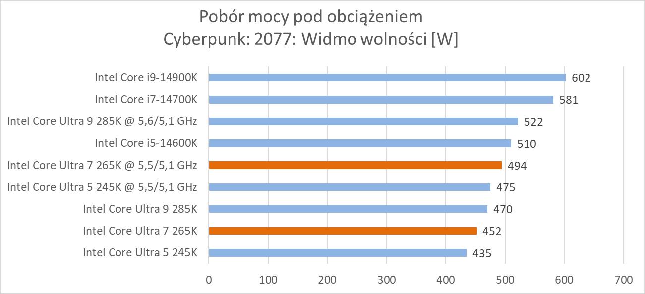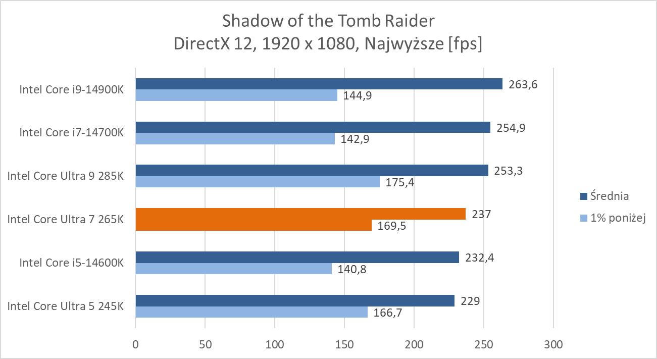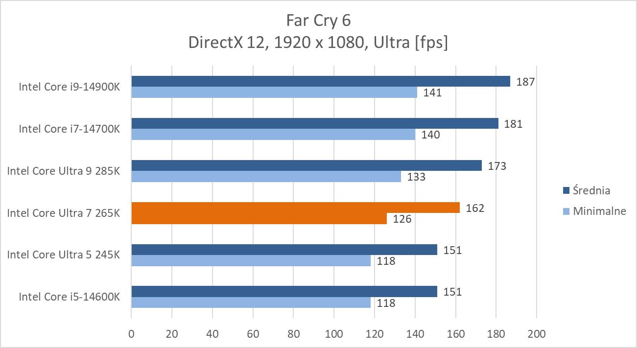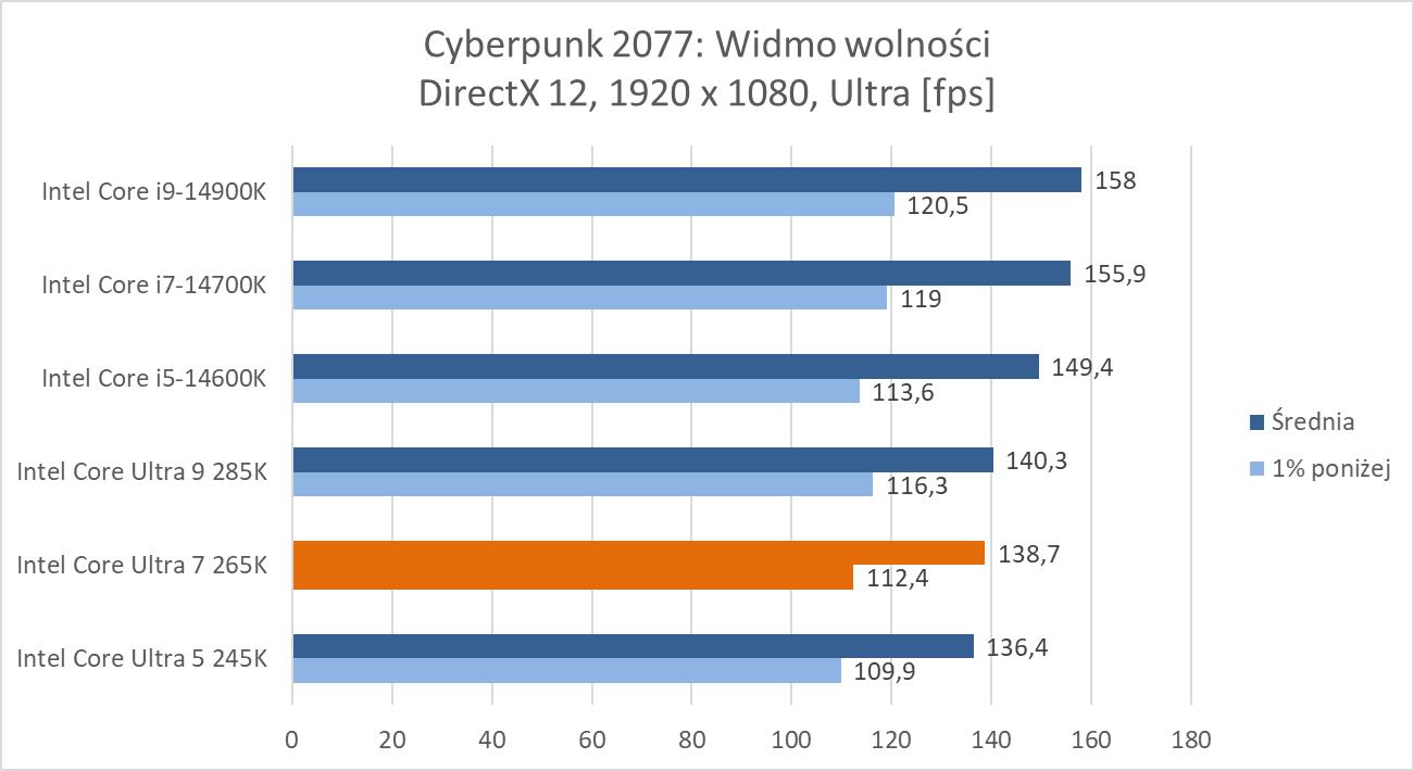W grach procesor wypada za to znacznie słabiej od i7-14700K i tutaj jego wydajność sprawia zawód. Mamy co prawda wyjątki w postaci Horizona czy Cywilizacji, gdzie wydajność jest wyższa od i9-14900K, ale z drugiej strony jest Cyberpunk, Total Wara czy Riftbreakera, gdzie mamy wyniki poniżej i5-14600K. Nie jest więc to wydajność, której oczekiwaliby gracze po nowym procesorze. Plus oczywiście za naprawdę niski pobór mocy. Intel też chwali się APO (Application Optimization), przy którym sam wykonywał testy pokazywane w sieci. Niestety jednak w naszym przypadku APO nie było kompatybilne po jego włączeniu z żadną grą wykorzystaną w testach.