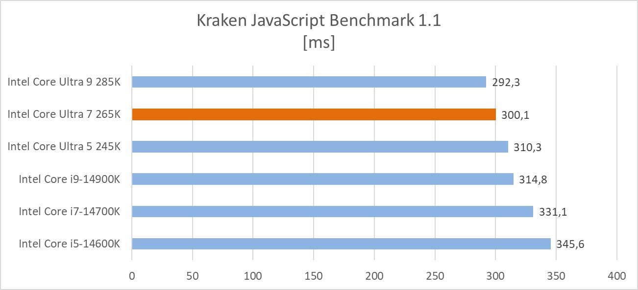 Kolejny benchmark porównuje wydajność w złożonych obliczeniach opartych o JavaScript. Wynik ma kilka różnych składników i podawany jest w milisekundach – interesuje nas całkowity rezultat. W testach wykorzystaliśmy przeglądarkę Google Chrome.