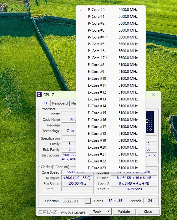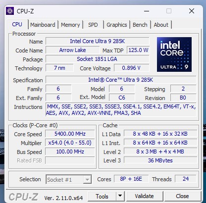 Testowana jednostka ma 8 rdzeni Performance (Lion Cove) oraz 16 rdzeni Efficient (Skymont). Nie ma więc różnic względem i9-14900K. Mamy za to 24 wątki zamiast 32. Intel w nowej generacji procesorów zrezygnował z Hyper-threadingu i zobaczymy, czy to była dobra decyzja. Maksymalne taktowanie rdzeni P wynosi 5,7 GHz (Thermal Velocity Boost), 5,6 GHz (Turbo Boost Max Technology 3.0), turbo 5,5 GHz, a przy obciążeniu wszystkich rdzeni to 5,4 GHz. Bazowe wynosi 3,7 GHz. W przypadku rdzeni E maksymalne taktowanie to 4,6 GHz, a bazowe 3,2 GHz. Mamy więc również niższe taktowanie rdzeni P, choć wyższe w przypadku E. Procesor należy do rodziny Arrowe Lake.