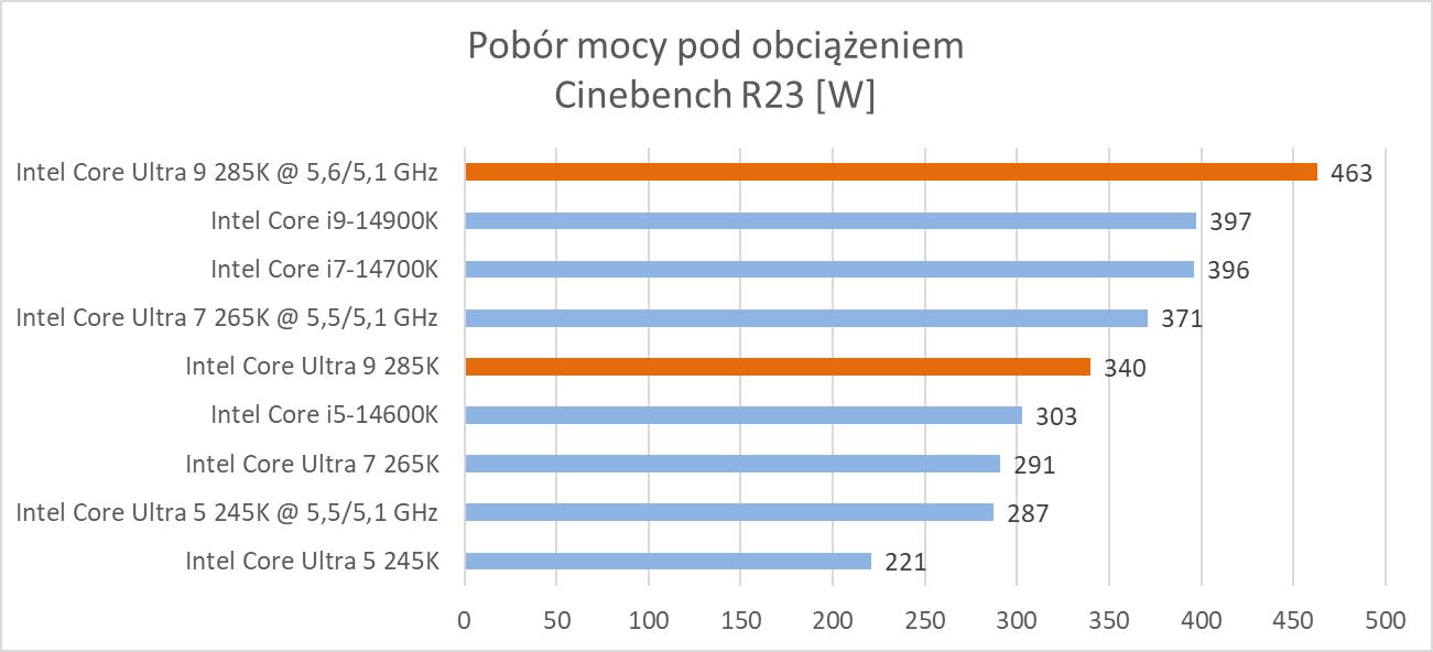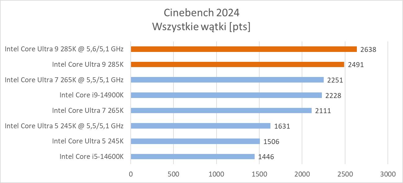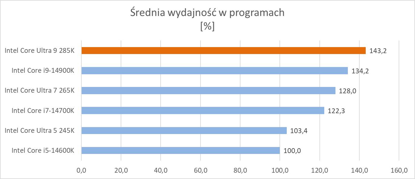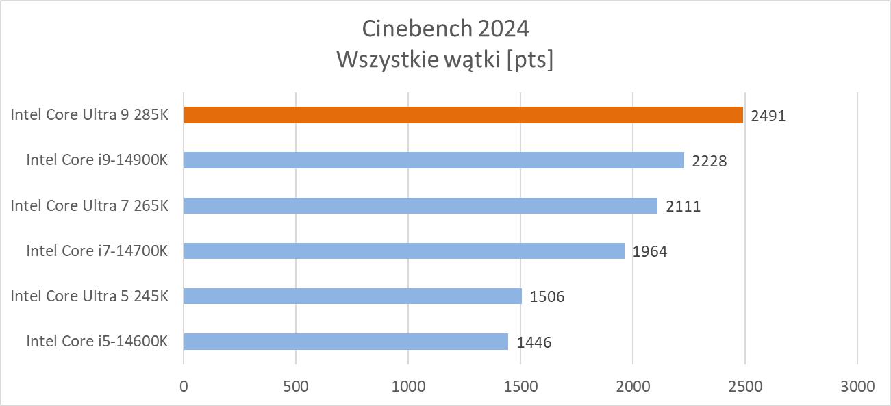 Intel Core Ultra 9 285K wygrywa w większości programów z i9-14900K, co widać też po średniej wydajności. Mamy więc przewagę choćby w 3DF Zephyrze, Blenderze, Cinebenchu, Coronie, Handbrake, VeraCrypt czy V-Rayu. Nie zawsze jednak przewaga jest duża i liczyliśmy na trochę wyższe wyniki. Są też programy, gdzie procesor przegrywa z poprzednikiem. Są to choćby 7-zip, CrossMark, DigiCortex czy Dolphin. Nie zawsze więc uzyskacie wzrost wydajności, choć generalnie mamy do czynienia z lepszym procesorem. Warto też zwrócić uwagę na pobór mocy w Cinebench 2024, gdzie mamy różnicę ok. 57 W na korzyść nowej konstrukcji.