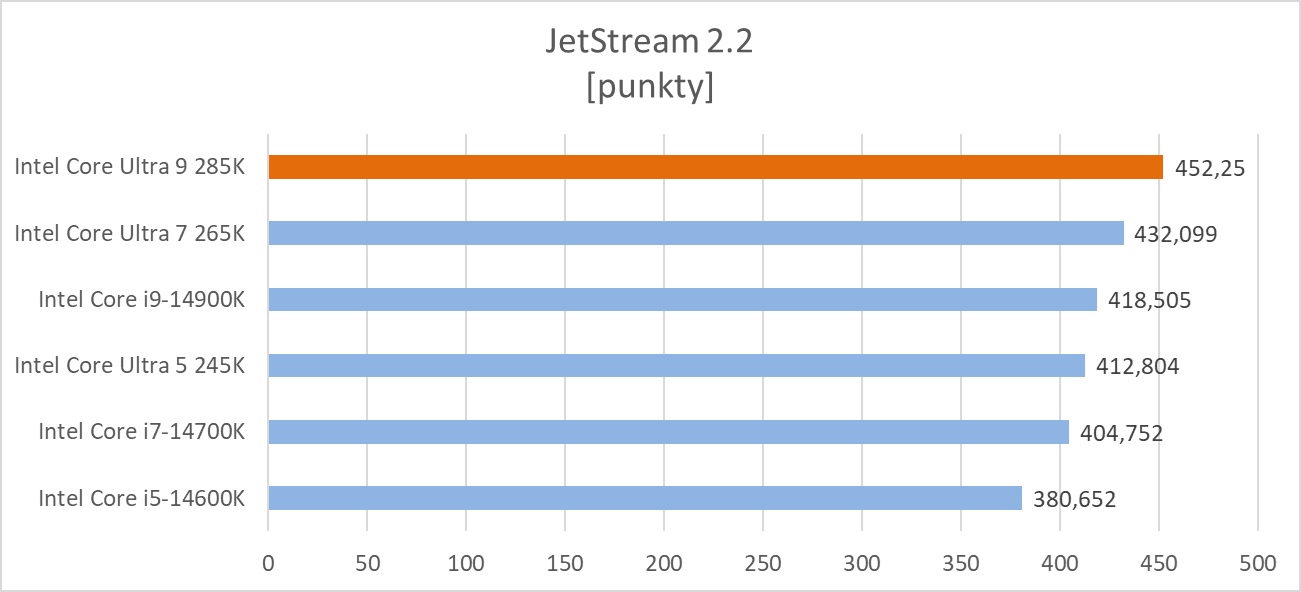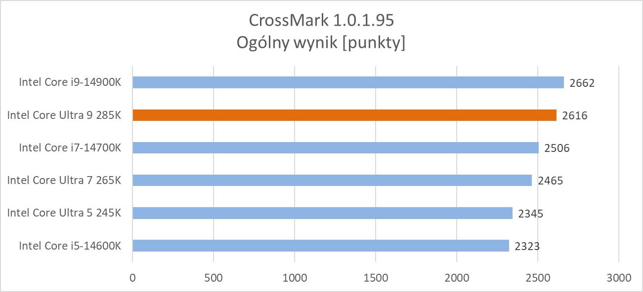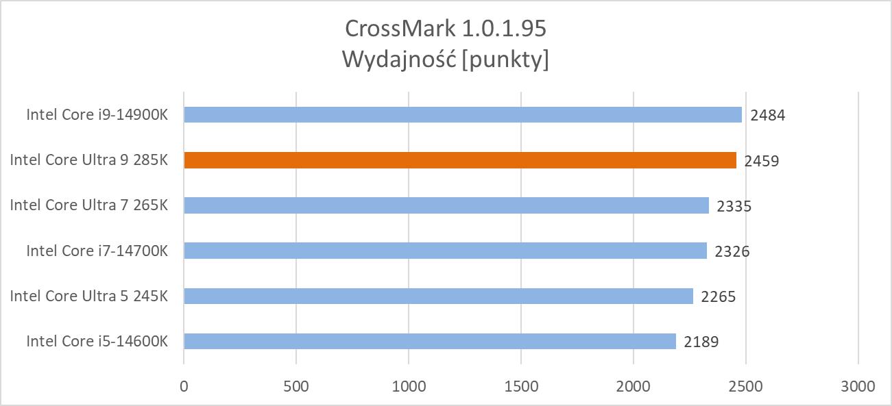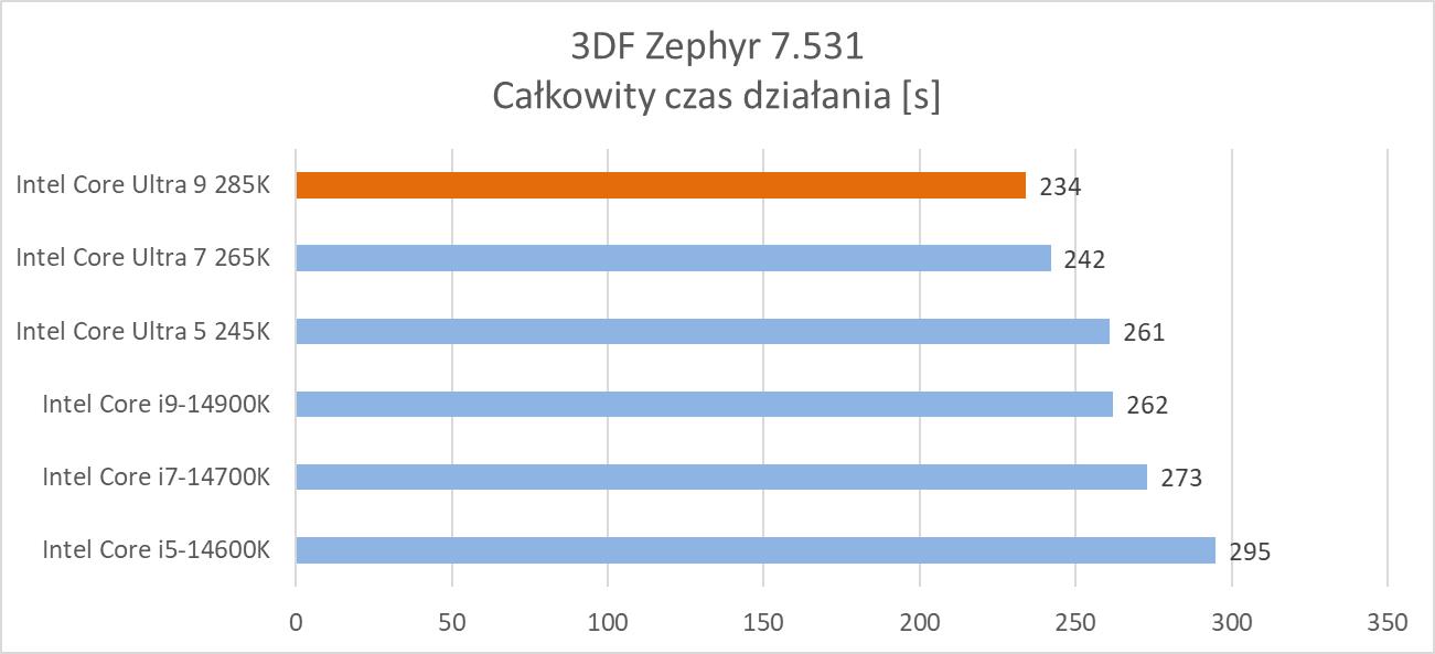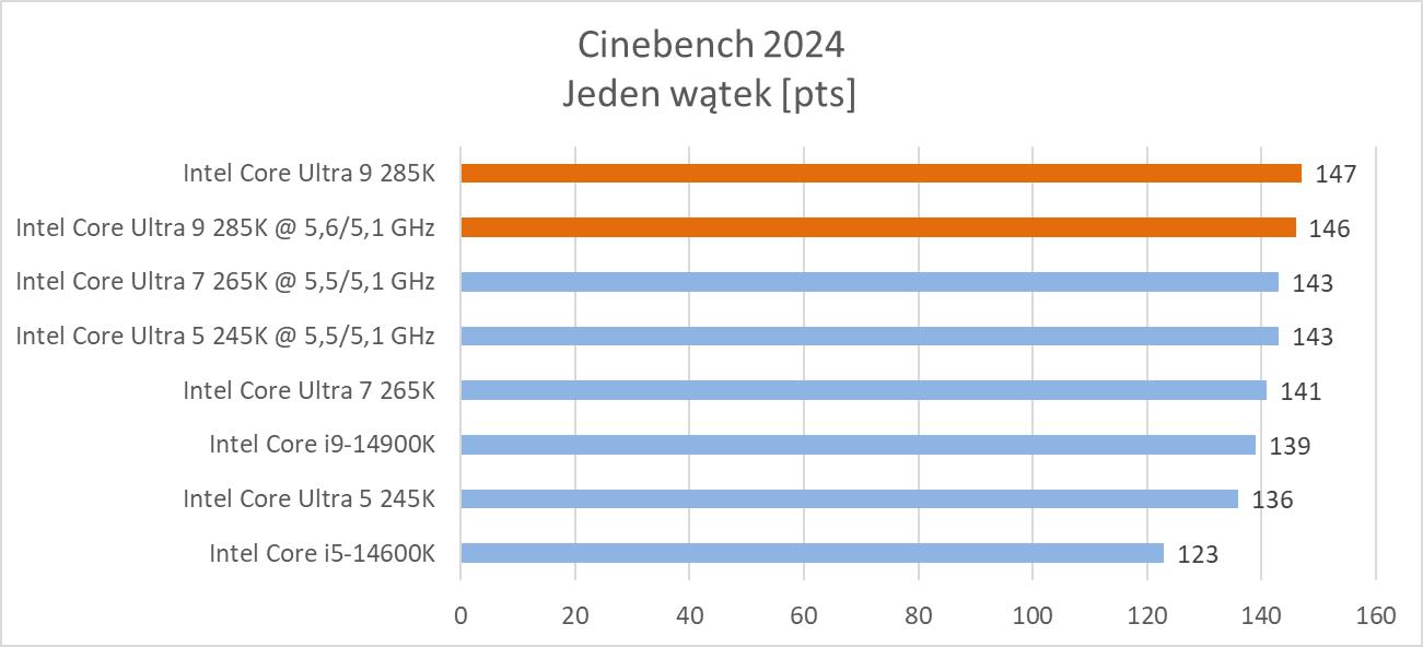 Intel Core Ultra 9 285K wygrywa w większości programów z i9-14900K, co widać też po średniej wydajności. Mamy więc przewagę choćby w 3DF Zephyrze, Blenderze, Cinebenchu, Coronie, Handbrake, VeraCrypt czy V-Rayu. Nie zawsze jednak przewaga jest duża i liczyliśmy na trochę wyższe wyniki. Są też programy, gdzie procesor przegrywa z poprzednikiem. Są to choćby 7-zip, CrossMark, DigiCortex czy Dolphin. Nie zawsze więc uzyskacie wzrost wydajności, choć generalnie mamy do czynienia z lepszym procesorem. Warto też zwrócić uwagę na pobór mocy w Cinebench 2024, gdzie mamy różnicę ok. 57 W na korzyść nowej konstrukcji.