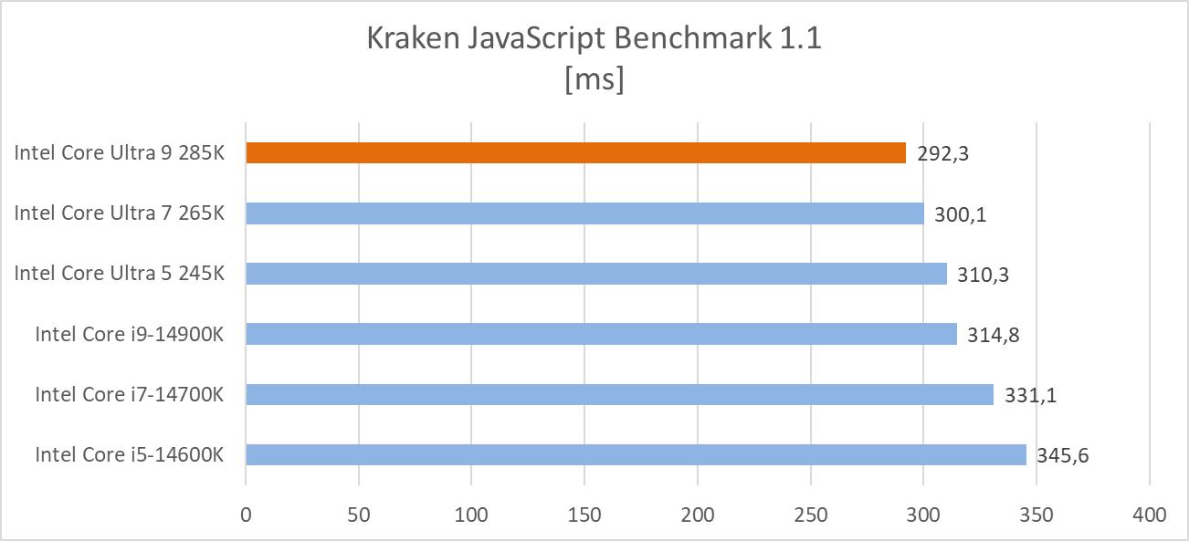 Kolejny benchmark porównuje wydajność w złożonych obliczeniach opartych o JavaScript. Wynik ma kilka różnych składników i podawany jest w milisekundach – interesuje nas całkowity rezultat. W testach wykorzystaliśmy przeglądarkę Google Chrome.