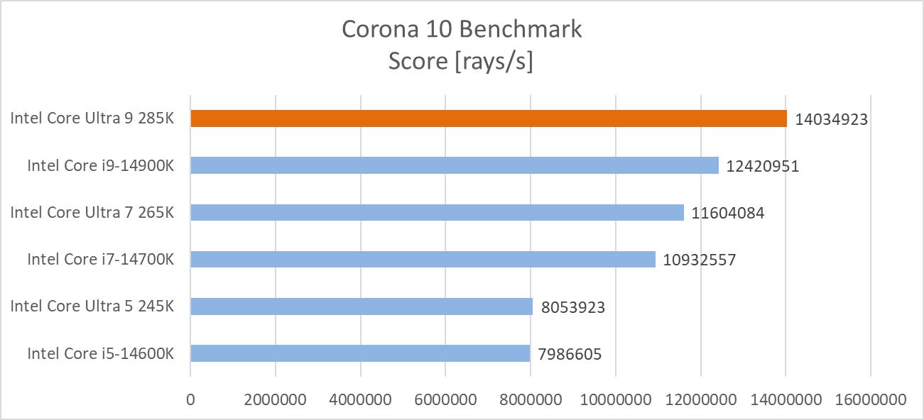 Silnik renderujący Corona dostępny jest Autodesk 3ds Max oraz Cinema 4D. Co ważne, nie wspiera on GPU, więc wydajność CPU jest tutaj kluczowa. W testach skorzystaliśmy z benchmarka przygotowanego przez twórców, który dobrze sprawdza się w praktyce.