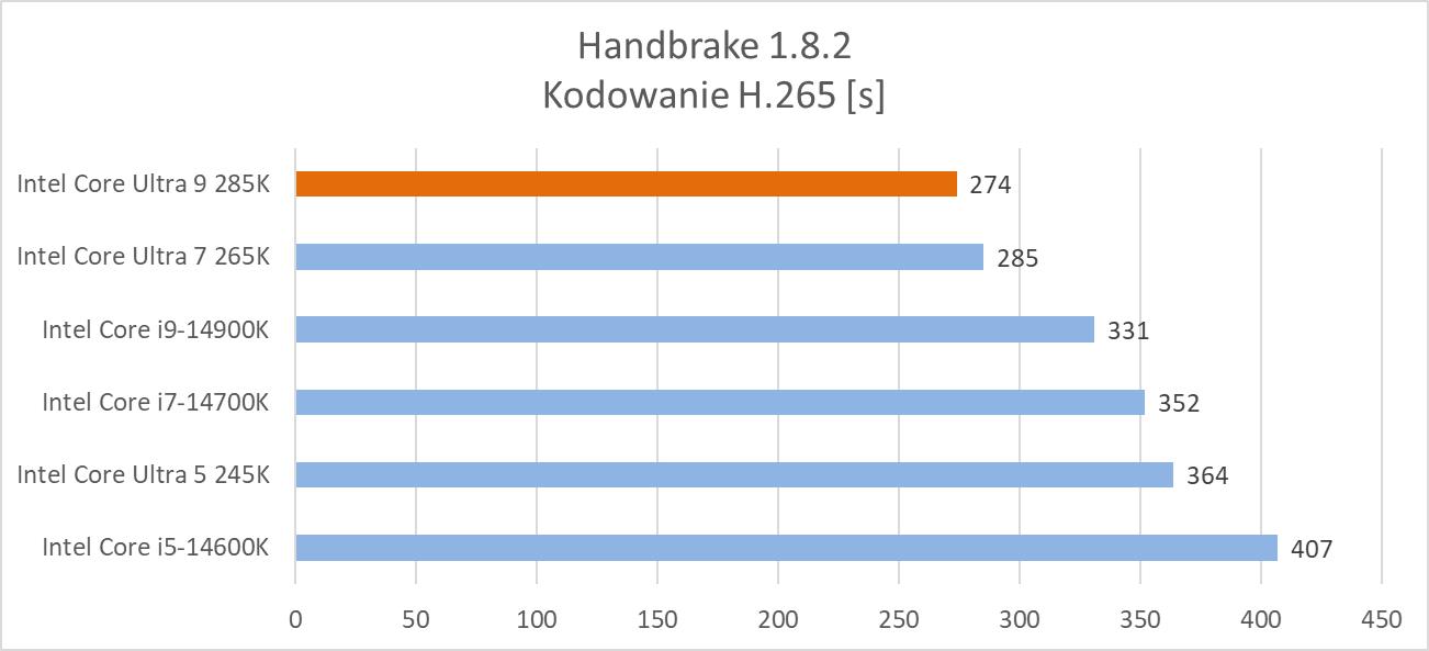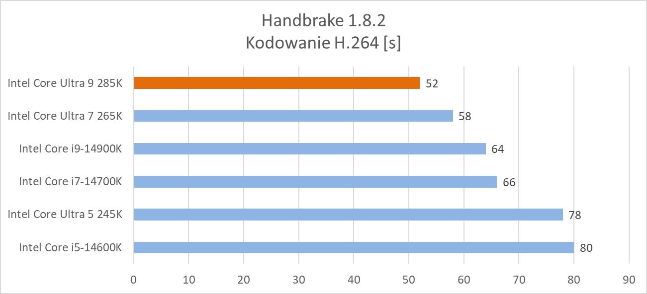 Handbrake pozwala na konwersję filmów do niemal wszystkich formatów. Jest on też dostępny za darmo praktycznie na wszystkie platformy, stąd jego duża popularność. W teście sprawdziliśmy czas konwersji filmu .mp4 o długości 10 minut i 33 sekund do H.264 i H.265 (1080p30).
