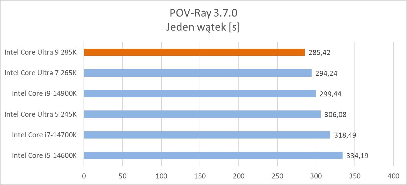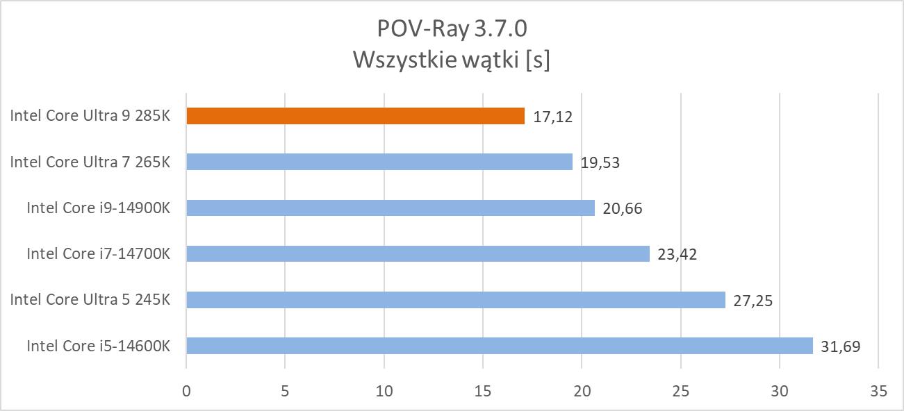 POV-Ray to kolejny program mający wbudowany benchmark. Tym razem pozwala on na tworzenie obrazów z wykorzystaniem ray tracingu i służy głównie do tworzenia grafiki 3D. W testach wykorzystaliśmy benchmark jedno i wielowątkowy.