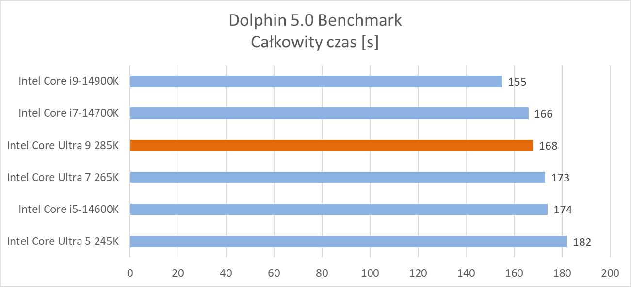 Dolphin pozwala na emulowanie dwóch konsol Nintendo: Wii i GameCube. Dzięki niemu można grać w gry konsolowe w rozdzielczości 1920 x 1080 na komputerze. Wykorzystaliśmy benchmark CPU, a wynik to całkowity czas działania.