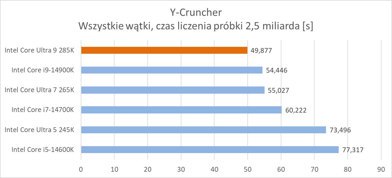 Y-Cruncher to benchmark pozwalający na zmierzenie wydajności liczenia liczby Pi przy wykorzystaniu wszystkich wątków procesora. Pozwala to dobrze na porównanie wielowątkowej wydajności różnych konstrukcji. Tutaj wykorzystaliśmy próbkę 2,5 miliarda.