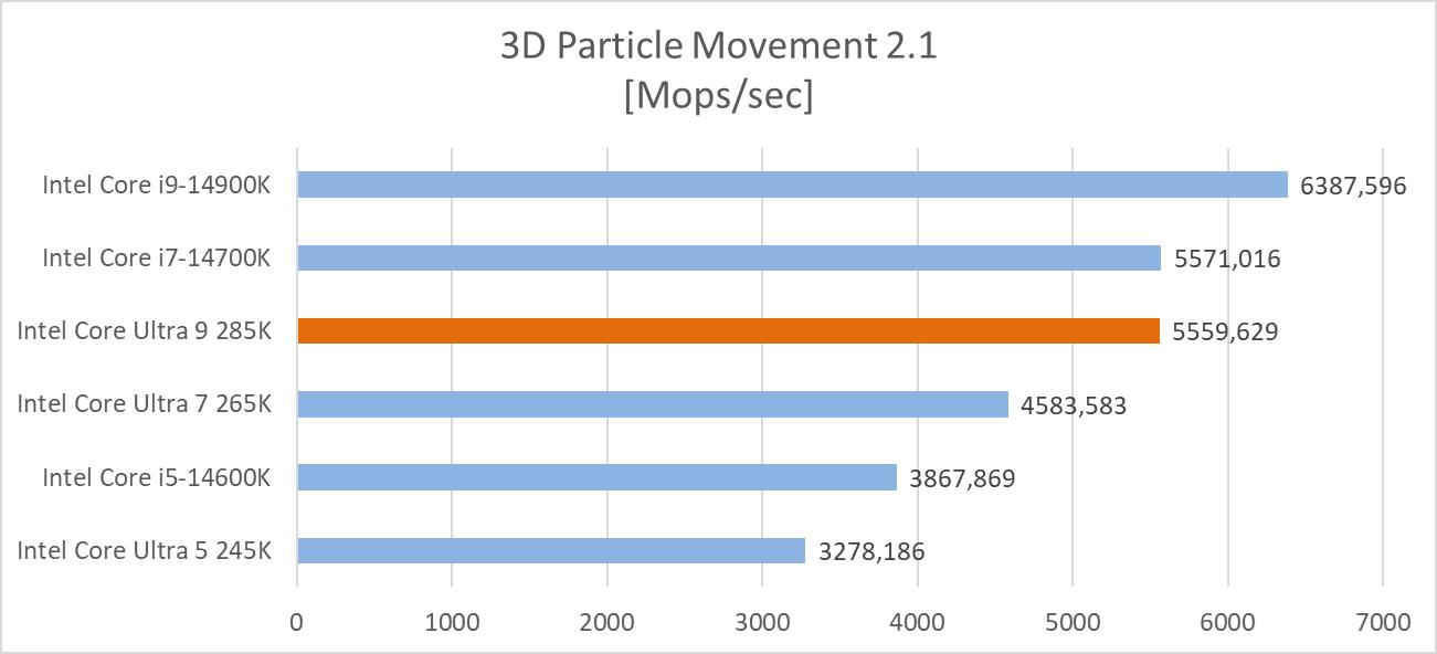 3DPM został opracowany przez serwis Anandtech. Symuluje on sześć różnych rodzajów ruchów cząstek w trójwymiarze. Poniżej znajdziecie ogólny wyniki testu podany jako mops/sec.