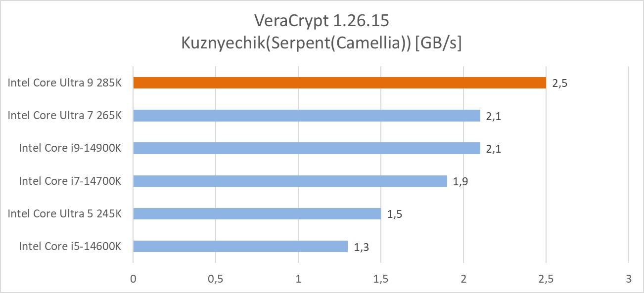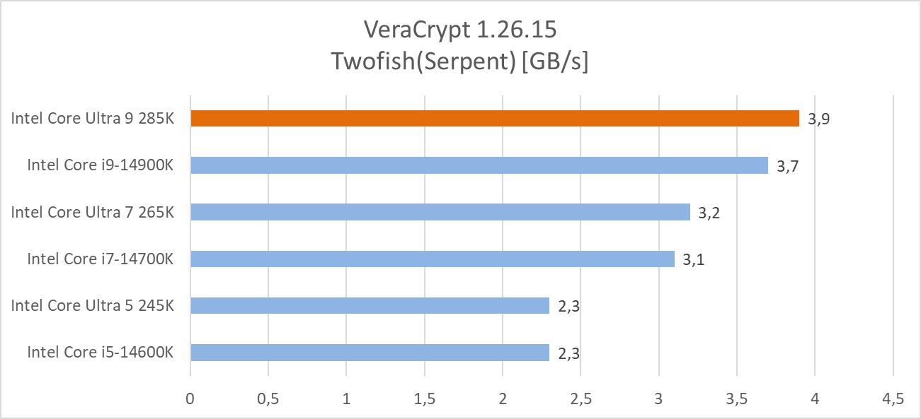 VeraCrypt to oficjalny następca TruCrypt. Jest to oprogramowanie open-source więc nie ma co się dziwić, że jest naprawdę popularny. Program ma wbudowany benchmark, który wykorzystaliśmy w sprawdzeniu wydajności procesorów. Na wykresach poniżej znajdziecie średnie wyniki dwóch testów: Twofish(Serpent) oraz Kuznyechik(Serpent(Camellia)).
