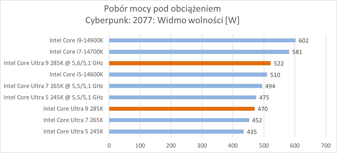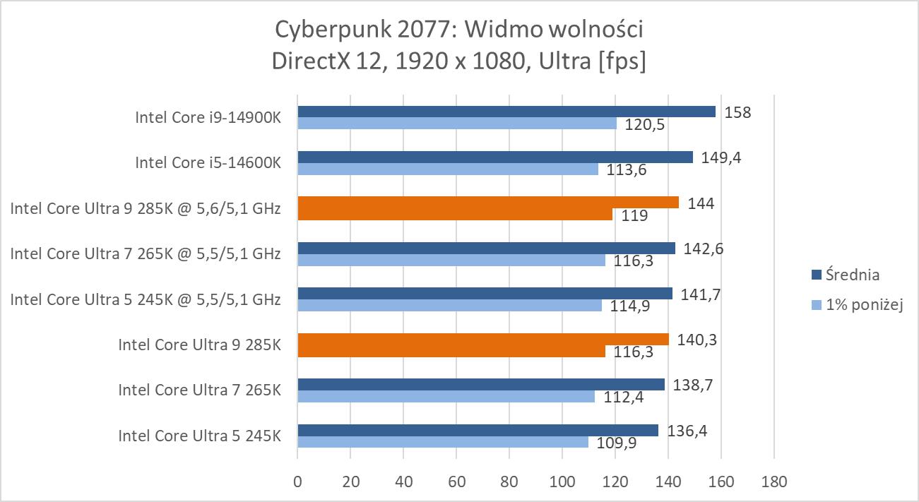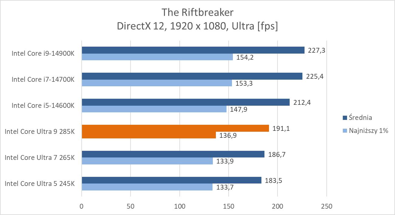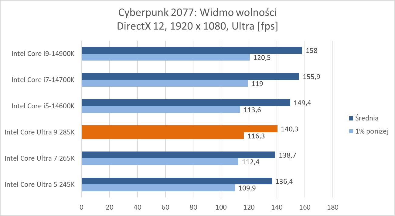 W grach mamy spory zawód i średnią wydajność niższą nawet od i7-14700K. Mamy wyjątki jak Cywilizację czy nowego Horizona, gdzie jest Intel Core Ultra 9 285K oferuje najlepszą wydajność. Po drugiej stronie jest Cyberpunk czy Riftbreaker, gdzie ląduje on nawet poniżej i5-14600K. W pozostałych grach plasuje się on pomiędzy procesorami. Nie jest to więc wydajność, jakiej oczekiwali by gracze. Plus jednak za pobór mocy w grach niższy nawet niż i5-14600K. To z pewnością zaleta CPU, ale jednak mógłby on oferować lepszą wydajność. Intel chwali się też Application Optimization, który podniesie wydajność w kompatybilnych tytułach i takie też wyniki pokazywał na swoich wykresach, ale w momencie wykonywania testu żadna z gier wykorzystanych w testach nie była obecna na liście po włączeniu tej funkcji.