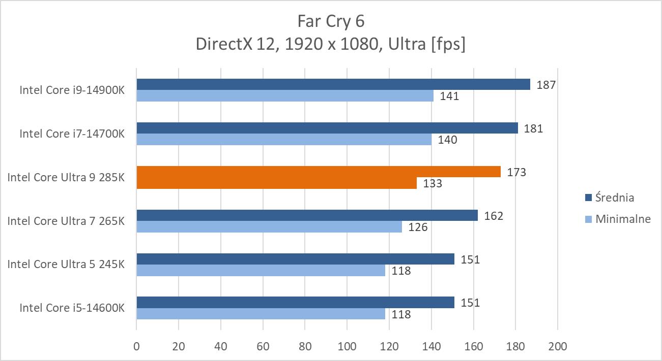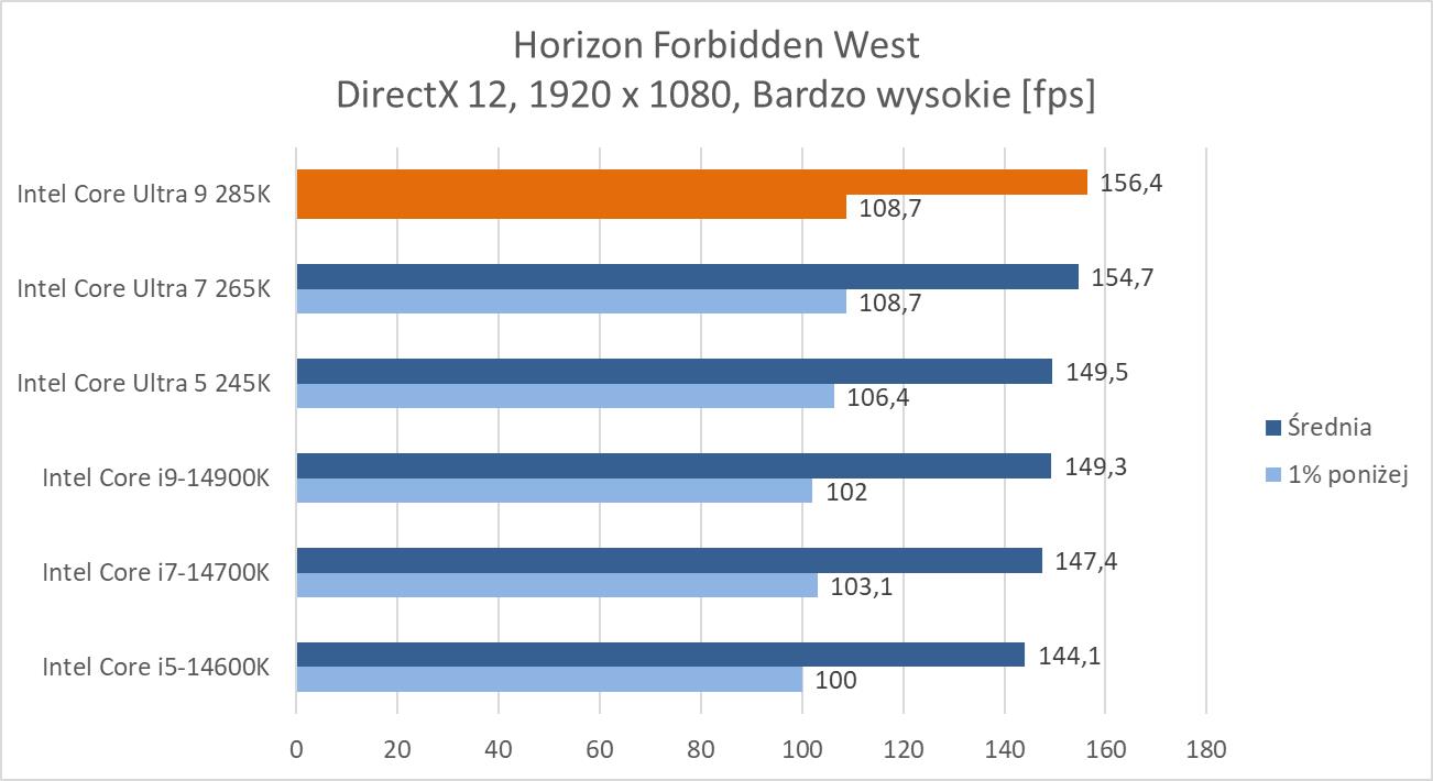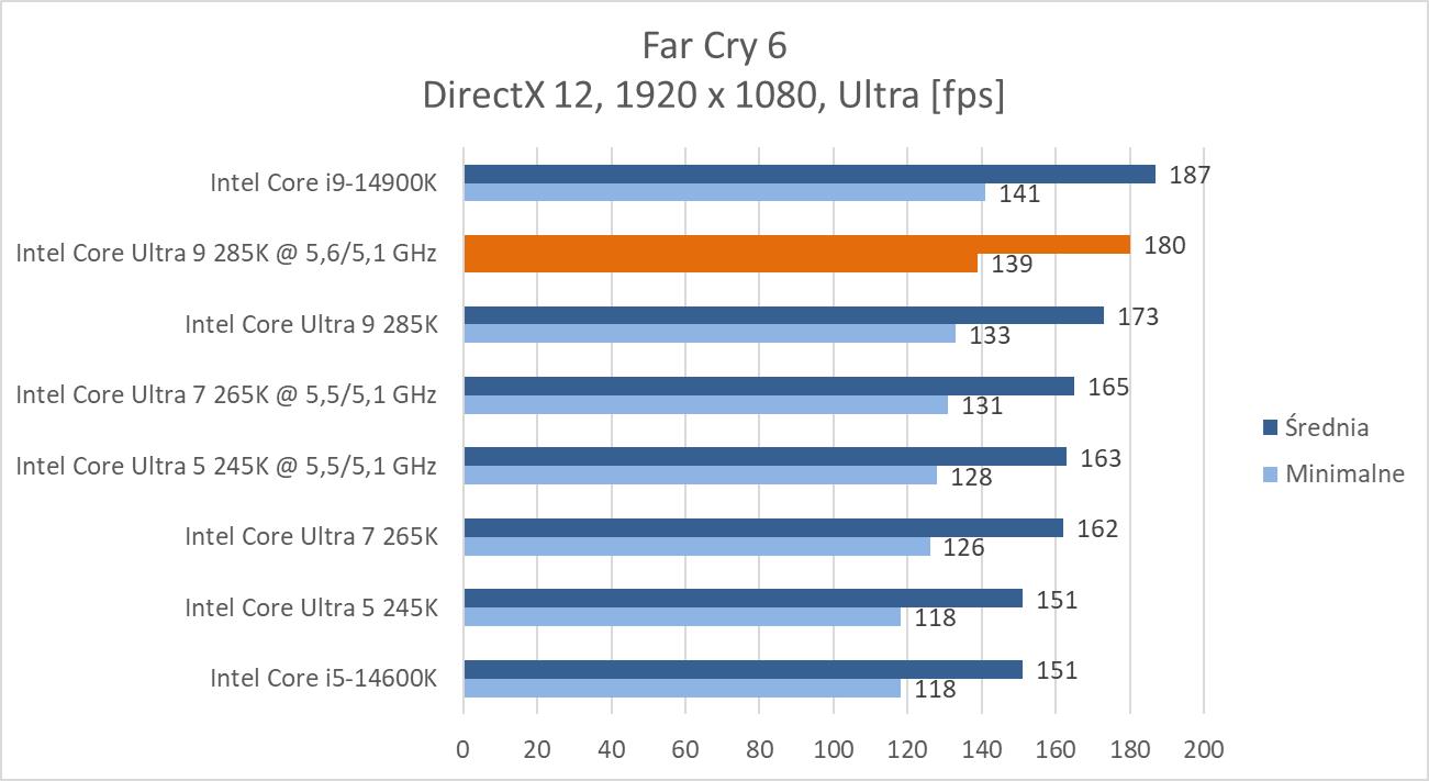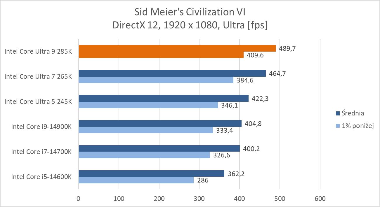W grach mamy spory zawód i średnią wydajność niższą nawet od i7-14700K. Mamy wyjątki jak Cywilizację czy nowego Horizona, gdzie jest Intel Core Ultra 9 285K oferuje najlepszą wydajność. Po drugiej stronie jest Cyberpunk czy Riftbreaker, gdzie ląduje on nawet poniżej i5-14600K. W pozostałych grach plasuje się on pomiędzy procesorami. Nie jest to więc wydajność, jakiej oczekiwali by gracze. Plus jednak za pobór mocy w grach niższy nawet niż i5-14600K. To z pewnością zaleta CPU, ale jednak mógłby on oferować lepszą wydajność. Intel chwali się też Application Optimization, który podniesie wydajność w kompatybilnych tytułach i takie też wyniki pokazywał na swoich wykresach, ale w momencie wykonywania testu żadna z gier wykorzystanych w testach nie była obecna na liście po włączeniu tej funkcji.