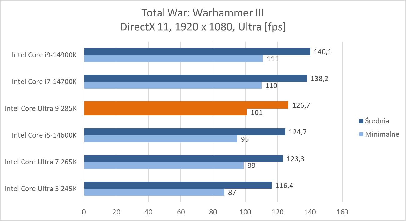 Jest to ostatnia część cyklu gier Total War producenta Creative Assembly. Gra garściami czerpie z uniwersum Warhammera, a do tego jest świetnym połączeniem RTS-a i gier turowych. Gry z serii Total War charakteryzują się wieloma dodatkami i gigantycznymi bitwami. Testy wykonaliśmy przy wykorzystaniu wbudowanego benchmarku mirrors of madness. Wybrane ustawienia to ultra. Benchmark zwraca średnią liczbę fps oraz minimalną i takie wartości znajdziecie na wykresach. Gra działa też pod kontrolą API DirectX 11.
