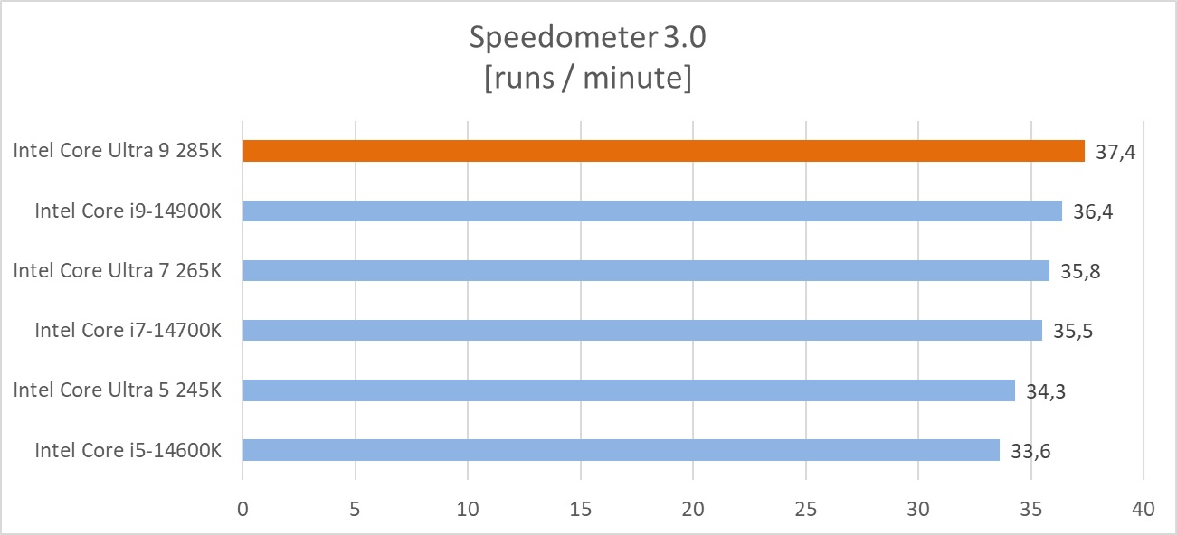 Speedometer 3.0 mierzy responsywność aplikacji internetowych. Jego plusem jest symulowanie działań wykonywanych przez użytkownika, co pozwoli na ocenienie wydajności różnych procesorów. Tutaj w testach wykorzystaliśmy przeglądarkę Google Chrome.