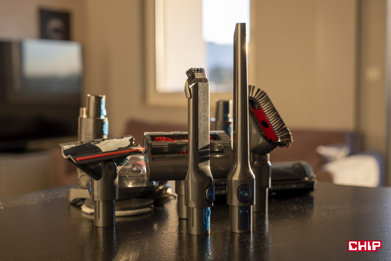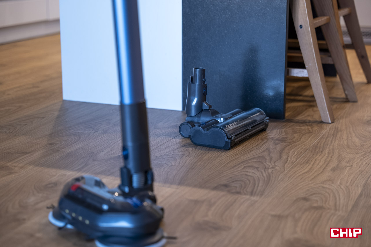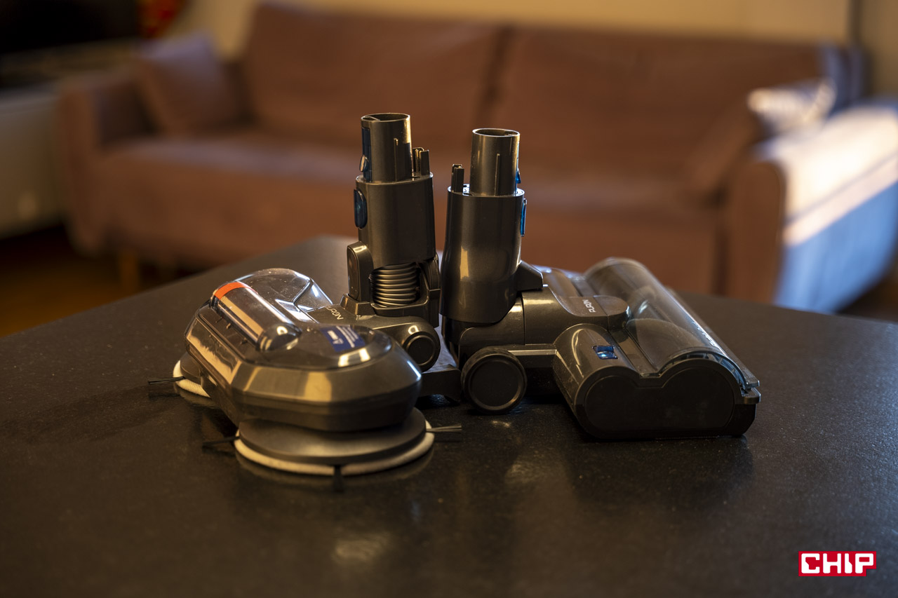 Zacznę od odkurzania, bo to temu rozwiązaniu poświęcona jest znaczna większość końcówek. Producent chwali się trzema trybami pracy z minimalną mocą na poziomie 8000 Pa oraz maksymalną na poziomie aż 28000 Pa. Trudno zmierzyć takie parametry, natomiast mam dobrą wiadomość – jeśli nie rozciągacie teleskopowej rury, bezproblemowo posprzątacie przy najniższym ustawieniu mocy. Sprzęt nie jest wtedy rekordowo cichy, ale nie czułem potrzeby korzystania ze słuchawek czy wytłumiania tego hałasu.