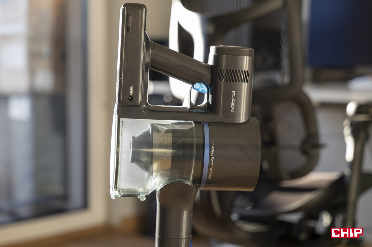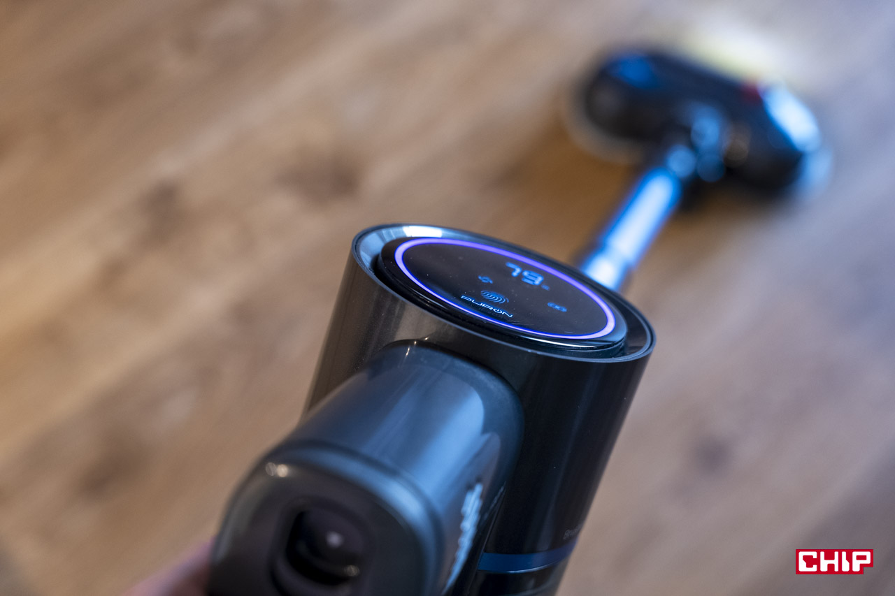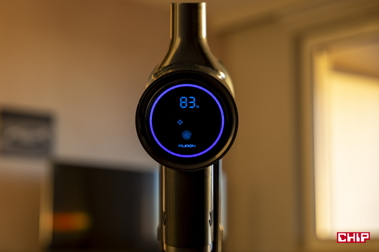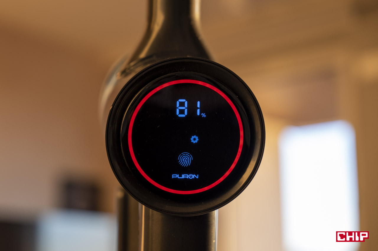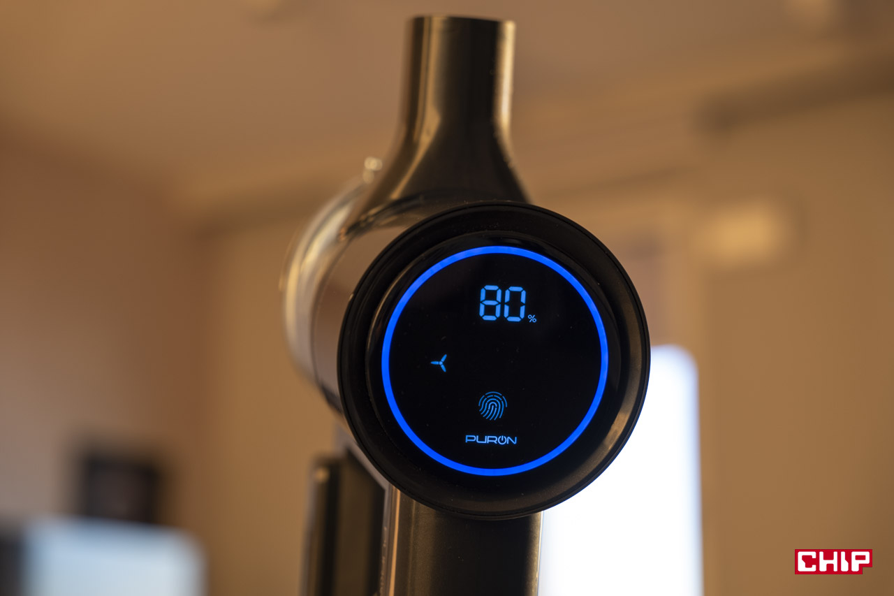 Ergonomia PURON PU50 Max Pro jest zadowalająca. Osobiście wolałbym, aby ekran znajdował się bardziej w polu widzenia przy nachyleniu odkurzacza, jednak nadal jesteśmy w stanie zobaczyć aktualny stan baterii. Aby przełączyć się między ustawieniem mocy sprzątania, skorzystamy z dotykowej płytki ulokowanej w miejscu linii papilarnych, a stosowna ikona wyświetla się powyżej. Odkurzacz trzyma się pewnie i, co ważne, nie wydaje się przesadnie ciężki, niezależnie od założonej końcówki. Światła LED doświetlają okolice odkurzacza i pokazują też, gdzie warto byłoby go jeszcze poprowadzić.